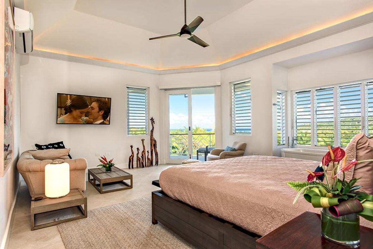 Its architecture defines spacious bedroom suites, a long furnished verandah perfect for dining outdoors, a striking red inside dining room and large family play room ~ all enhanced by overviews of the long private pool, acres of landscaped lawns and breathtaking views of the deep blue Caribbean Sea.