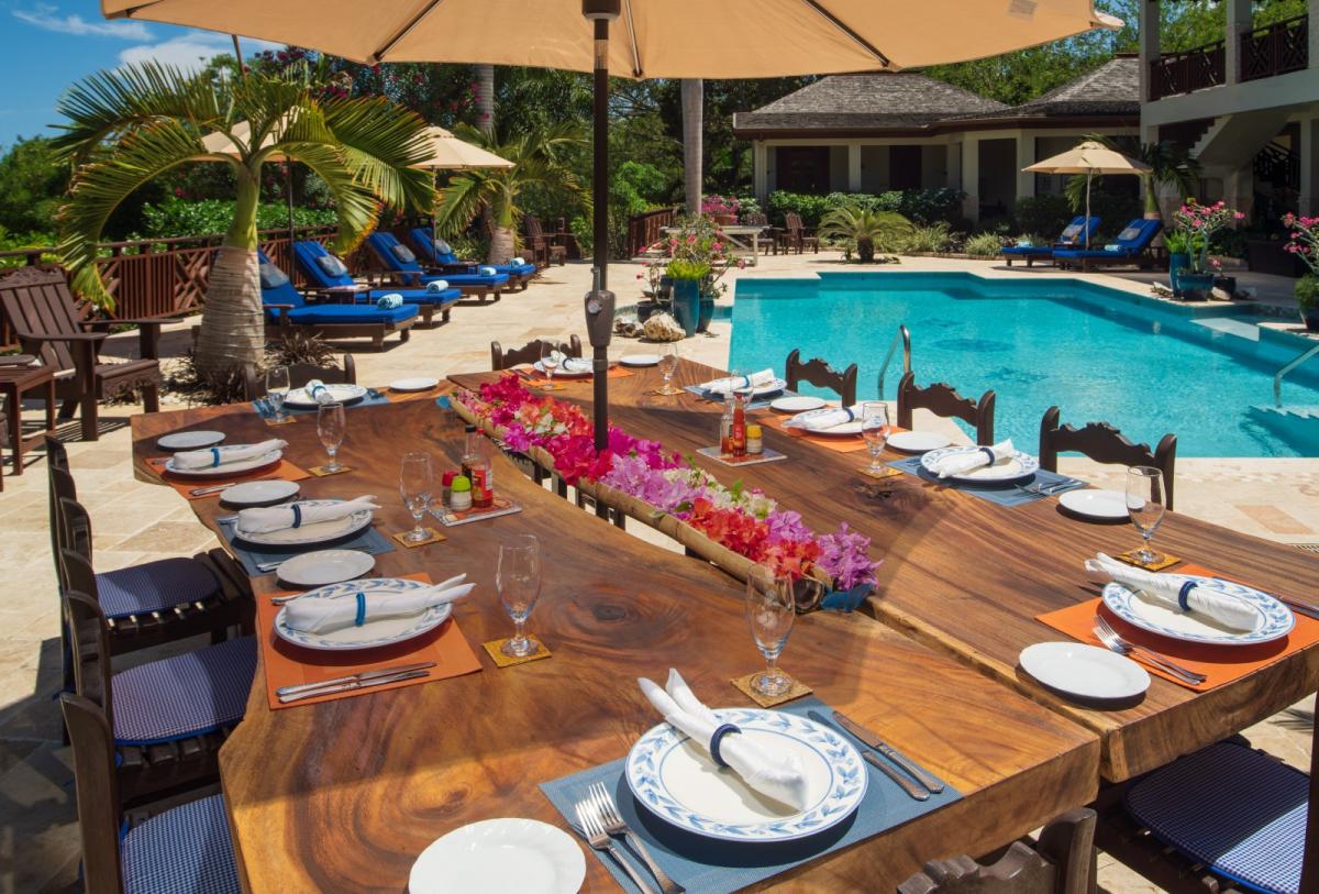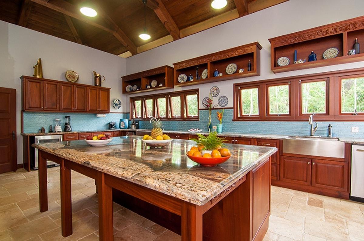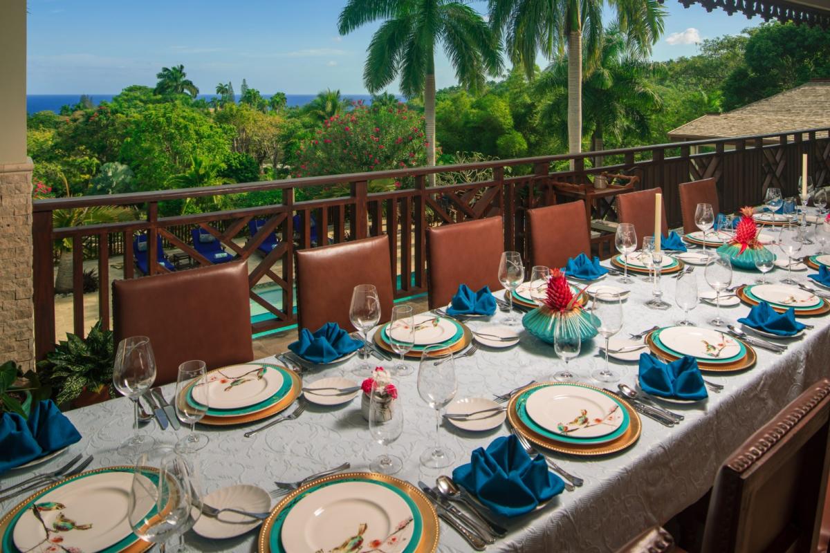 The spacious living/dining area welcomes you with interesting artwork, intimate and inviting seating and doors that fold away to allow in refreshing breezes from the adjoining upper veranda. In addition to the formal indoor dining, the verandah provides for open air meals and boasts a cozy seating area for morning coffee or moonlit after dinner cocktails. Dinner around the pool on the lower level is an option worth exploring on the days when no one wants to be indoors at all! Chef Paul is one of Tryall Club's best chefs. The spacious kitchen with its 9ft granite island, local custom made mahogany cabinets and modern stainless steel appliances, stands ready for the chef to prepare mouthwatering meals for Jubilation’s guests, all served table side by our cheerful butler.