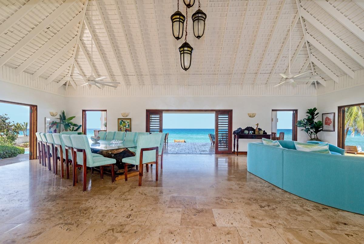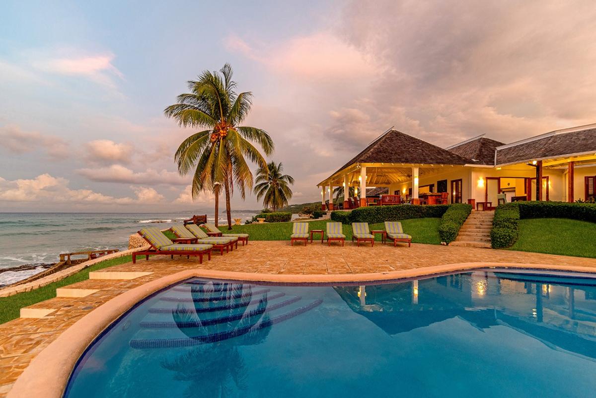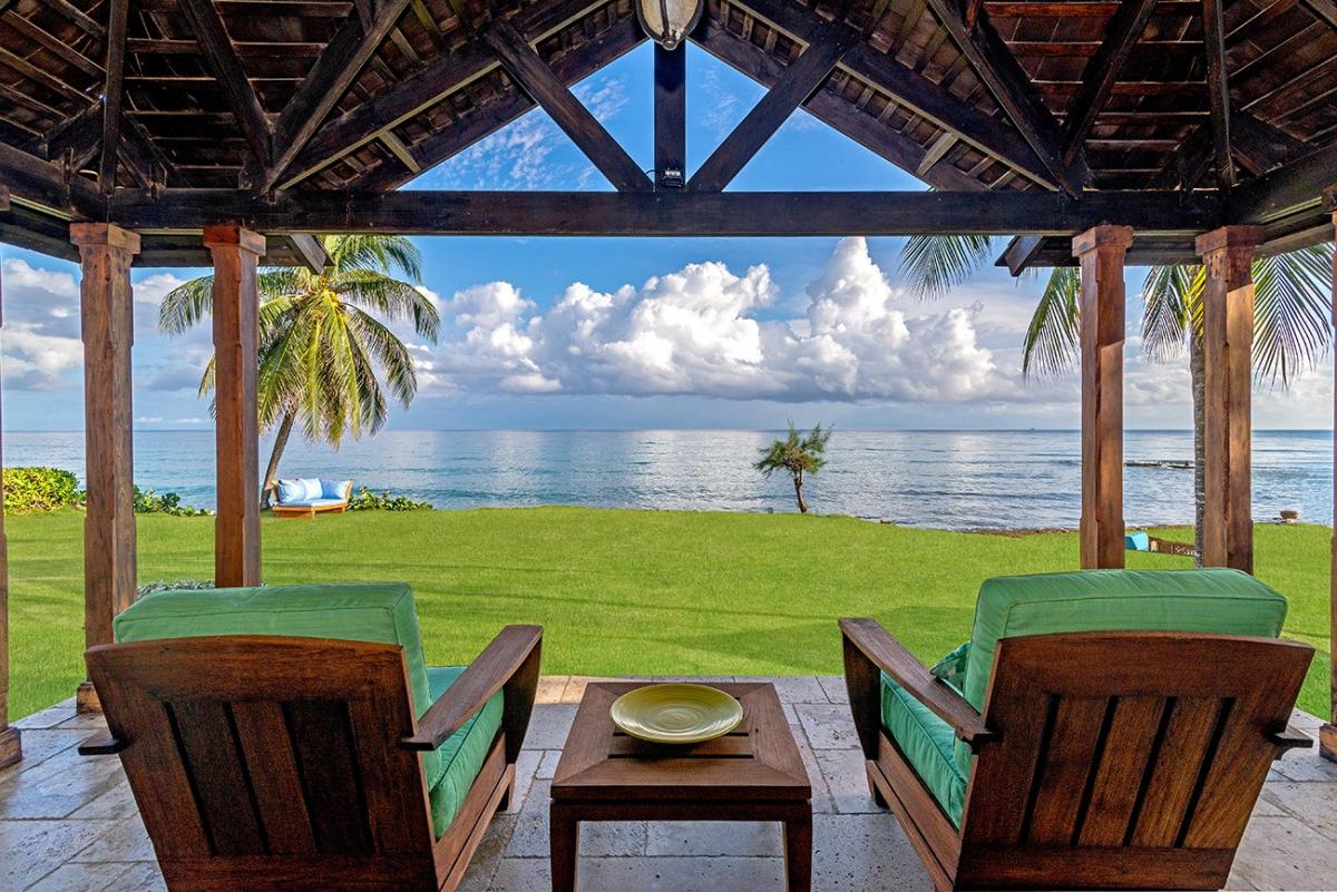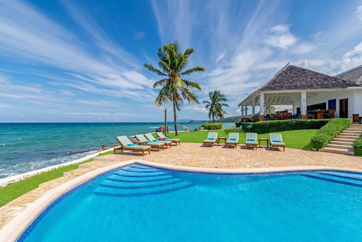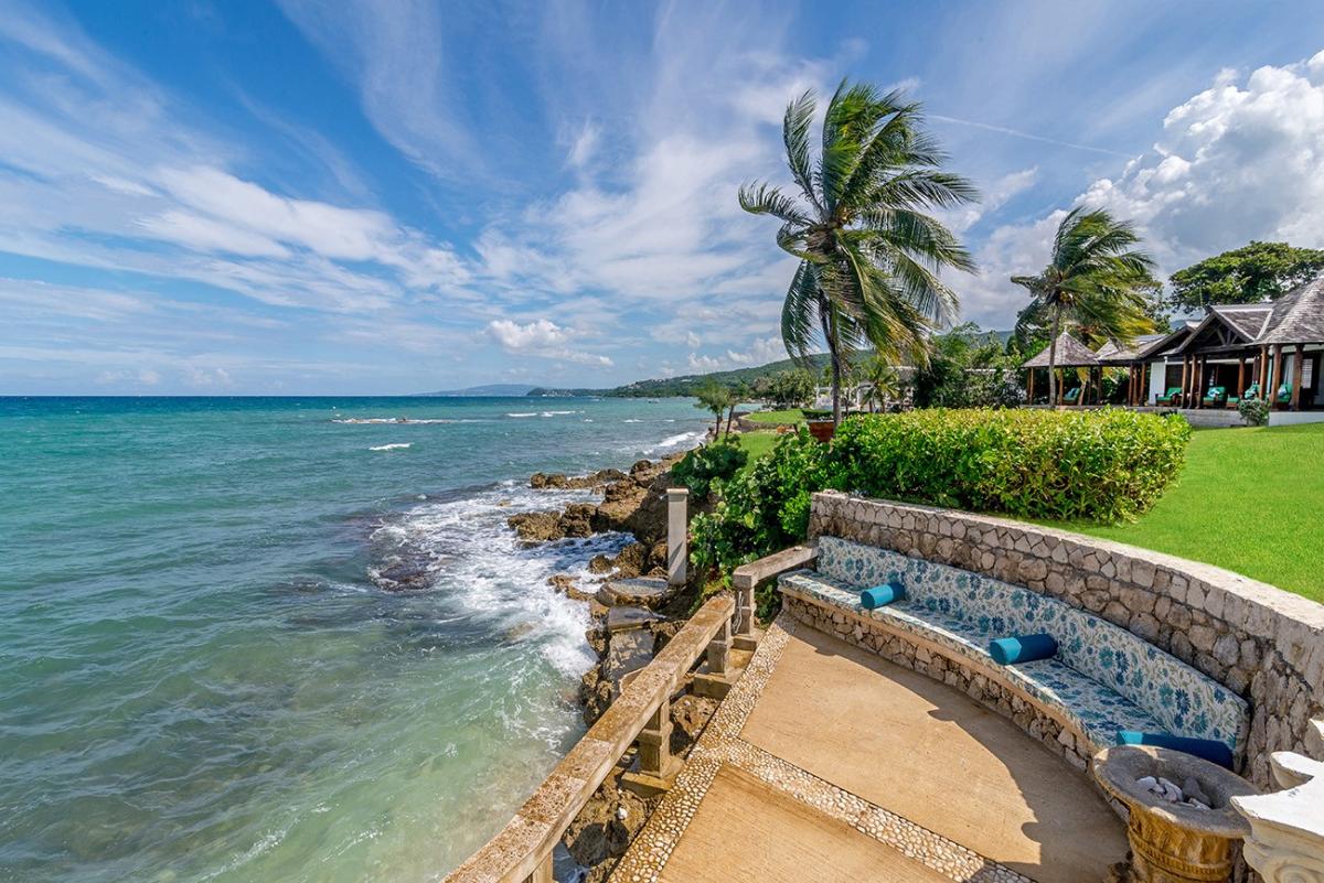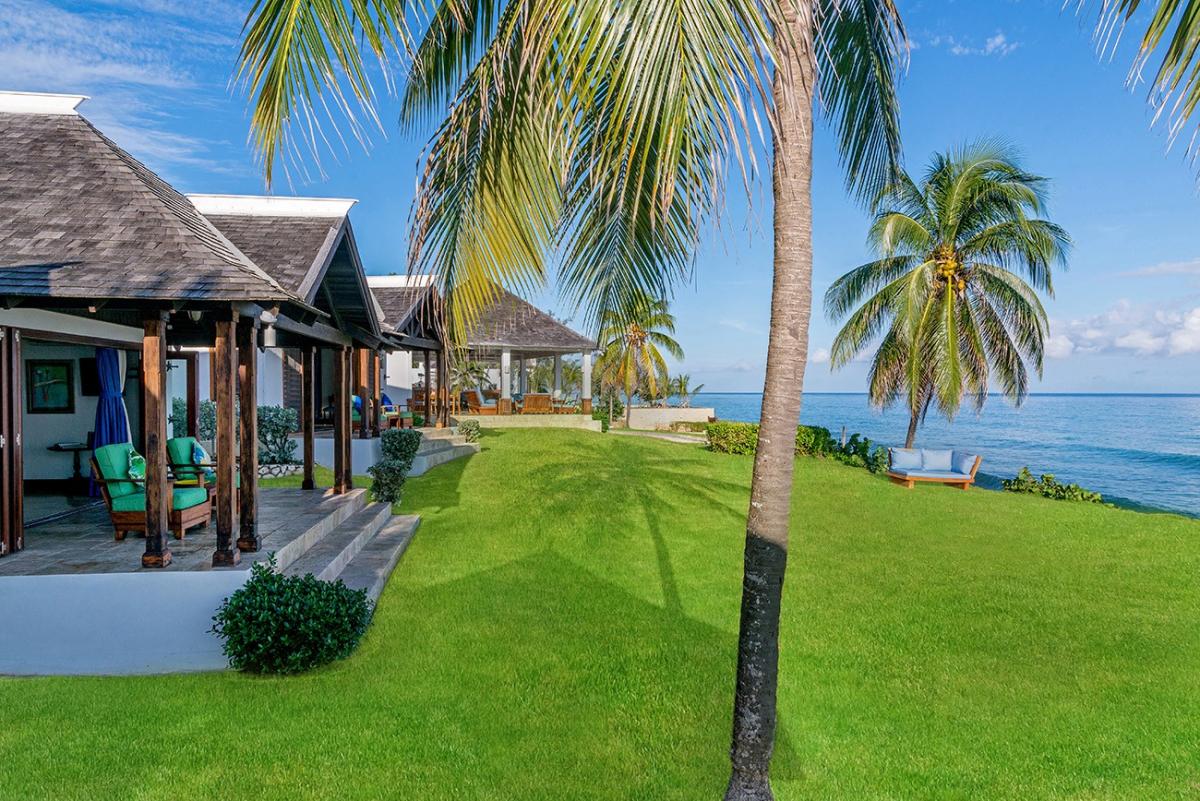 A sprawling double lot directly on the Caribbean Sea is among the most stunning waterfront locations in all Jamaica. This is the rarefied site of the private villa named Karma Bay. Six bedrooms, multiple gazebos and sitting areas, and a beautiful pool with a broad marble terrace are bordered by a wide soft lawn, coconut palms and a blue view that stretches to infinity. The vista is so expansive that it captures both the sunrise and sunset skies.