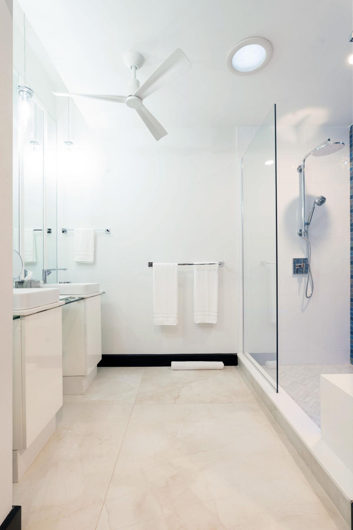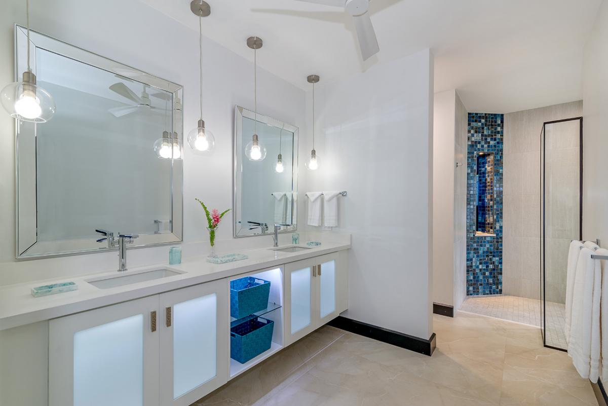 Bedroom 2: This room is located on the lower level and is equipped with two queen-sized beds, a 55" flat-screen television with cable access, Sonos wireless speakers, a safe, a telephone with intercom, and an ensuite bathroom with a walk-in shower, a fan, double vanities, a blow dryer, and bathrobes. Bedroom 2 also has doors to an ocean view.