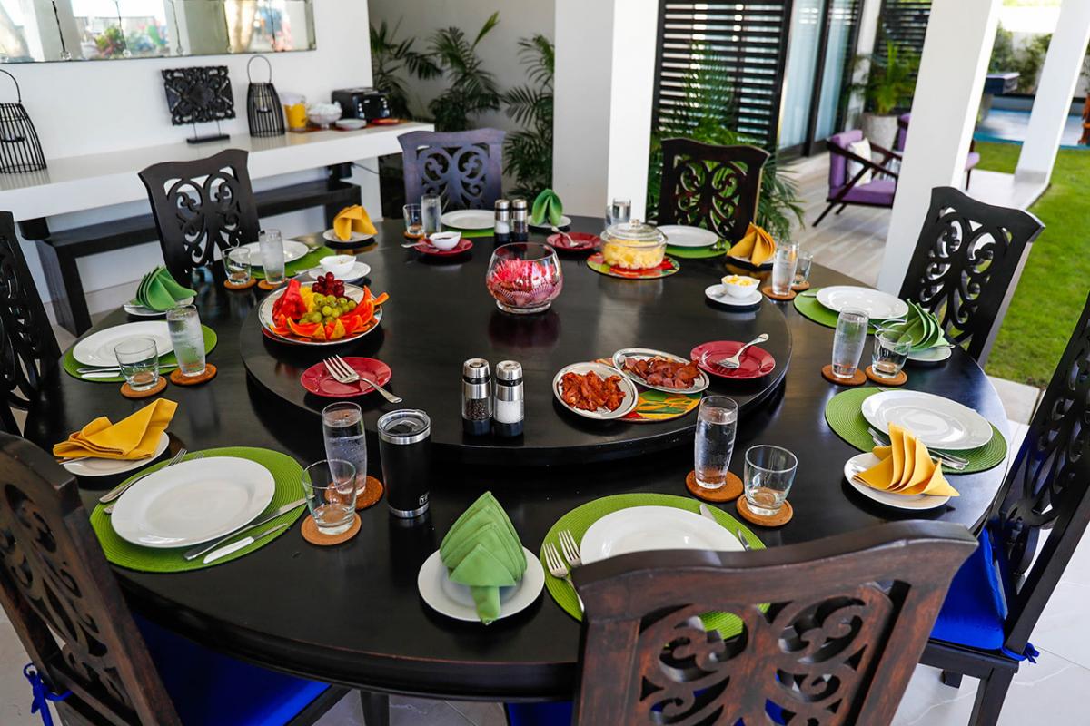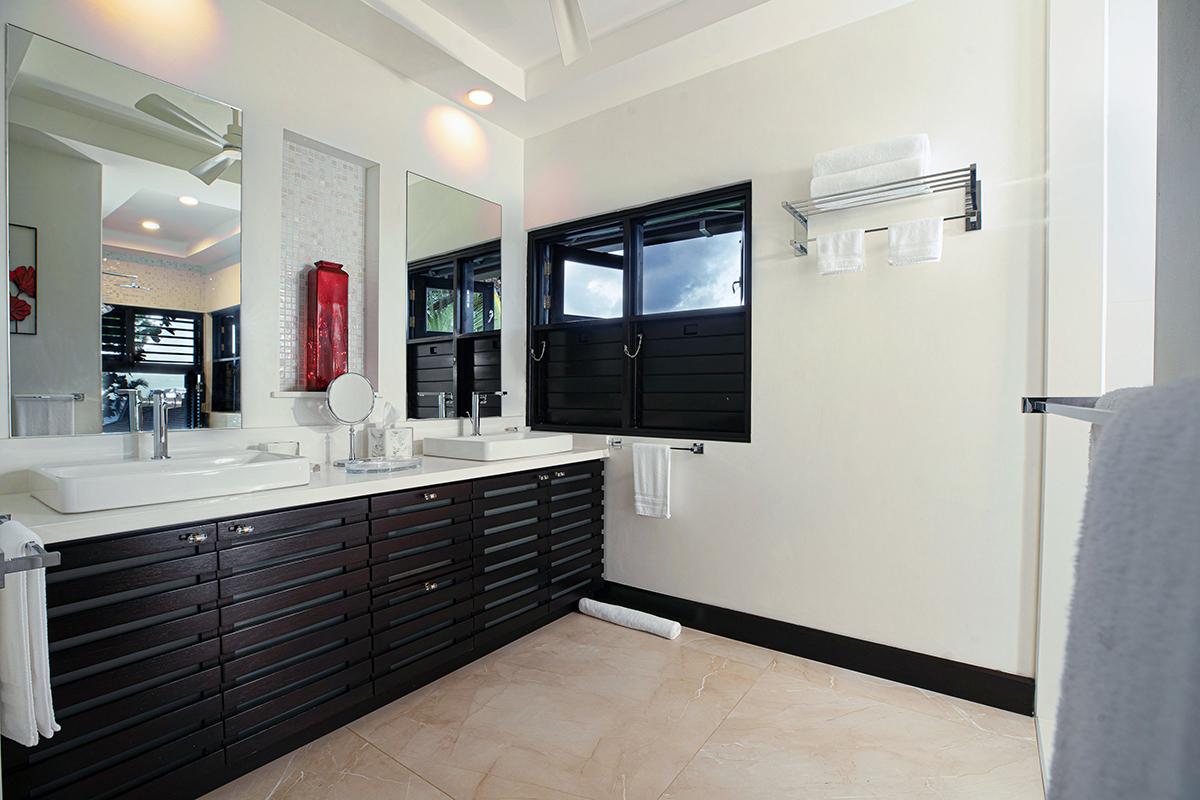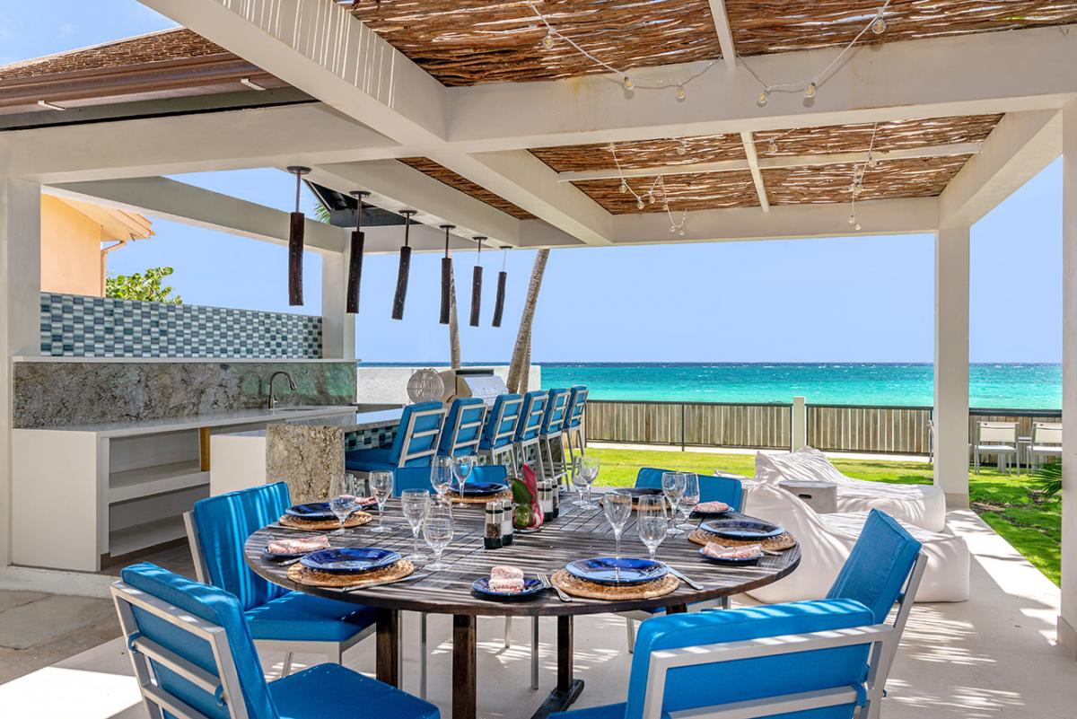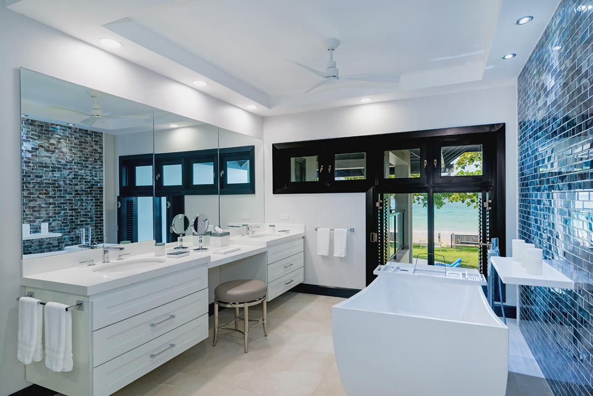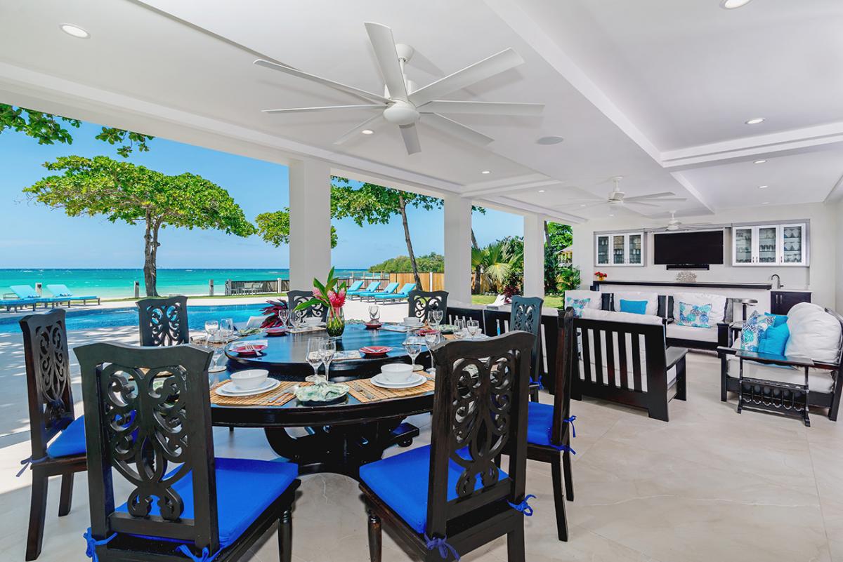 From the state-of-the-art tile, stainless steel and granite kitchen, home-cooked meals are served in the inside dining room or on the al fresco verandah. Two Swiss-made coffee machines provide all-day on-demand rich fresh-ground Blue Mountain coffee. Signature drinks and hors doeuvres are offered each evening around the verandah bar. As a special treat, the butler will hire a mento band and plan a torchlight beach party with jerk chicken and pork, tenderloin, kabobs, or fresh fish or lobster served sizzling from the outdoor grill.