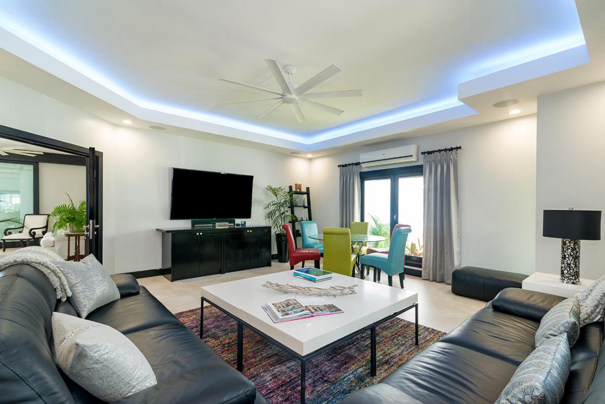 Bedroom 1: This room is located on the lower level and is equipped with a king-sized bed, a 65" flat-screen television with cable access, Sonos wireless speakers, a safe, a telephone with intercom, and an ensuite bathroom and garden with a walk-in shower with double shower heads, a soak-in tub, a fan, double vanities, a blow dryer, and bathrobes. Bedroom 1 also has doors to an ocean view terrace.