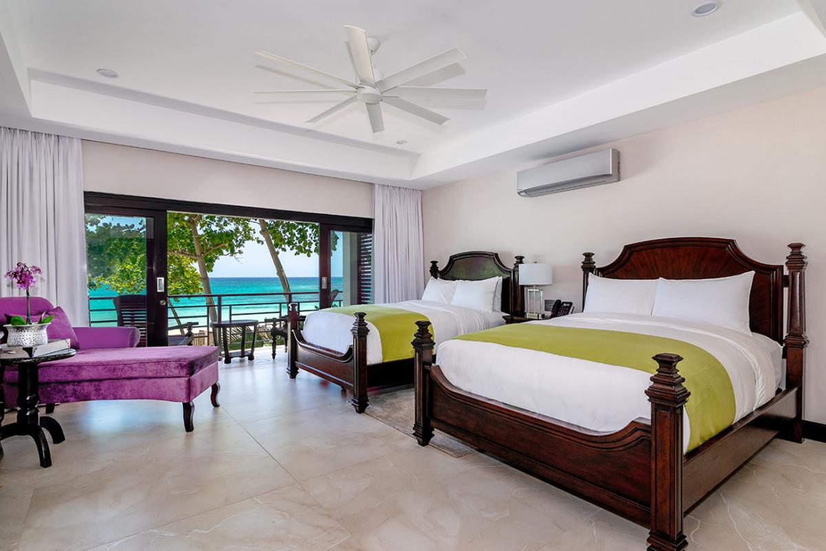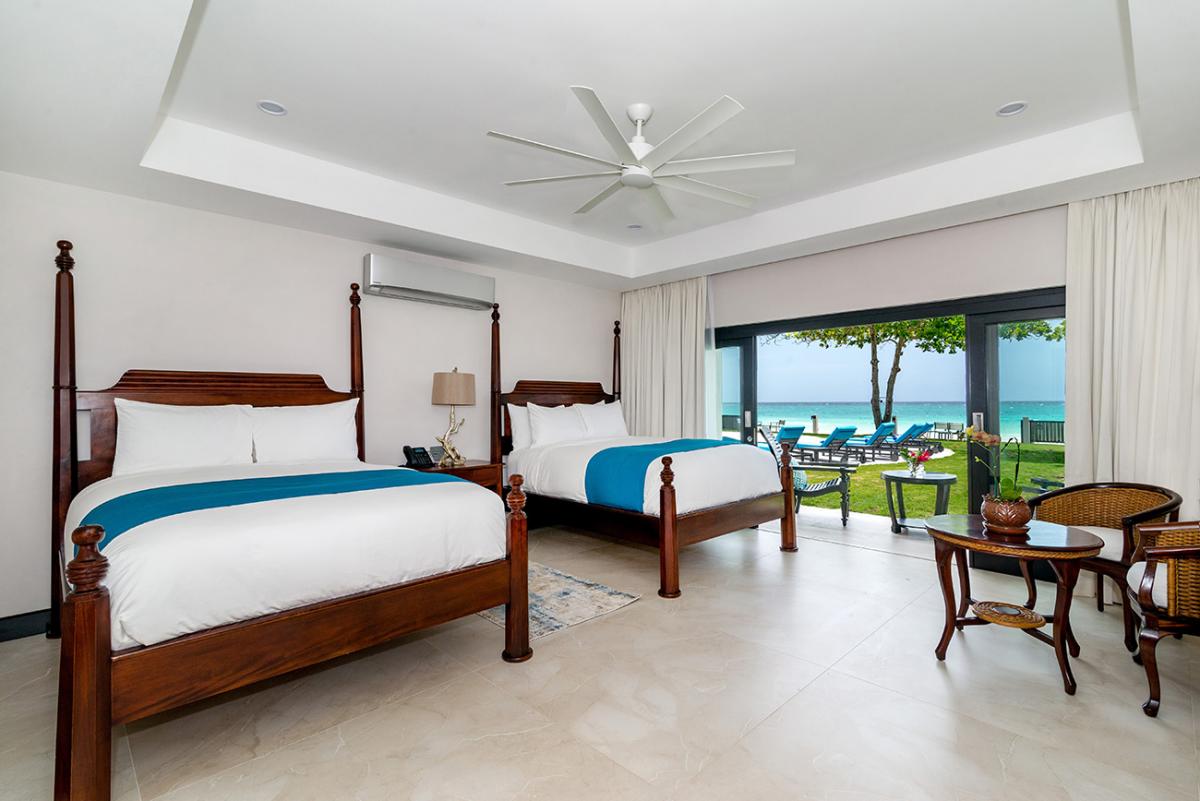 Bedroom 7: This room is located on the upper level and is equipped with two queen-sized beds, a 55" flat-screen television with cable access, Sonos wireless speakers, a safe, a telephone with intercom, and an ensuite bathroom with a walk-in shower, a fan, double vanities, a blow dryer, and bathrobes. Bedroom 7 also has an ocean-view balcony.