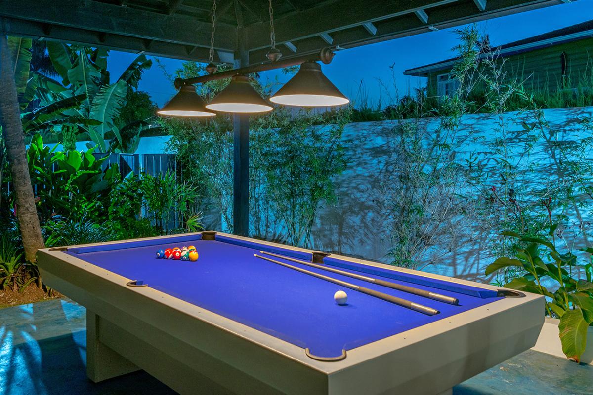 A long fence privatizes the pool and lawn. The fence is designed to be rolled open each morning to reveal a gorgeous all-day panorama of the beach and blue sea just steps across the soft grassy lawn. Day and night, the sounds of the sea echo the romance of this idyllic location.