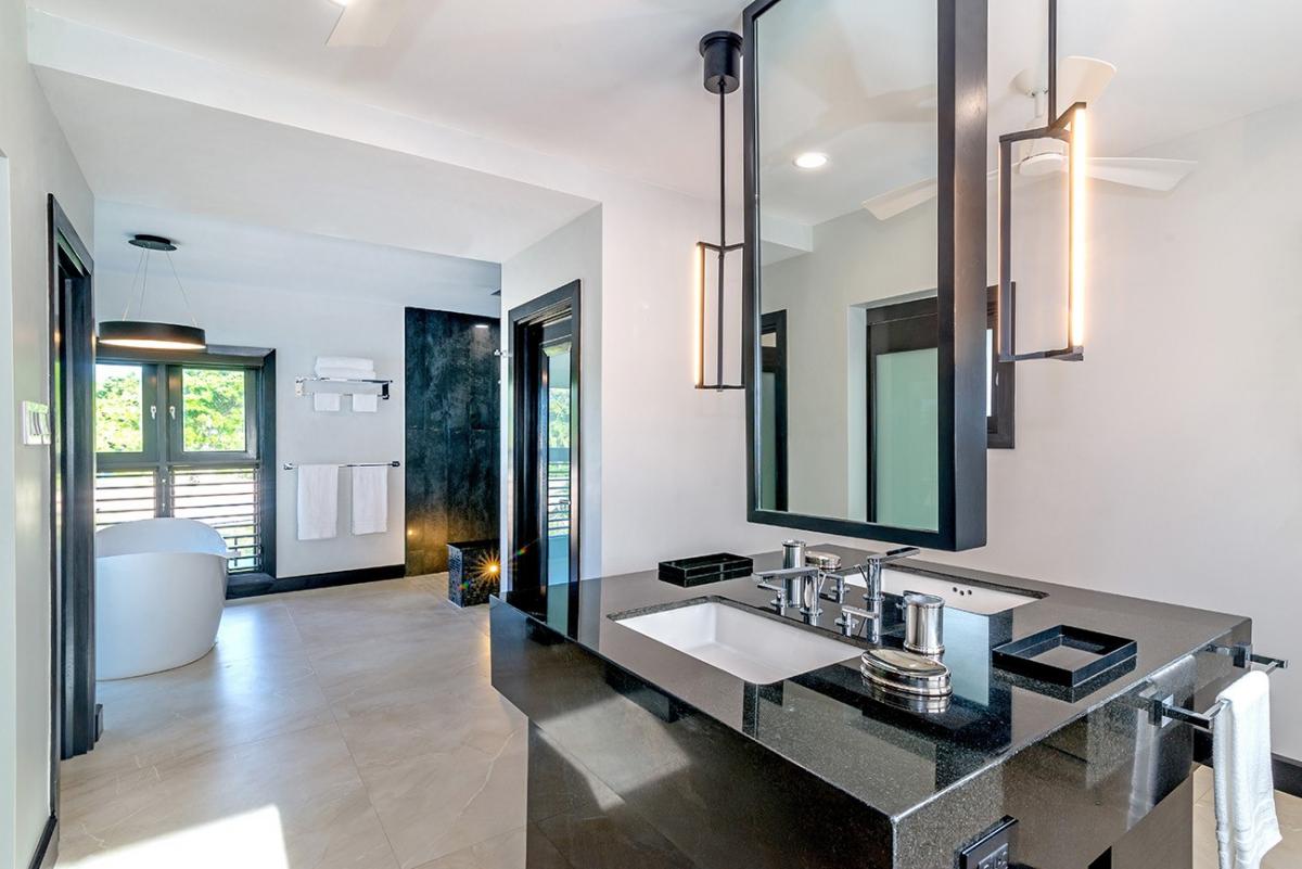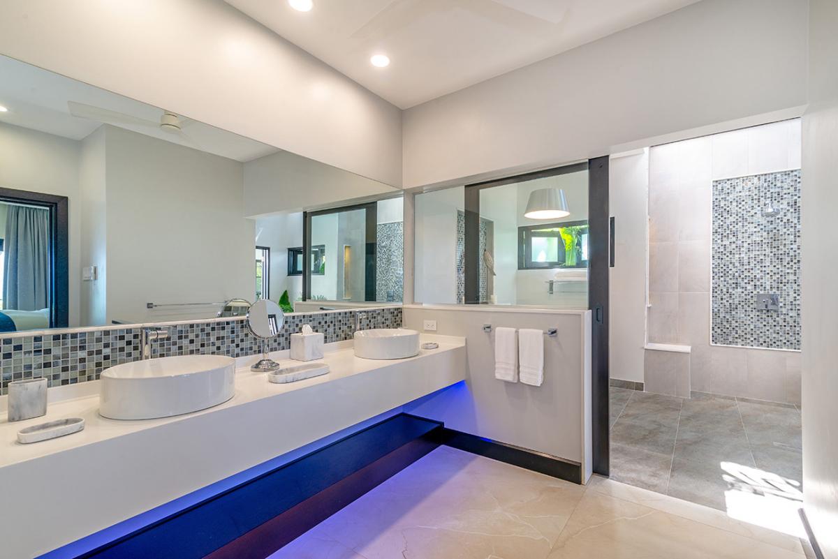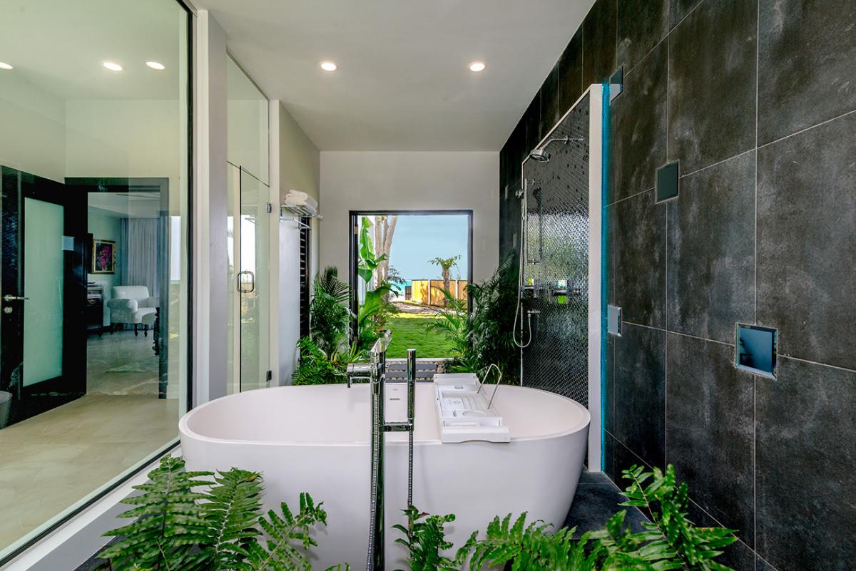 Bedroom 3: This room is located on the lower level and is equipped with a king-sized bed, a 65" flat-screen television with cable access, Sonos wireless speakers, a safe, a telephone with intercom, and an ensuite bathroom and atrium garden with walk-in shower with double shower heads, a soaking tub, a fan, double vanities, a blow dryer, and bathrobes. Bedroom 3 also has doors to an ocean view terrace.