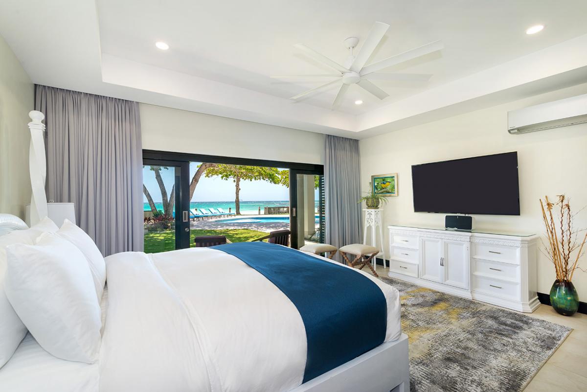 Bedroom 6: This room is located on the upper level and is equipped with a king-sized bed, a 65" flat-screen television with cable access, Sonos wireless speakers, a safe, a telephone with intercom, and an ensuite bathroom with a walk-in shower with double shower heads, a soak-in tub, a fan, double vanities, a blow dryer, and bathrobes. Bedroom 6 has doors to an ocean-view balcony.