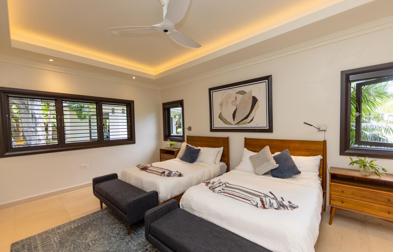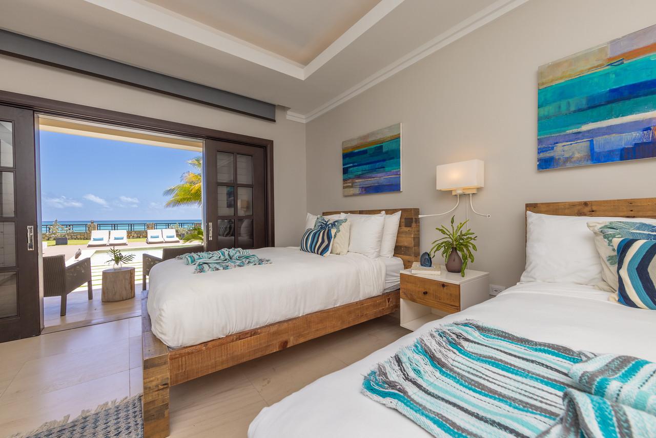 Bedroom 4: This room is located on the upper level. Bedroom 4 is equipped with two queen-sized beds, air conditioning, a ceiling fan, automated window black-out blinds, a flat-screen TV with cable access, and an ensuite bathroom with a walk-in shower, a single vanity, a blow dryer, and other bathroom amenities. There are also French doors to an ocean-view balcony.