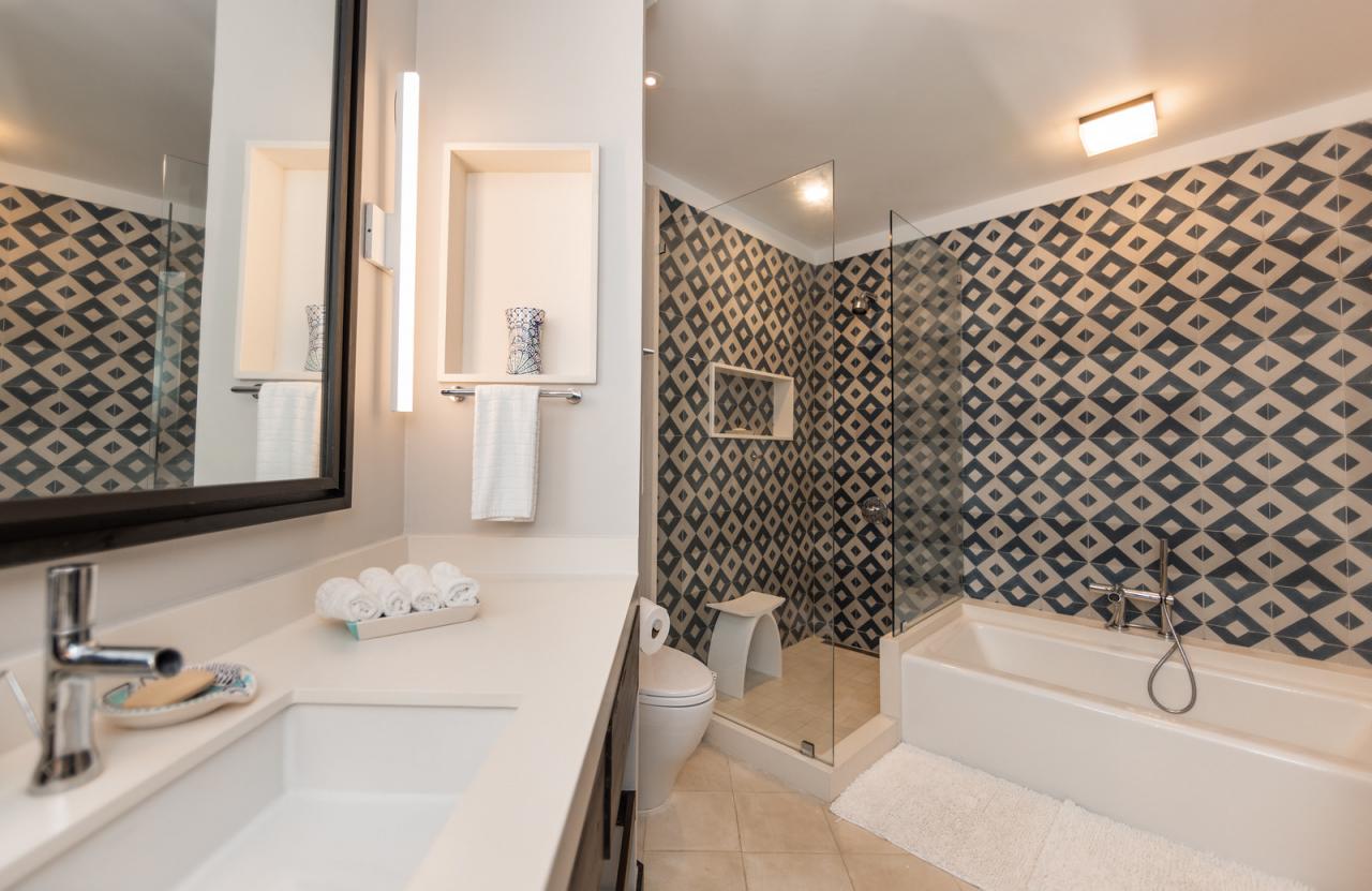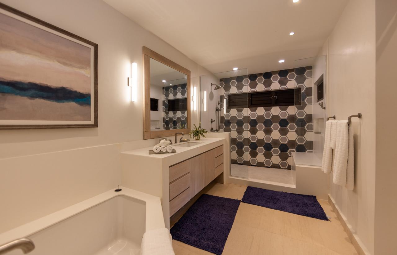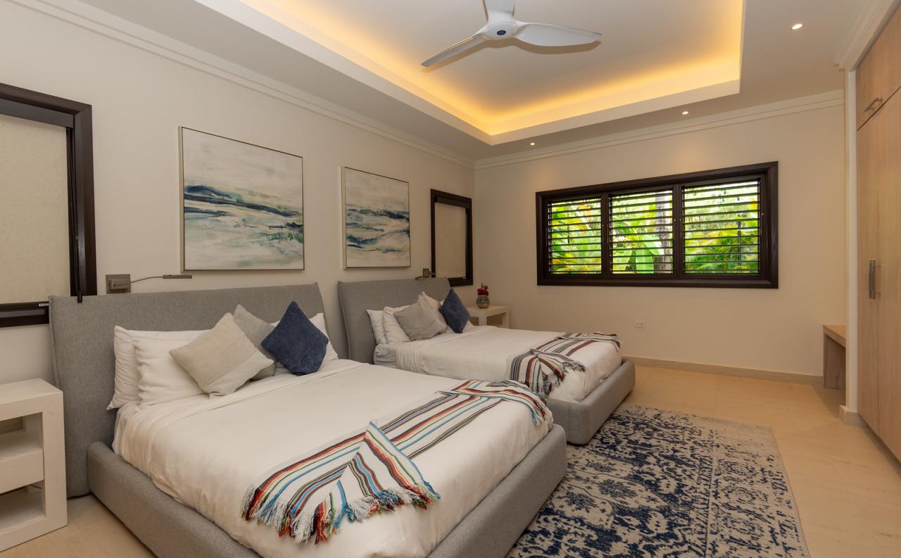 Bedroom 2: This room is located on the lower level. Bedroom 2 is equipped with two queen-sized beds, air conditioning, a ceiling fan, automated window black-out blinds, a flat-screen TV with cable access, and an ensuite bathroom with a walk-in shower, bathtub, double vanities, a blow dryer, and other bathroom amenities. There are also French doors to the ocean-view terrace.