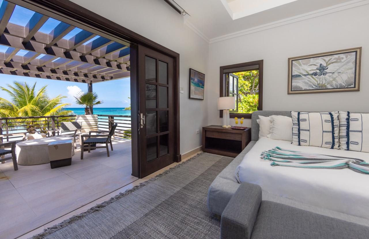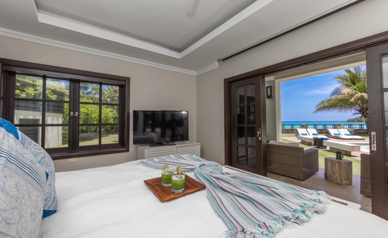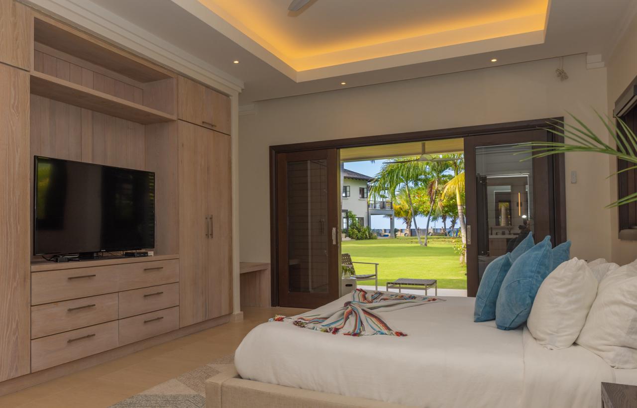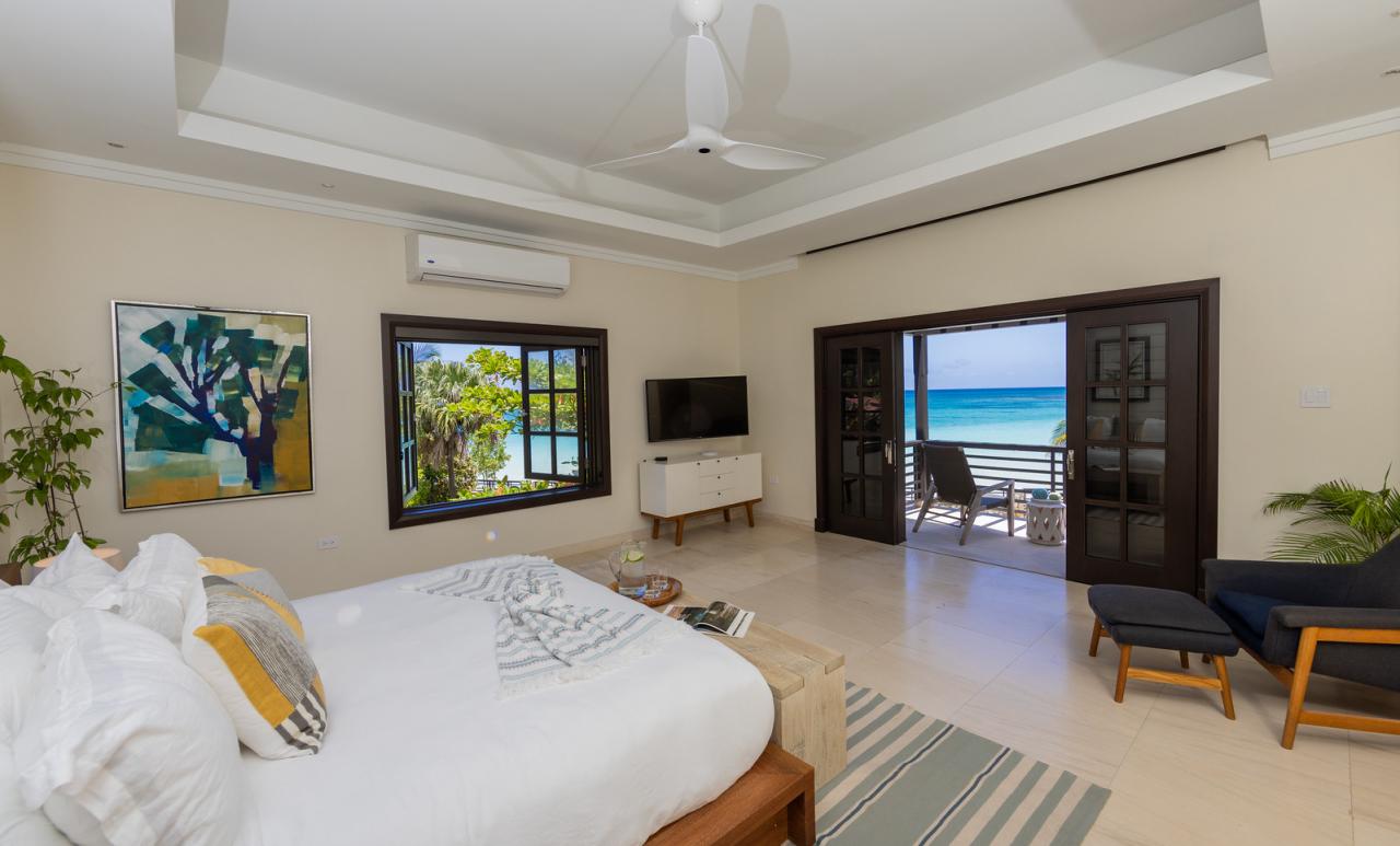 Bedroom 6: This room is equipped with a king-sized bed, air conditioning, a ceiling fan, automated window black-out blinds, a flat-screen TV with cable access, and an ensuite bathroom with a walk-in shower, double vanities, a blow dryer, and other bathroom amenities. There are also doors to an ocean-view terrace.
