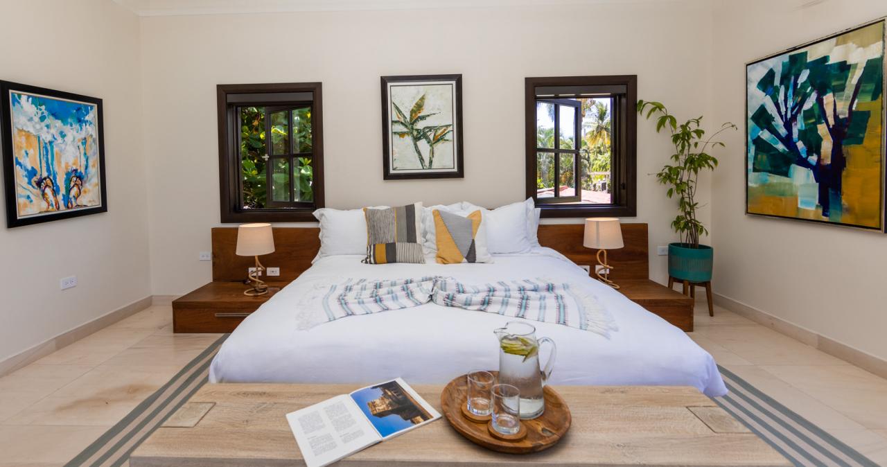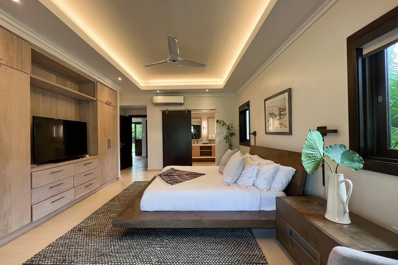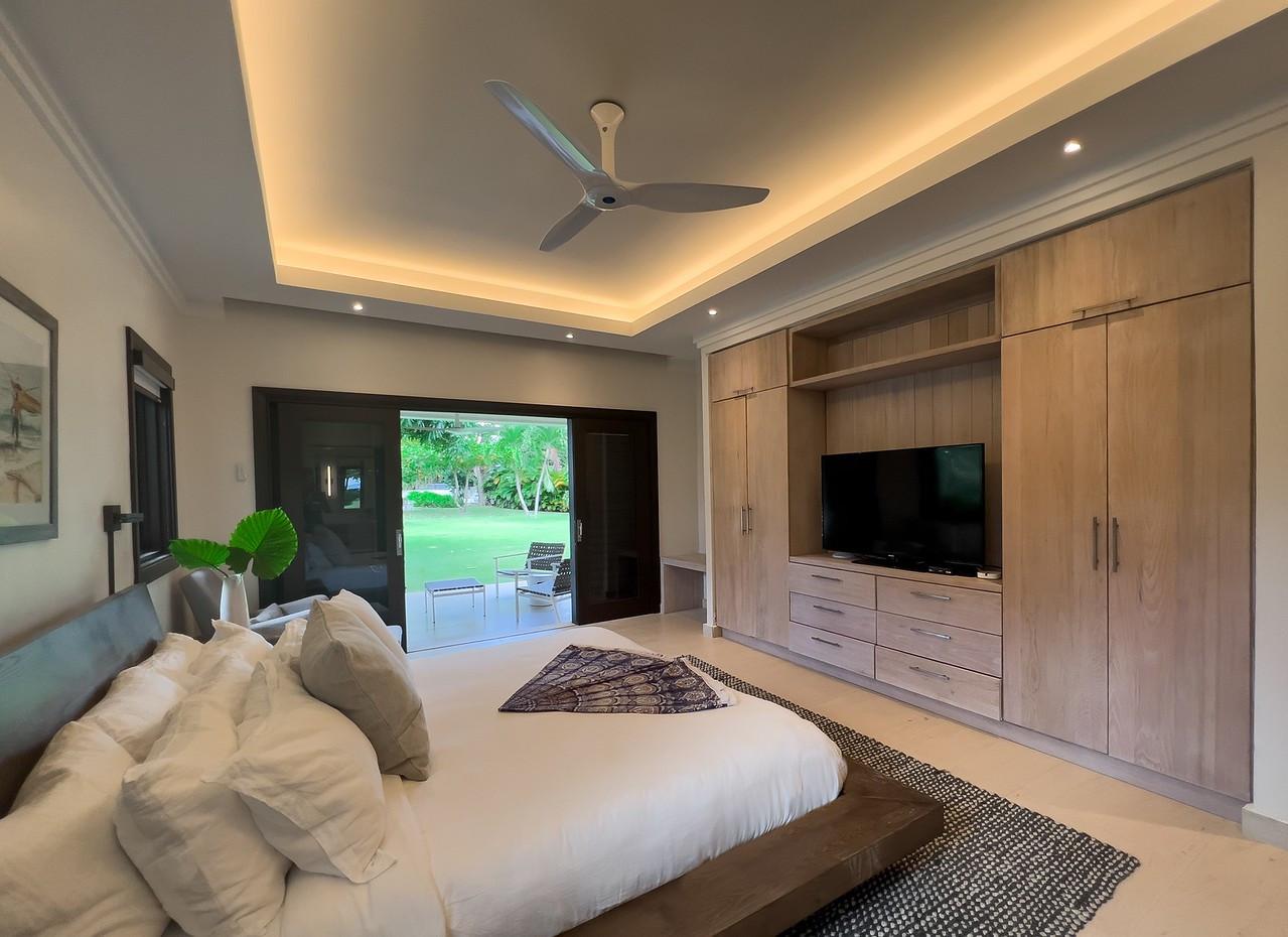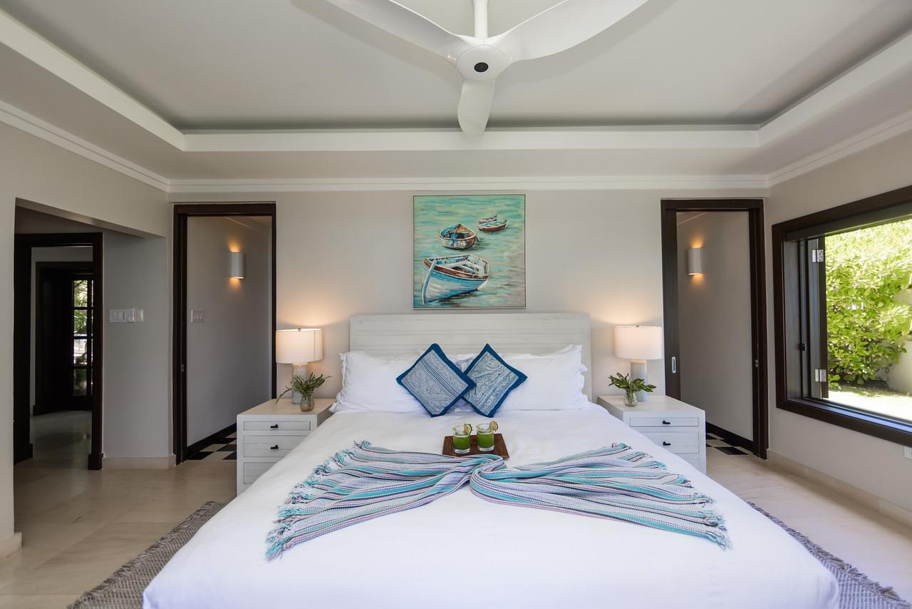 Bedroom 6: This room is equipped with a king-sized bed, air conditioning, a ceiling fan, automated window black-out blinds, a flat-screen TV with cable access, and an ensuite bathroom with a walk-in shower, double vanities, a blow dryer, and other bathroom amenities. There are also doors to an ocean-view terrace.