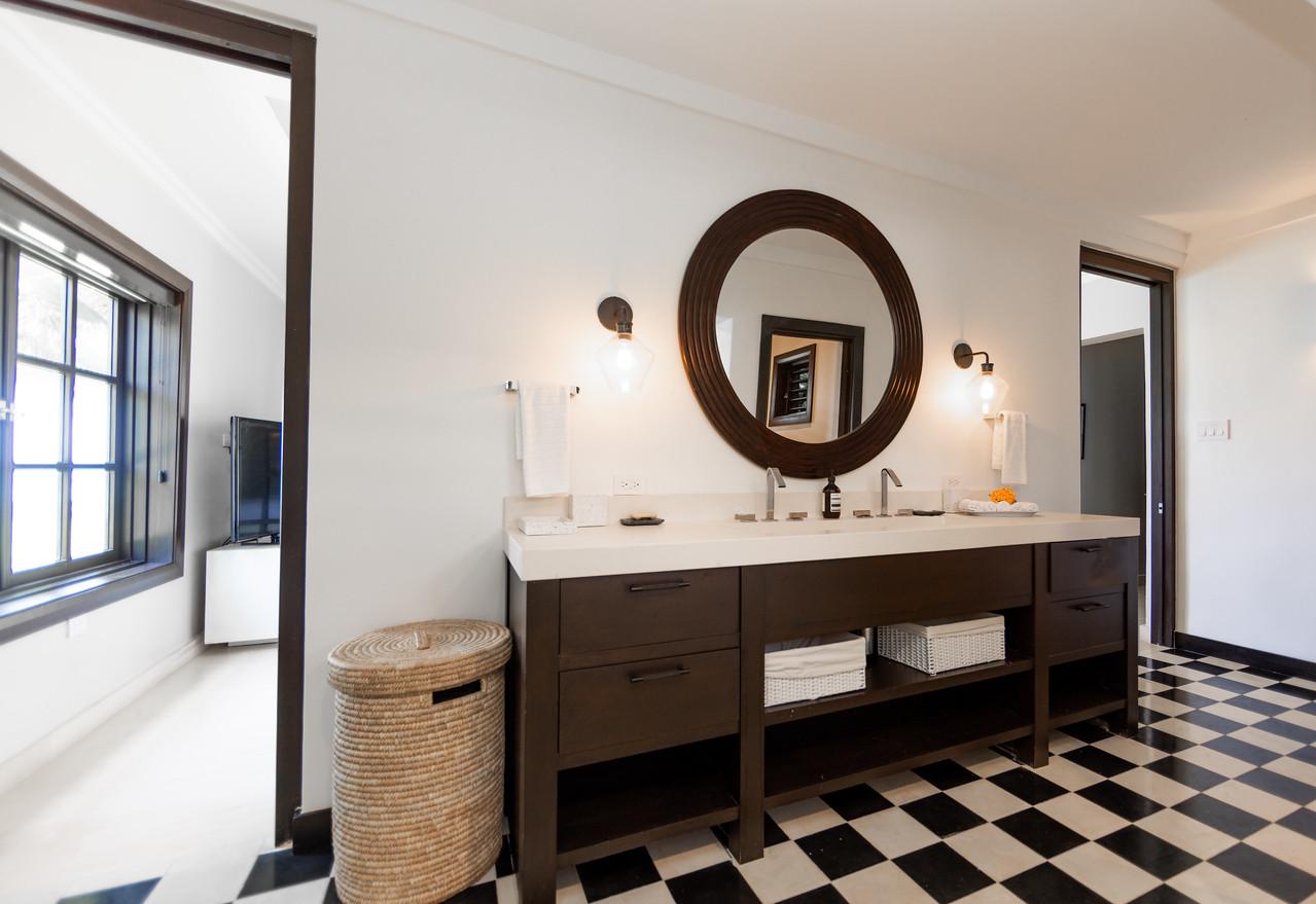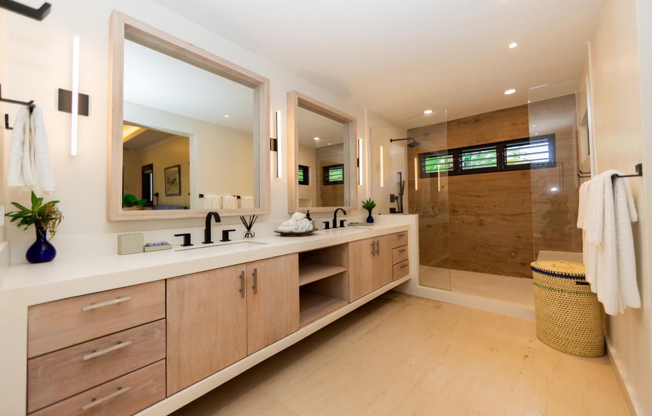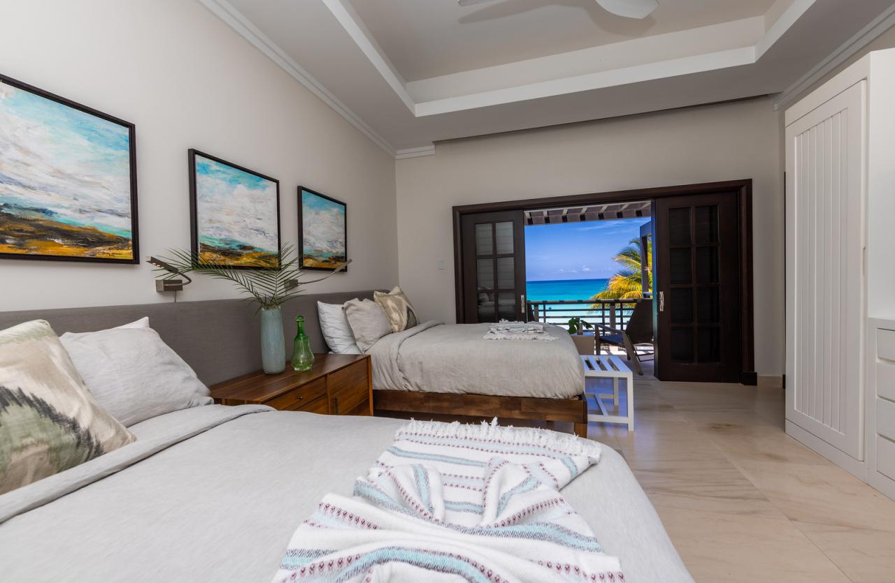 Bedroom 3: This room is located on the upper level. Bedroom 3 is equipped with a king-sized bed, air conditioning, a ceiling fan, automated window black-out blinds, a flat-screen TV with cable access, and an ensuite bathroom with a walk-in shower, double vanities, a blow dryer, and other bathroom amenities. There are also French doors to an ocean-view balcony.