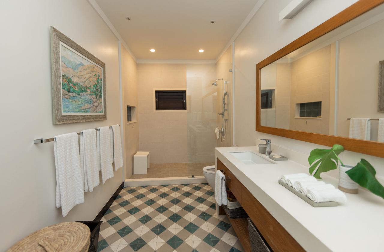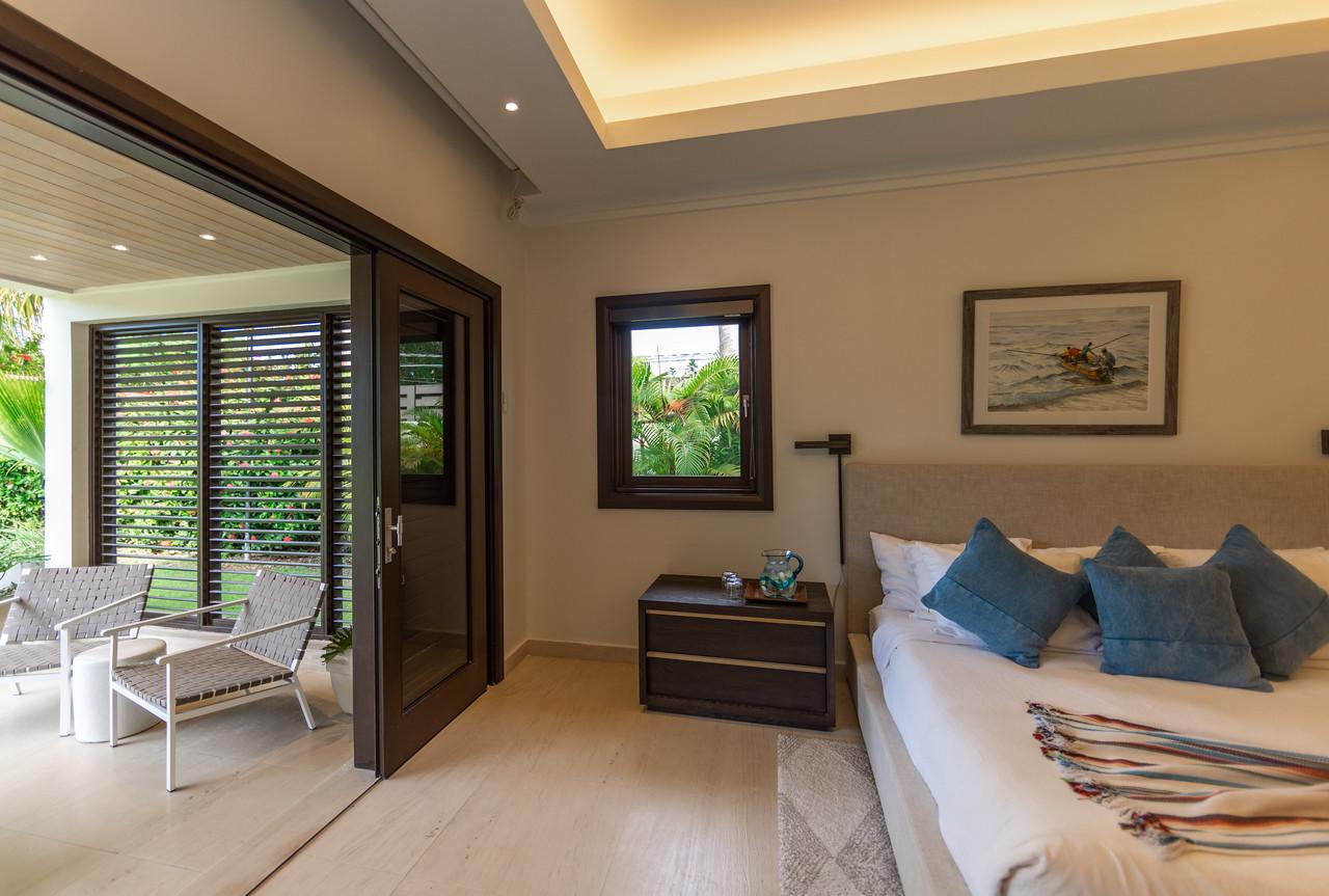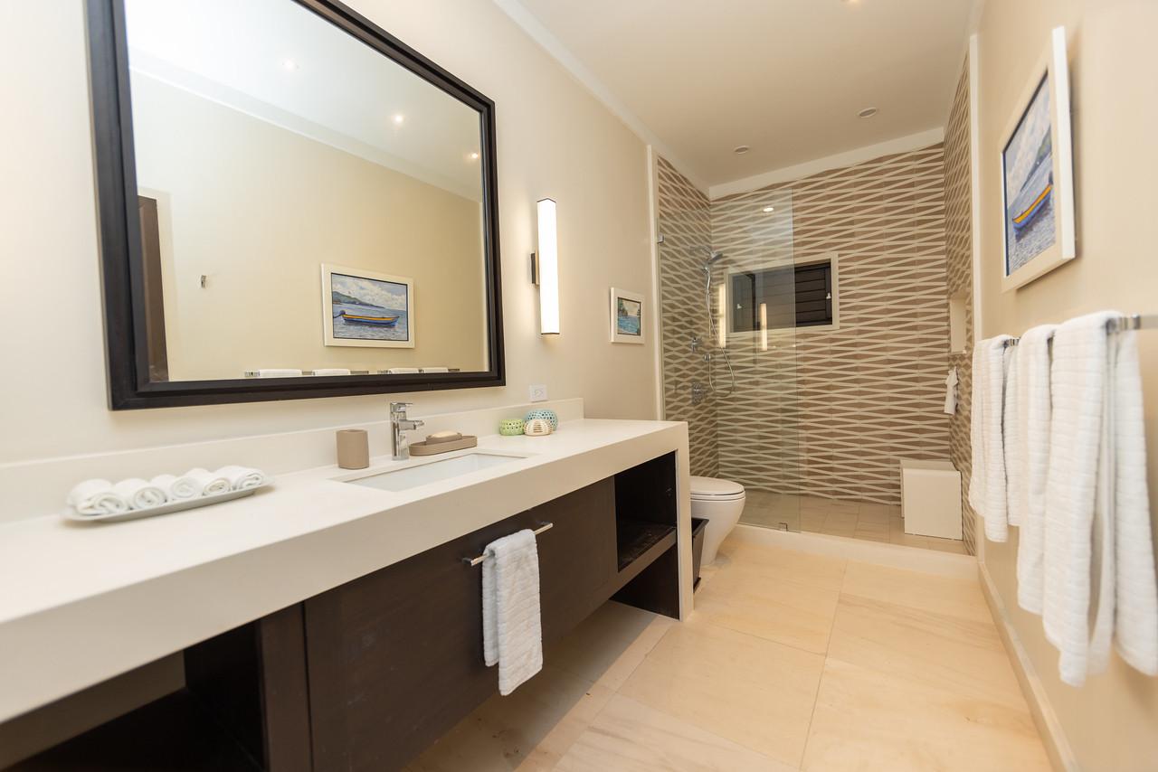 Bedroom 1: This room is located on the lower level. Bedroom 1 is equipped with a king-sized bed, air conditioning, a ceiling fan, automated window black-out blinds, a flat-screen TV with cable access, and an ensuite bathroom with a walk-in shower, a vanity, a separate toilet, a blow dryer, and other bathroom amenities. There are also French doors to an ocean-view terrace.