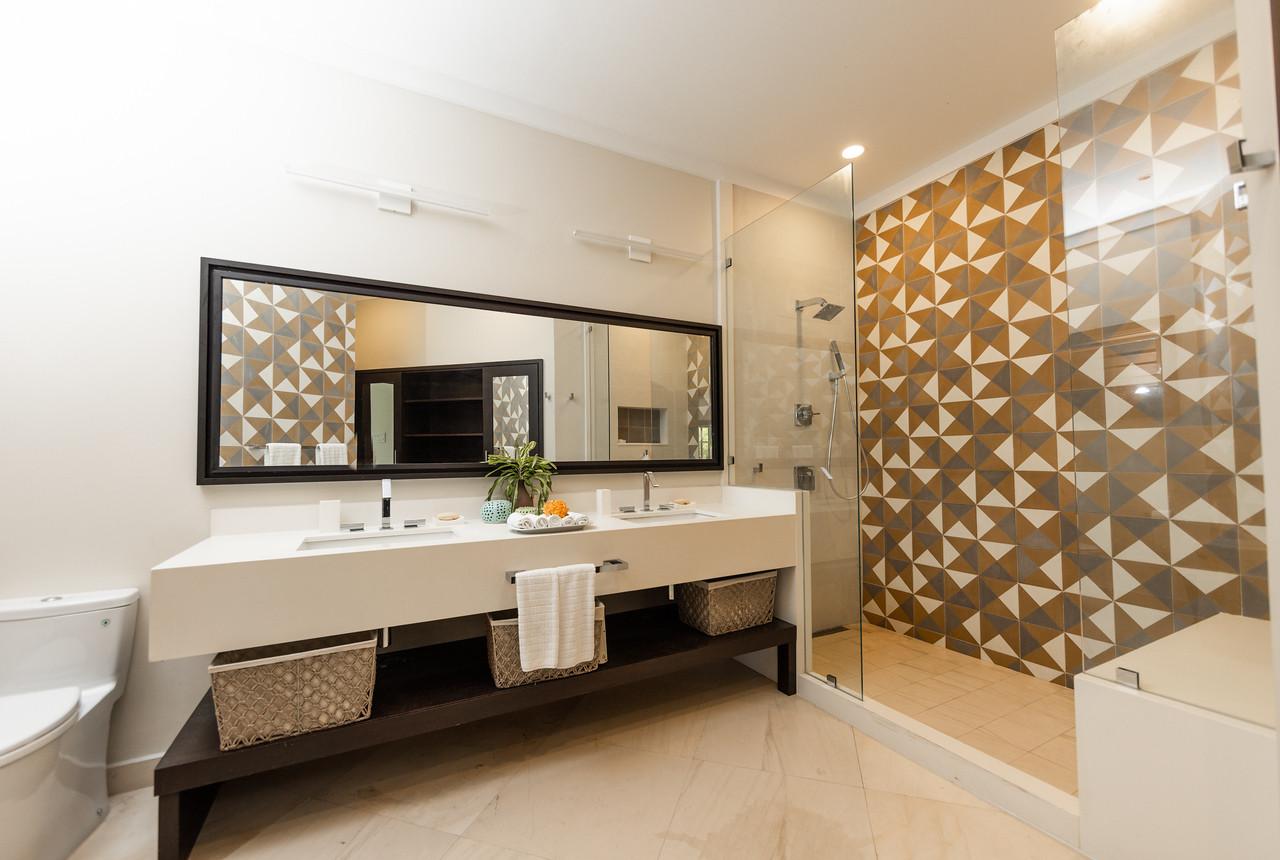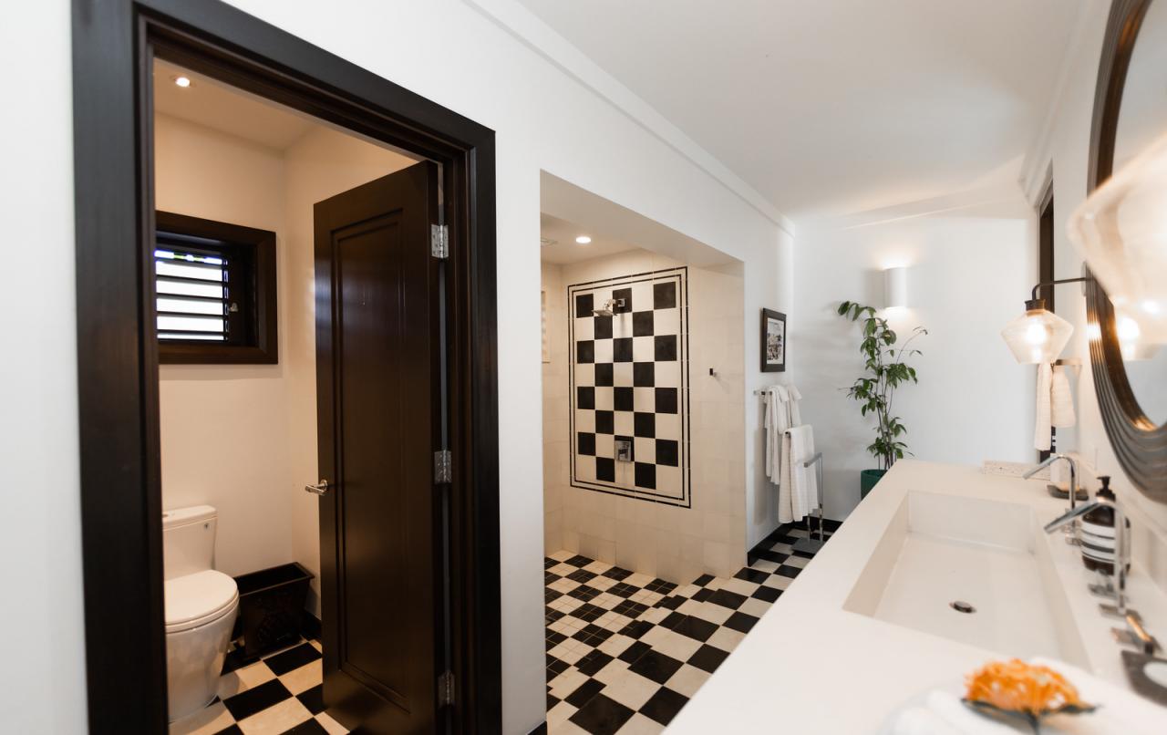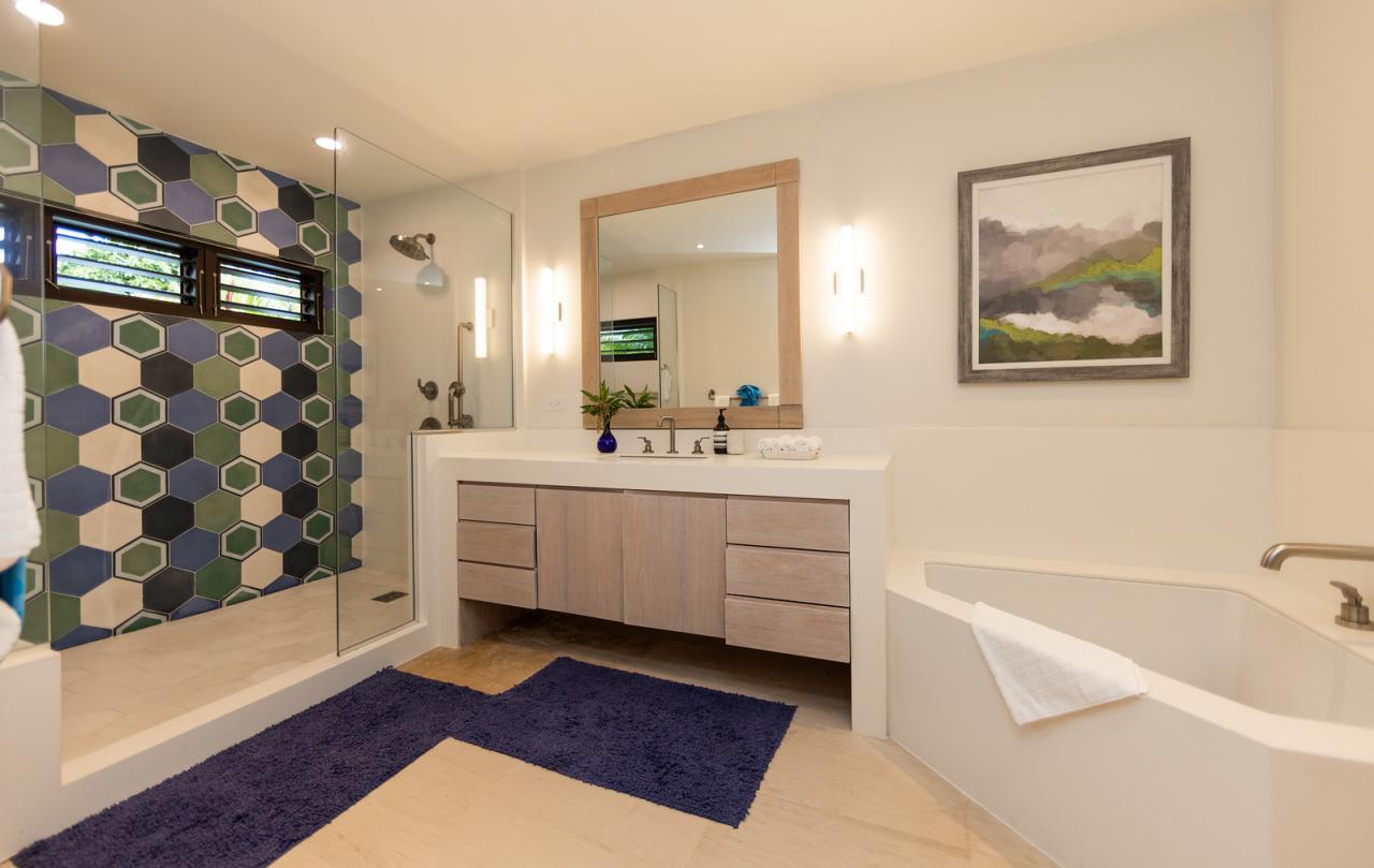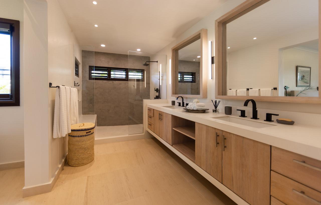 Bedroom 1: This room is located on the lower level. Bedroom 1 is equipped with a king-sized bed, air conditioning, a ceiling fan, automated window black-out blinds, a flat-screen TV with cable access, and an ensuite bathroom with a walk-in shower, a vanity, a separate toilet, a blow dryer, and other bathroom amenities. There are also French doors to an ocean-view terrace.