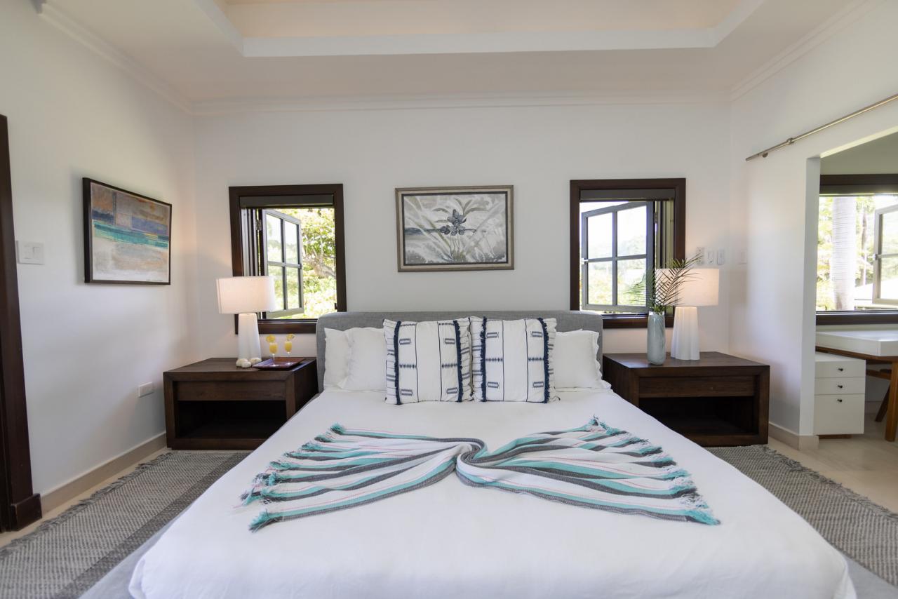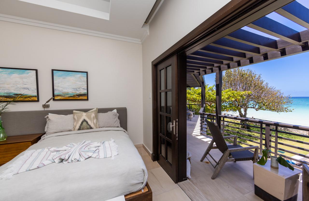 Bedroom 8: This room is equipped with a king-sized bed, air conditioning, a ceiling fan, automated window black-out blinds, a flat-screen TV with cable access, and an ensuite bathroom with a walk-in shower, double vanities, a blow dryer, other bathroom amenities. There are also doors to an ocean-view terrace.