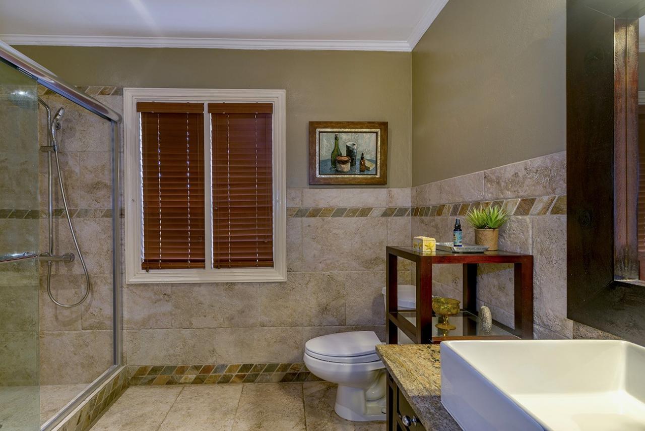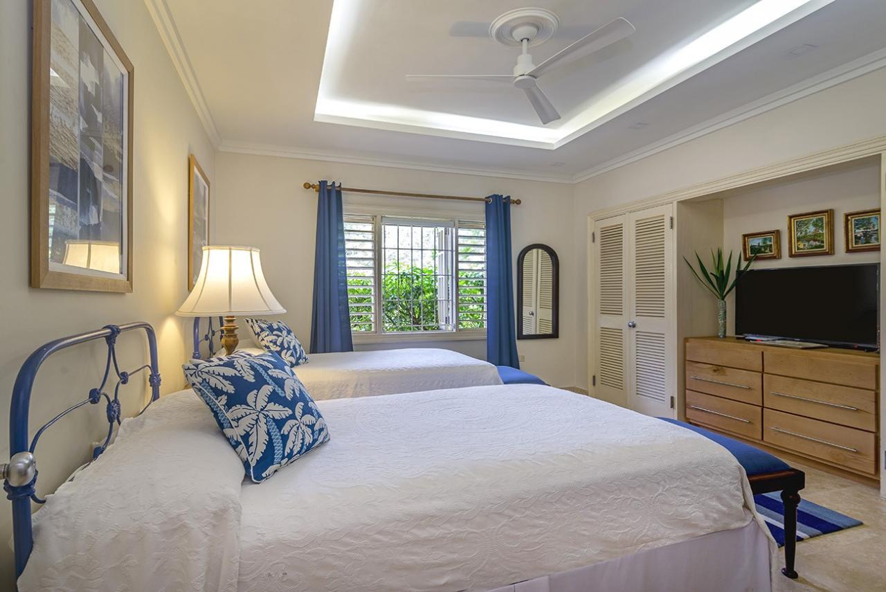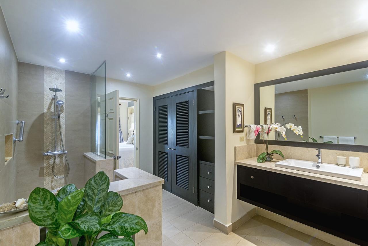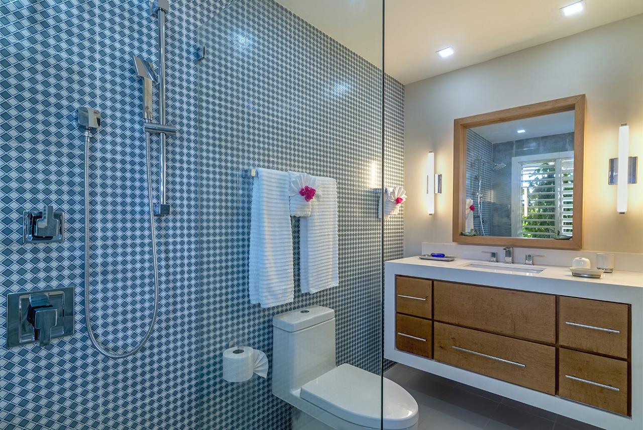 Bedroom 4: This room is equipped with a king-sized bed, a television, and an ensuite bathroom with a walk-in shower. Bedroom 4 also has French doors to a private porch and pool.