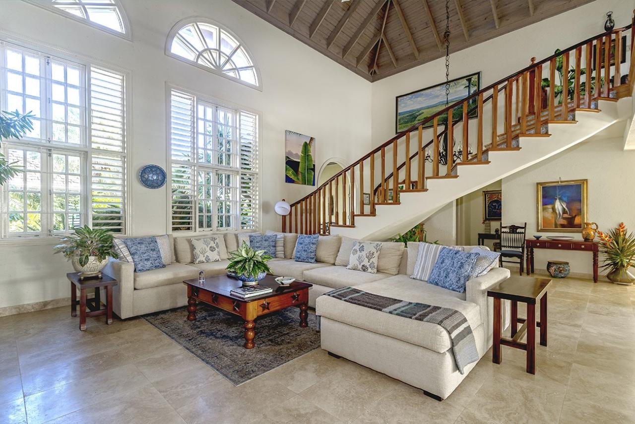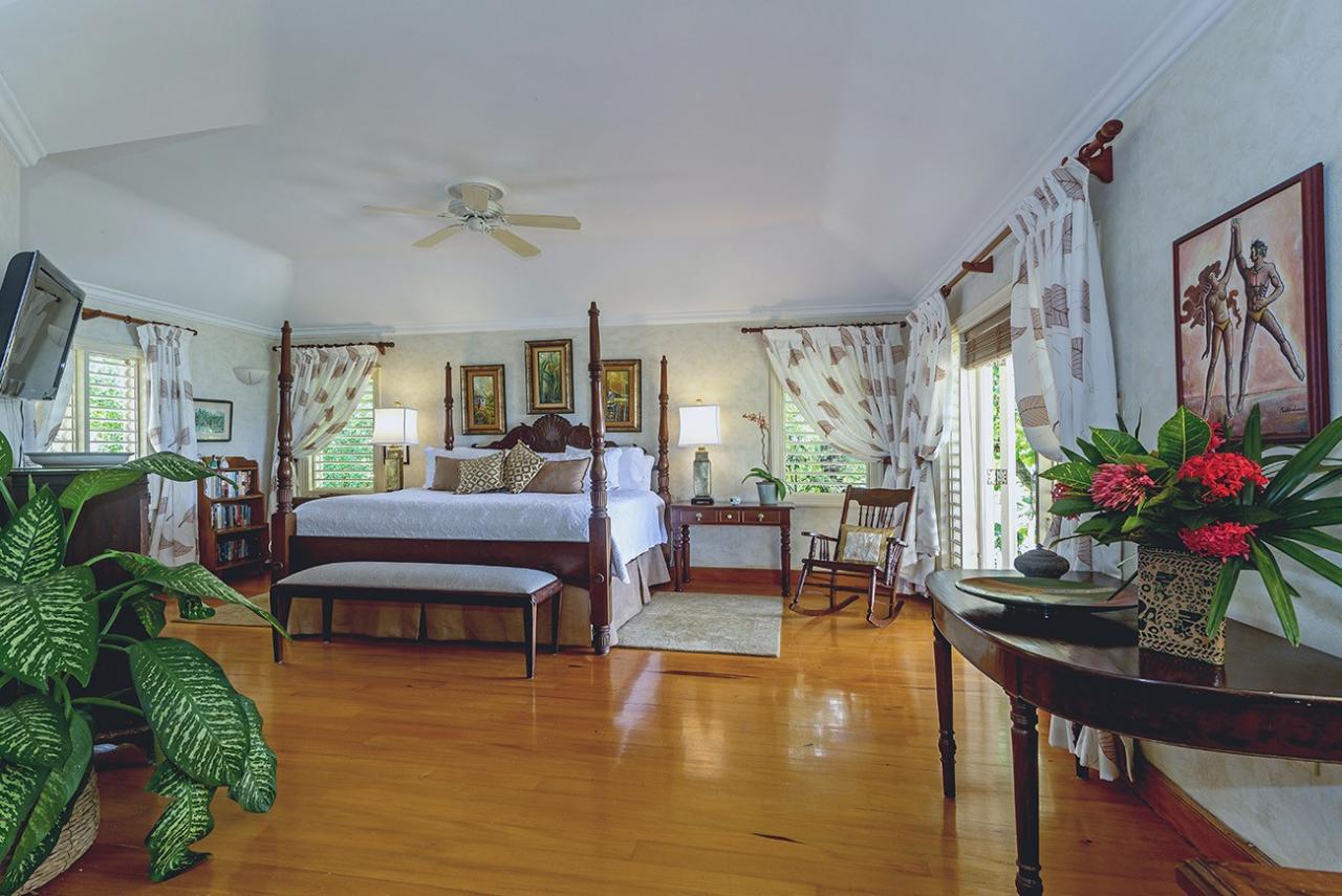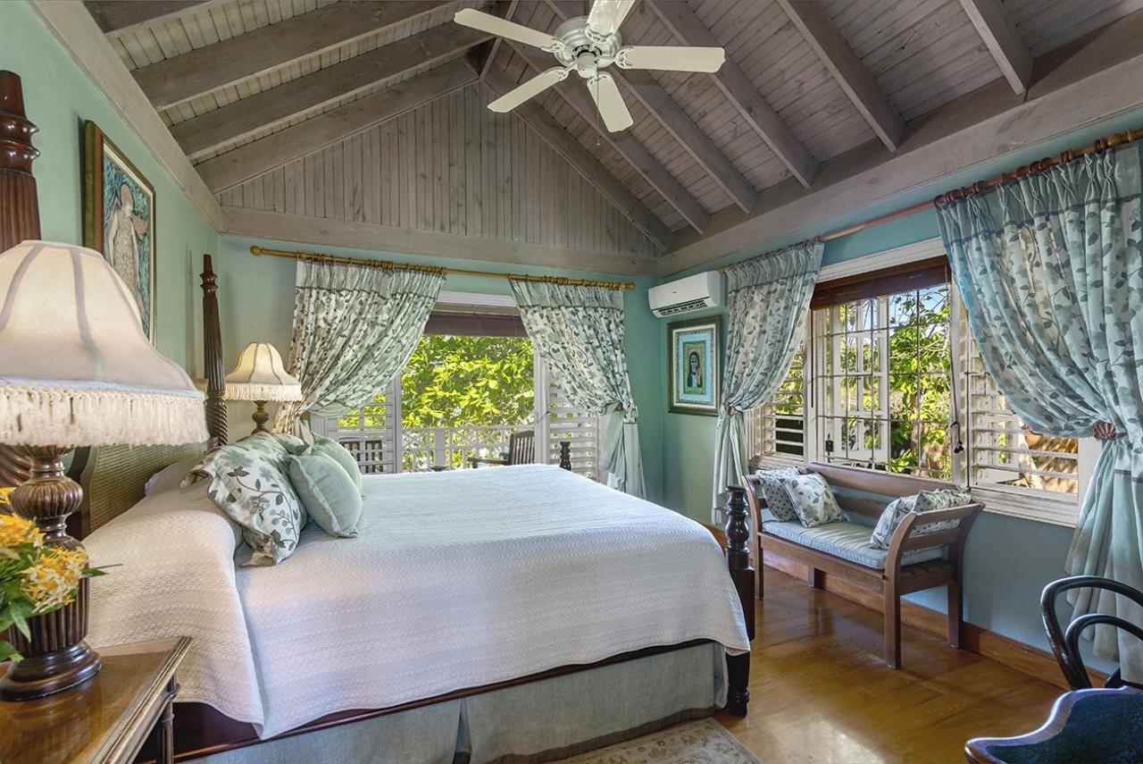 On its own sugary white sand beach lapped by the turquoise waters of Discovery Bay sits the exquisite home Sugar Bay. Interiors are distinguished by elegant custom-designed furniture, color-washed walls, gleaming breadnut floors, and fascinating objets d`art from around the world.