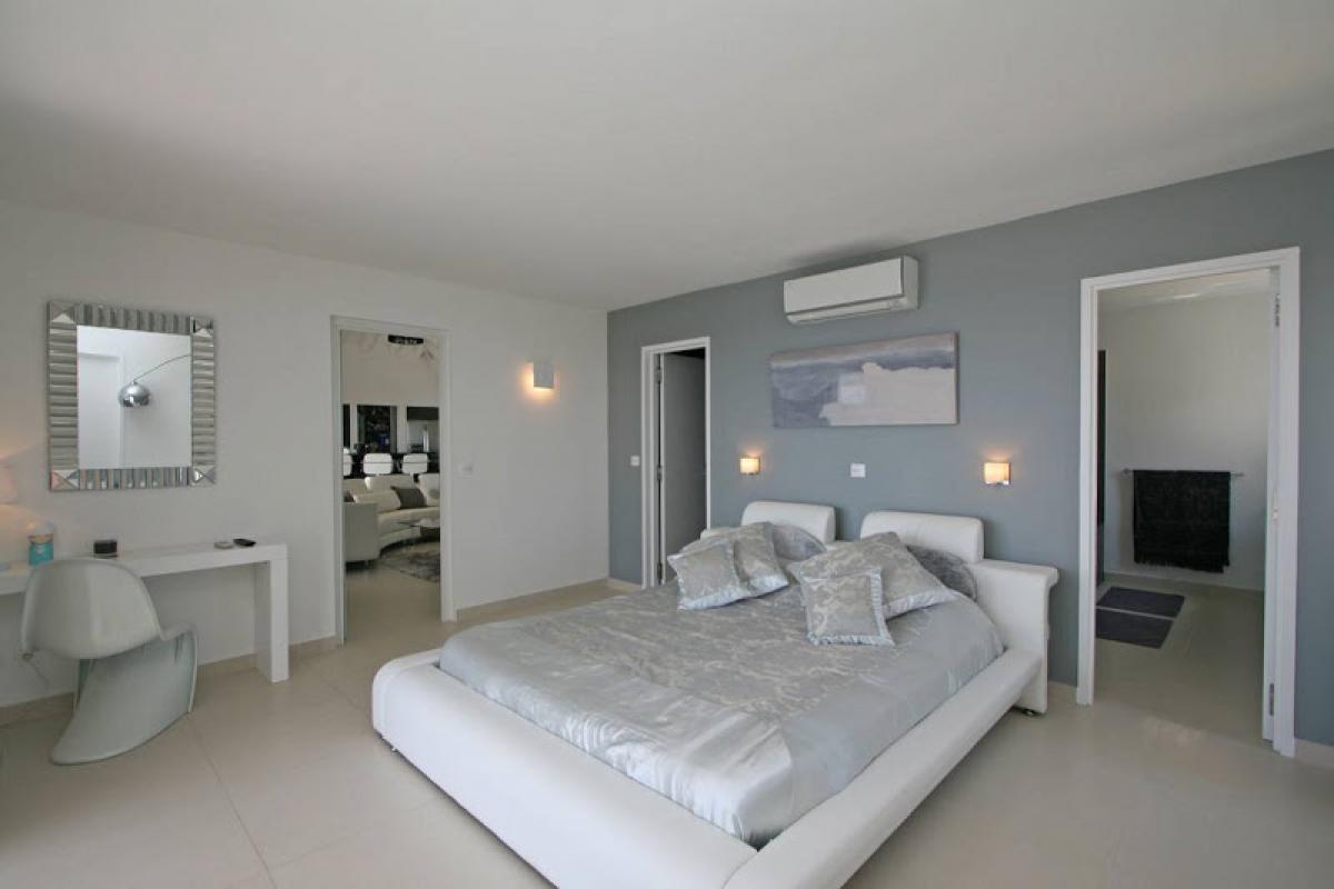 Bedroom 2: white leather French king size bed, ensuite bathroom with shower, access to a terrace that adjoins the pool and a plasma TV