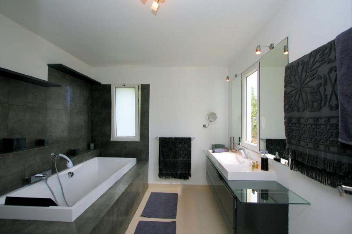 Bedroom 3: white leather French king size bed, ensuite bathroom with shower, access to a terrace that adjoins the pool and a plasma TV All the bedrooms offer privacy although two do connect through a walk in closet.