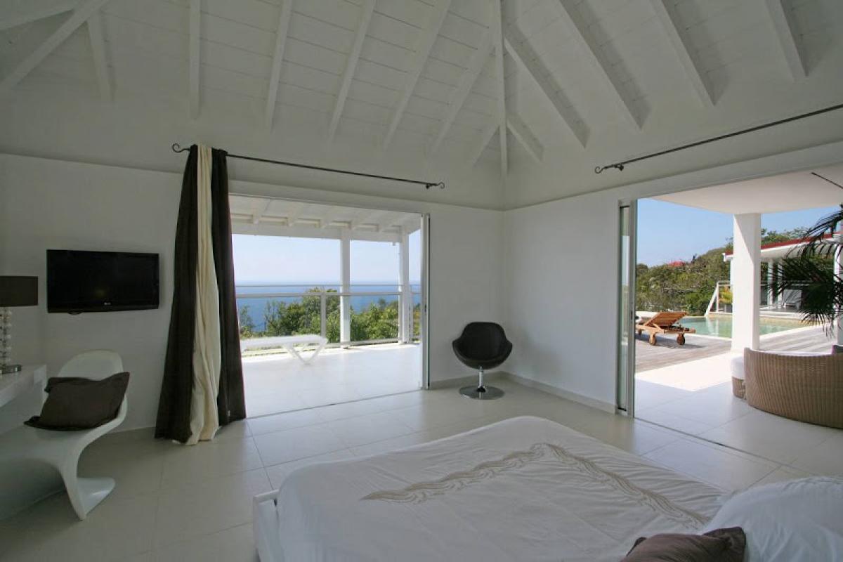 Bedroom 1: white leather French king size bed, ensuite bathroom with shower and tub, access to a terrace that adjoins the pool and a plasma TV