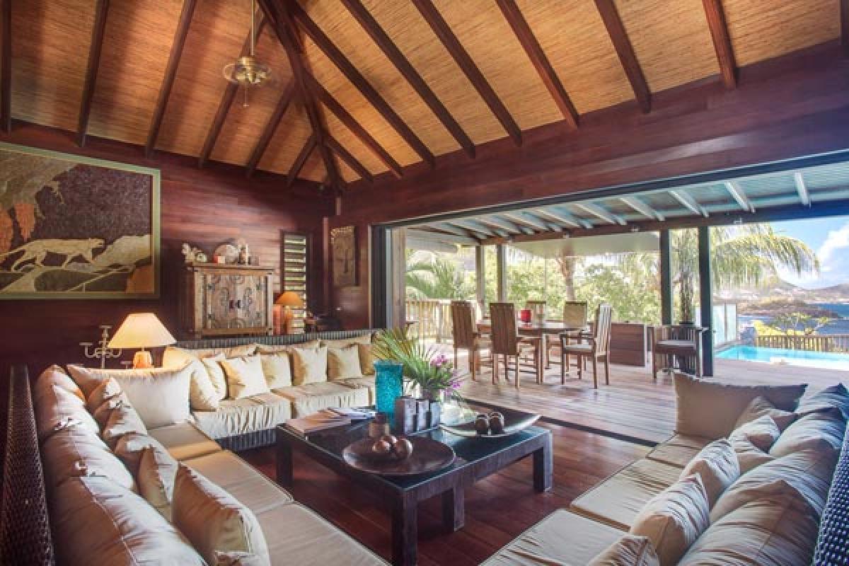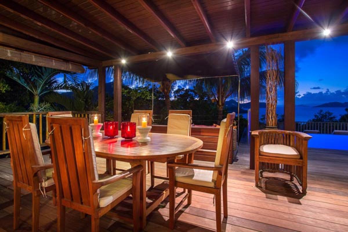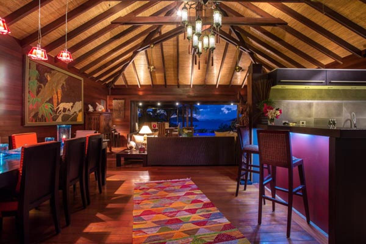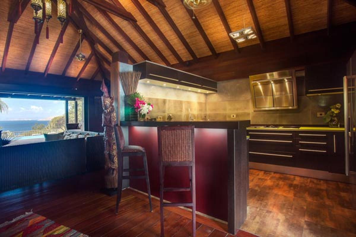 Villa Veronika offers a large living room that opens onto the terrace, infinity pool and view. The large sectional sofa is the gathering spot during an afternoon rain shower or for post dinner cocktails. At the back of the living area is a gourmet kitchen (all the bells and whistles) and breakfast bar. The dining table seats eight guests. A second dining area is located on the covered terrace and offers an excellent view of pool, deck and incredible sea view. There are several lounging areas, located on the multi-leveled deck, which are ideal to relax, read, and sunbathe near the infinity pool, while admiring the sea view.