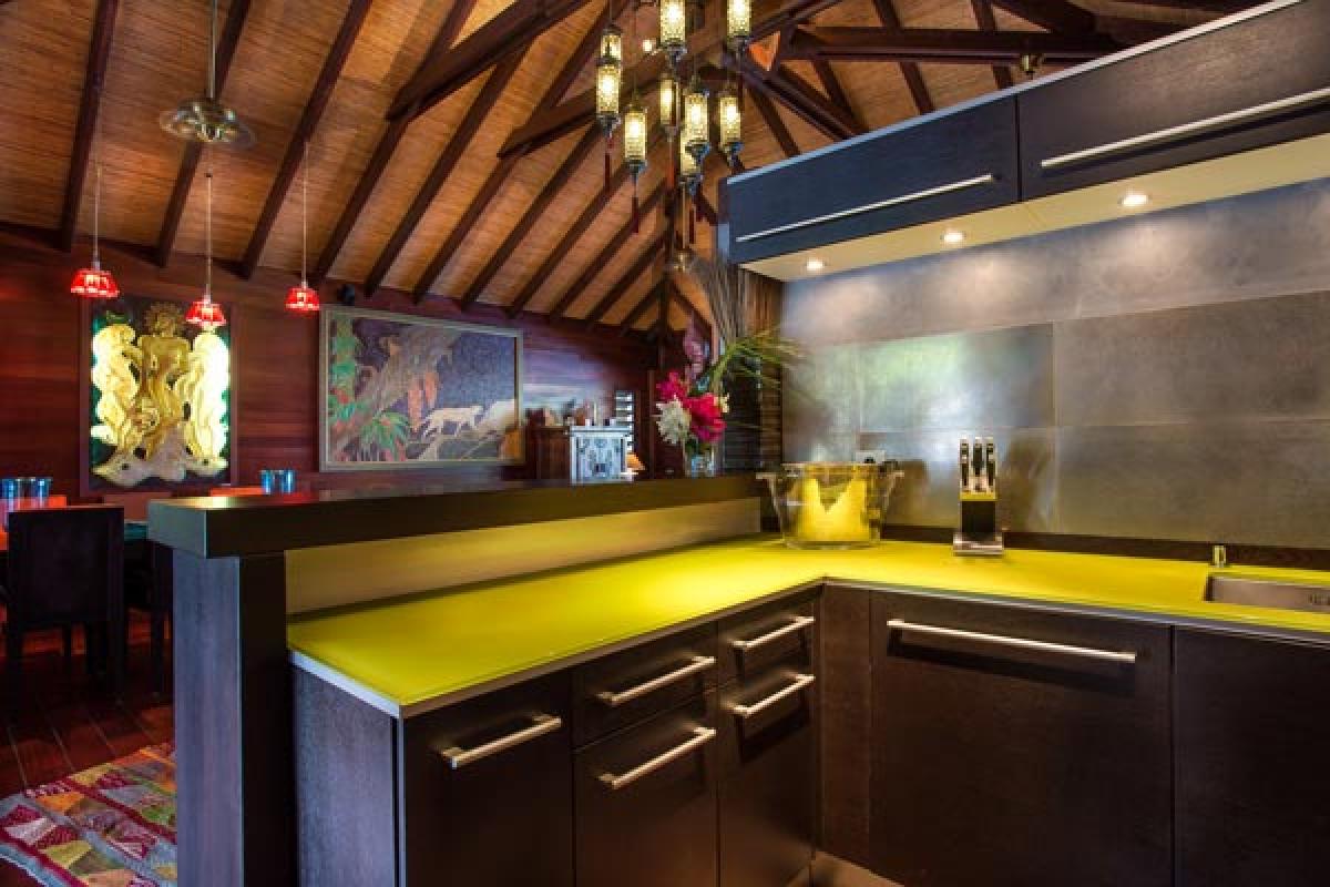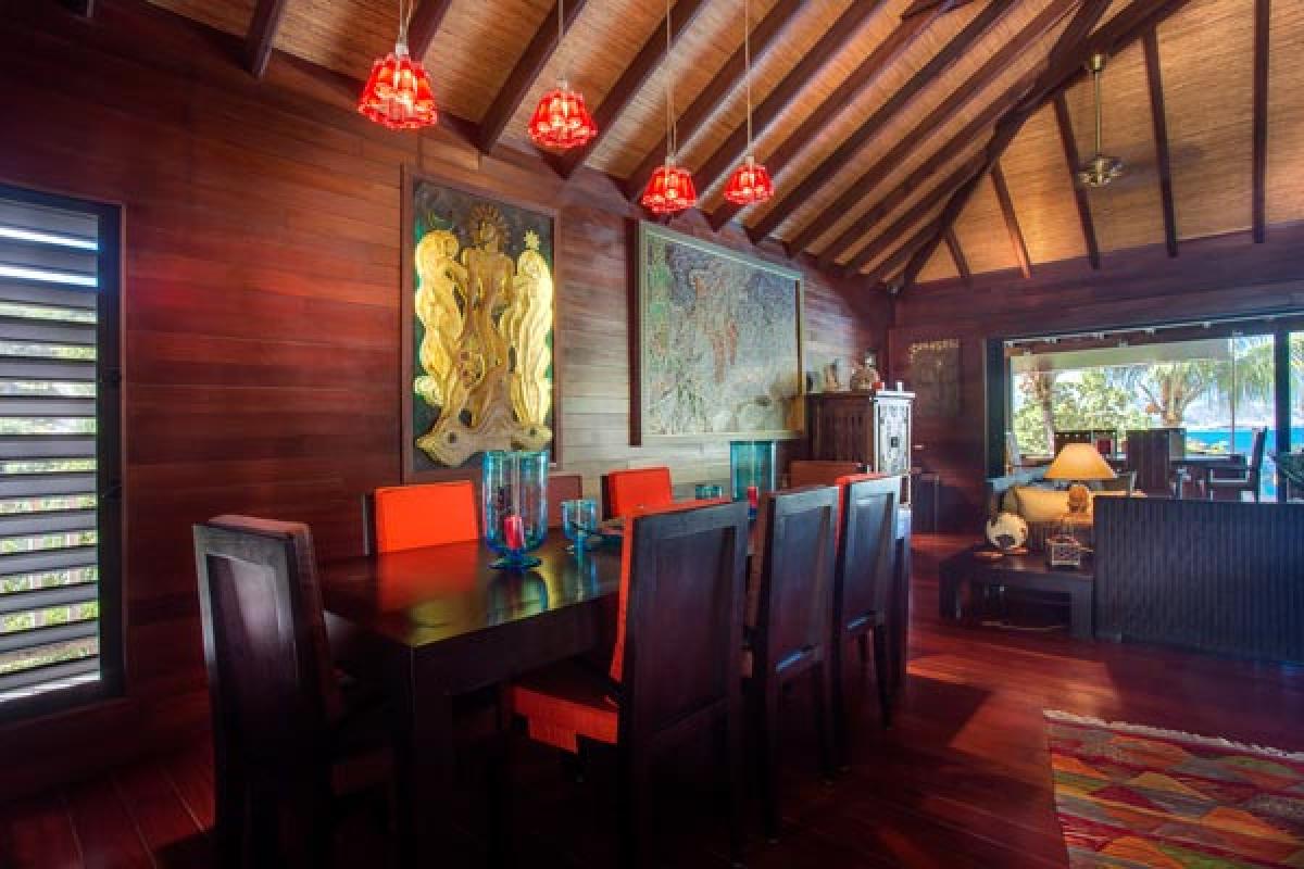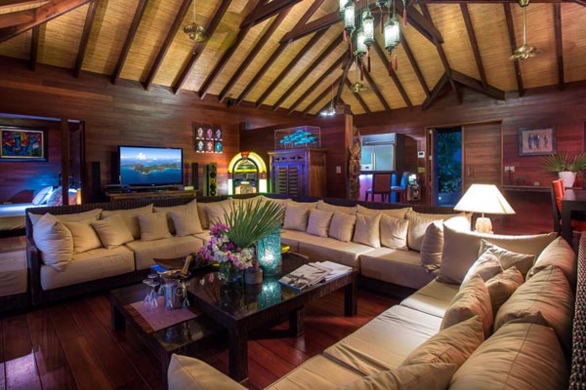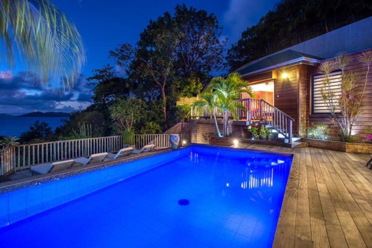 Villa Veronika offers a large living room that opens onto the terrace, infinity pool and view. The large sectional sofa is the gathering spot during an afternoon rain shower or for post dinner cocktails. At the back of the living area is a gourmet kitchen (all the bells and whistles) and breakfast bar. The dining table seats eight guests. A second dining area is located on the covered terrace and offers an excellent view of pool, deck and incredible sea view. There are several lounging areas, located on the multi-leveled deck, which are ideal to relax, read, and sunbathe near the infinity pool, while admiring the sea view.