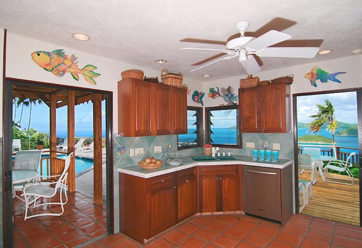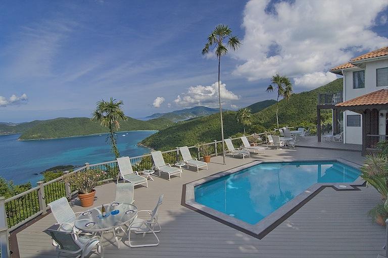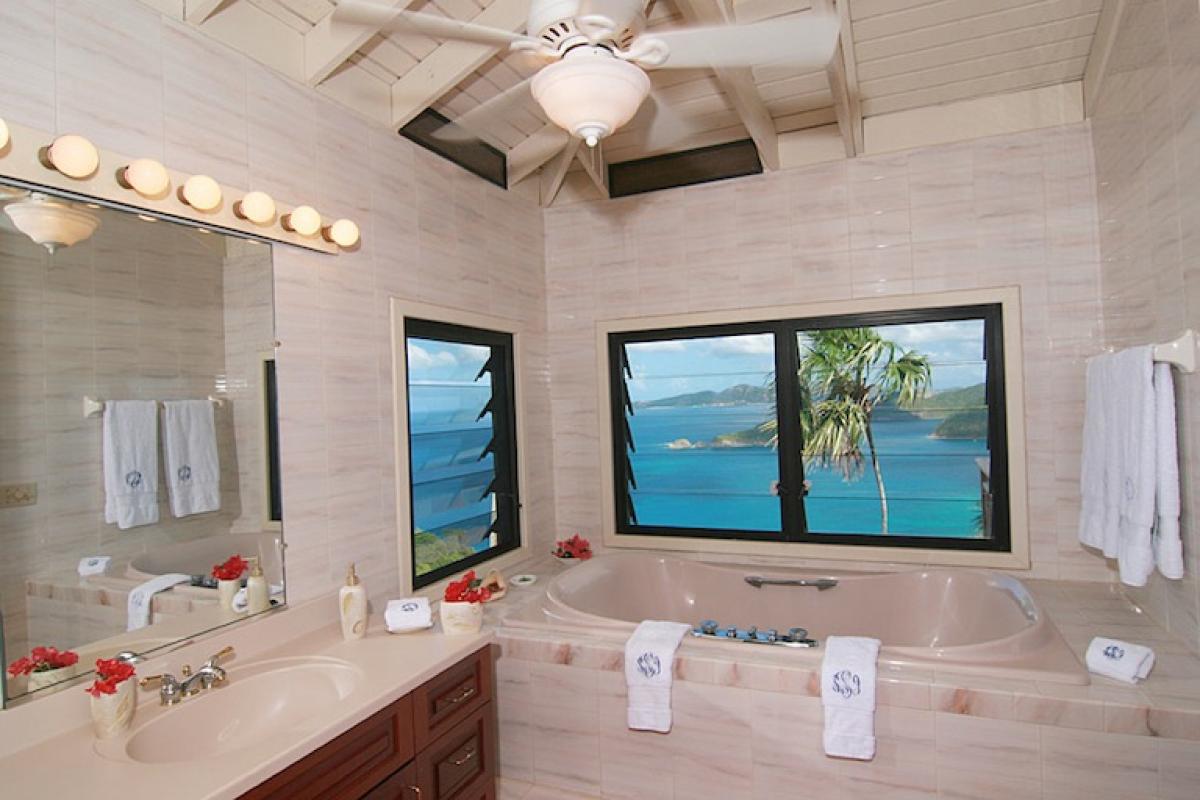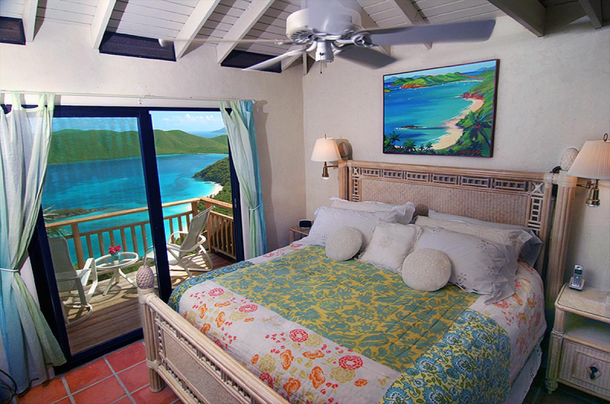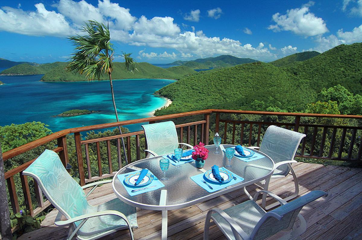 The exclusive Catherineberg and National Park setting of Cinnamon Bay offers some of the most beautiful views and undisturbed tranquillity available anywhere in St John. In addition, you are only a few minutes from the pristine North Shore beaches and Cruz Bay restaurants. Like the setting, the villa itself is superb. With its 35 foot beamed cathedral ceilings, terra cotta tiled floors, spacious living area and wrap around decks, this is the very essence of a refined and exclusive, yet very comfortable and inviting island Villa. The views from the balconies and bedrooms are among the best in the world. As you enter Cinnamon Bay, to your left and right are handsome mahogany stairs that lead up to very private master and guest bedrooms, both with king bedsand private balconies. The master bedroom has a large walk-in closet, cathedral ceiling, ceiling fans, a tiled bath and shower, and a relaxing whirlpool bath. The upper level guest bedroom has a 180 degree Caribbean panorama and a tiled bath and shower. The ground floor guest bedroom opens to a private cocktail deck, and has two twins that can be prepared as a king. The kitchen should keep any gourmet chef happy with a brand new stove, refrigerator, microwave, dishwasher, toaster oven, blender, coffee maker, and telephone. A half-bath & washer/dryer are located off the kitchen. A gas barbecue is located on the covered deck. Meals may be served at any of three dining areas. From the private fresh-water pool and jacuzzi, to the enormous balcony with elegant patio furnishings, there is no view in the world that compares with the Cinnamon Bay North Shore View. A private pool and hot tub with spectacular North Shore panoramas, and your private master bedroom balcony make Cinnamon Bay one of the most beautiful homes in the world!