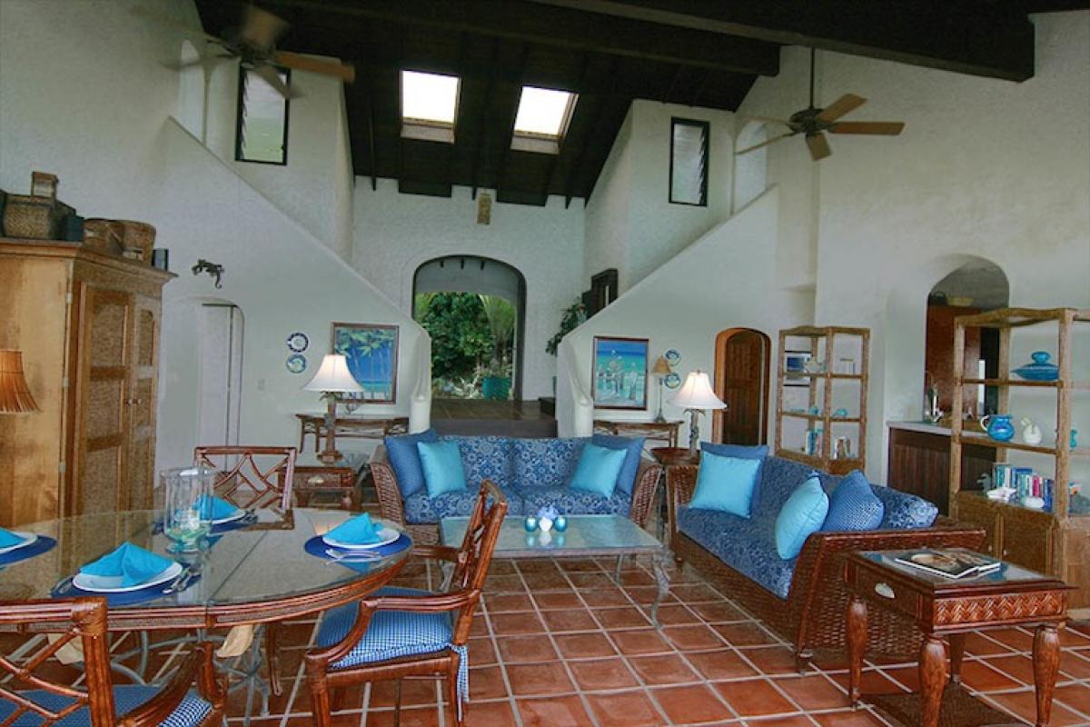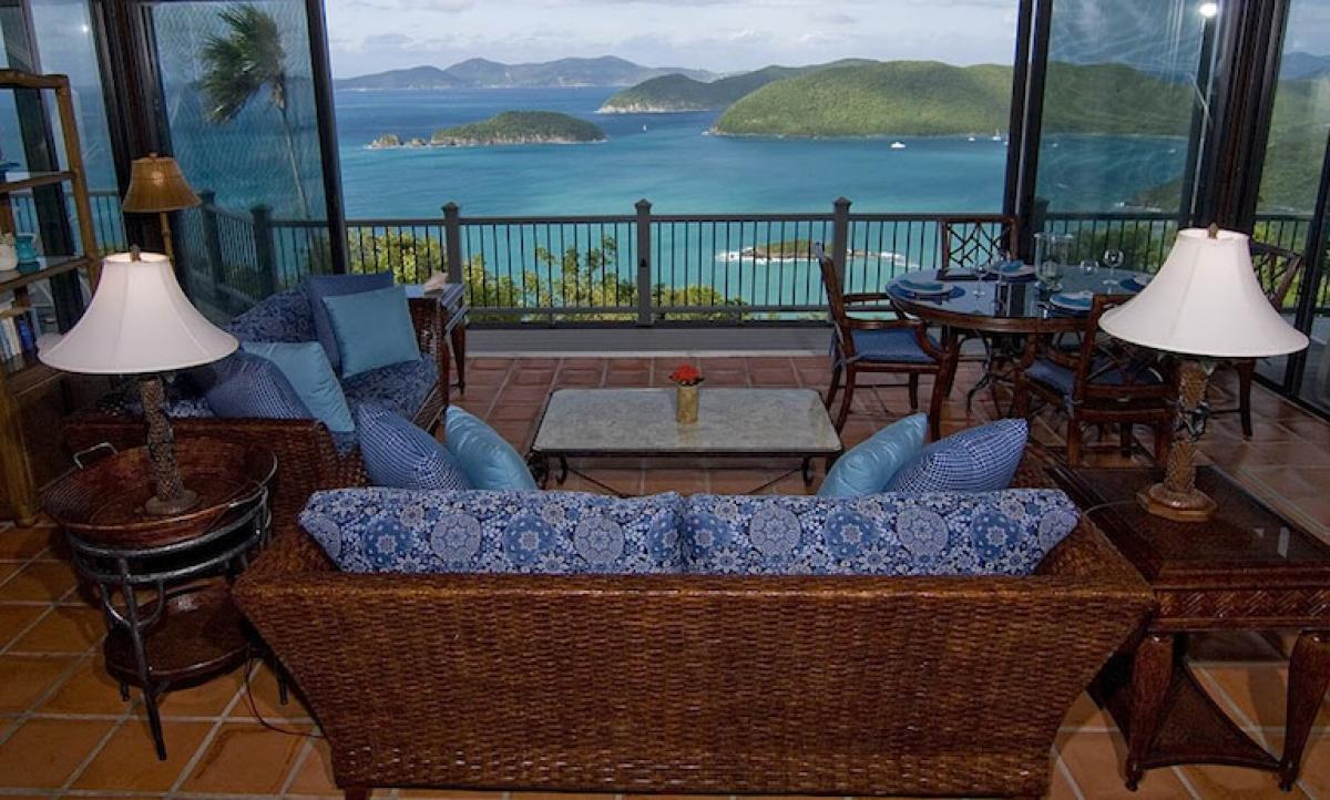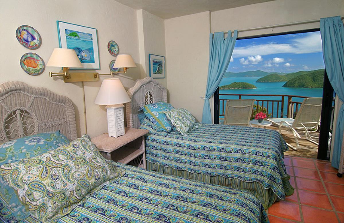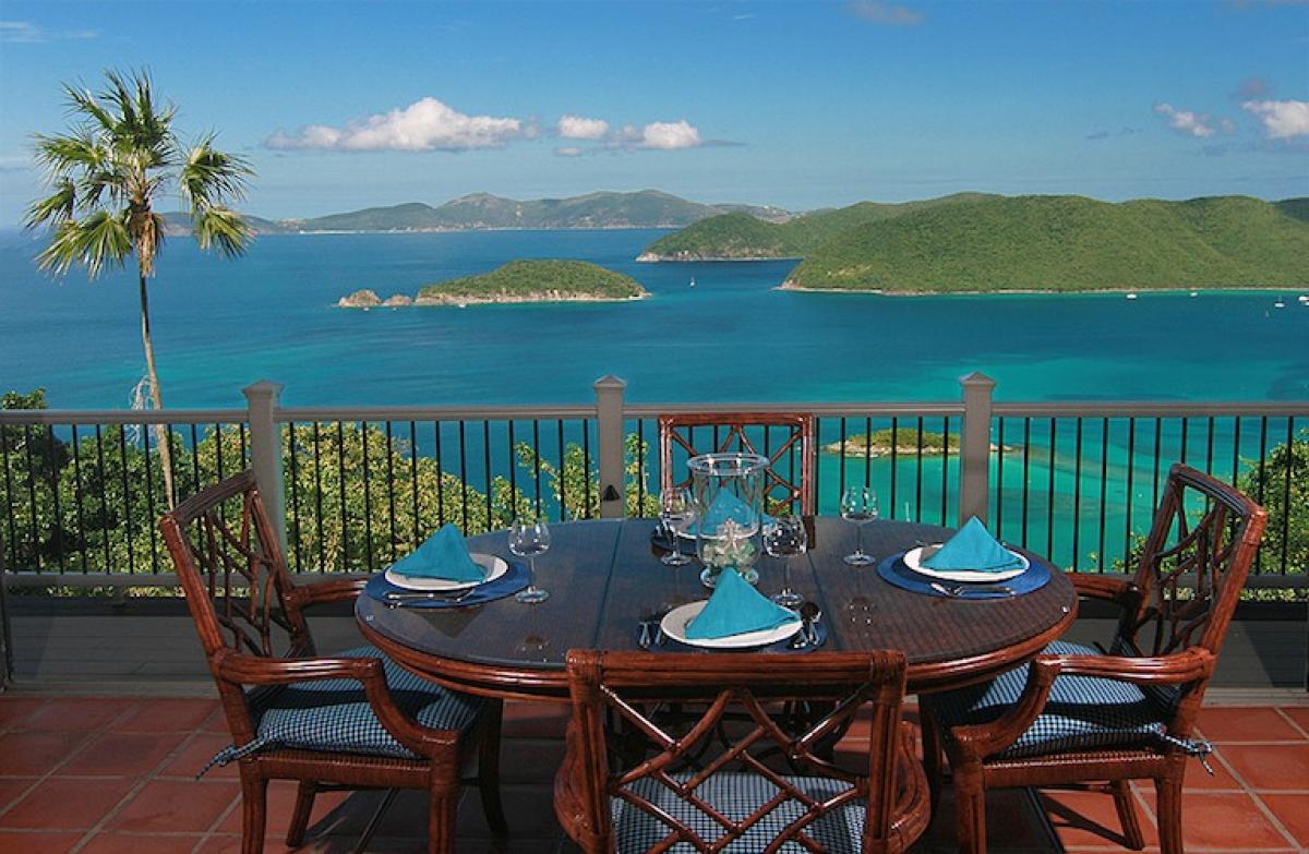 The exclusive Catherineberg and National Park setting of Cinnamon Bay offers some of the most beautiful views and undisturbed tranquillity available anywhere in St John. In addition, you are only a few minutes from the pristine North Shore beaches and Cruz Bay restaurants. Like the setting, the villa itself is superb. With its 35 foot beamed cathedral ceilings, terra cotta tiled floors, spacious living area and wrap around decks, this is the very essence of a refined and exclusive, yet very comfortable and inviting island Villa. The views from the balconies and bedrooms are among the best in the world. As you enter Cinnamon Bay, to your left and right are handsome mahogany stairs that lead up to very private master and guest bedrooms, both with king bedsand private balconies. The master bedroom has a large walk-in closet, cathedral ceiling, ceiling fans, a tiled bath and shower, and a relaxing whirlpool bath. The upper level guest bedroom has a 180 degree Caribbean panorama and a tiled bath and shower. The ground floor guest bedroom opens to a private cocktail deck, and has two twins that can be prepared as a king. The kitchen should keep any gourmet chef happy with a brand new stove, refrigerator, microwave, dishwasher, toaster oven, blender, coffee maker, and telephone. A half-bath & washer/dryer are located off the kitchen. A gas barbecue is located on the covered deck. Meals may be served at any of three dining areas. From the private fresh-water pool and jacuzzi, to the enormous balcony with elegant patio furnishings, there is no view in the world that compares with the Cinnamon Bay North Shore View. A private pool and hot tub with spectacular North Shore panoramas, and your private master bedroom balcony make Cinnamon Bay one of the most beautiful homes in the world!