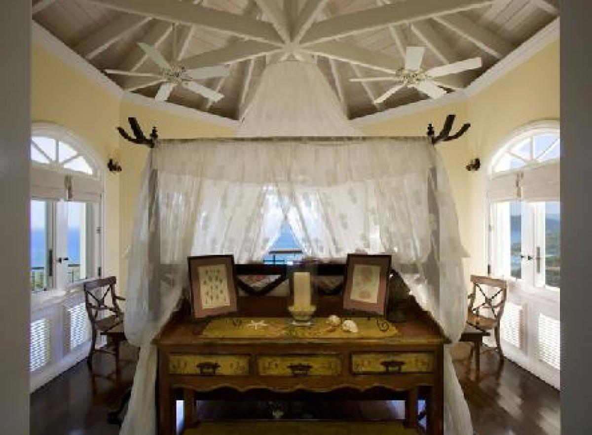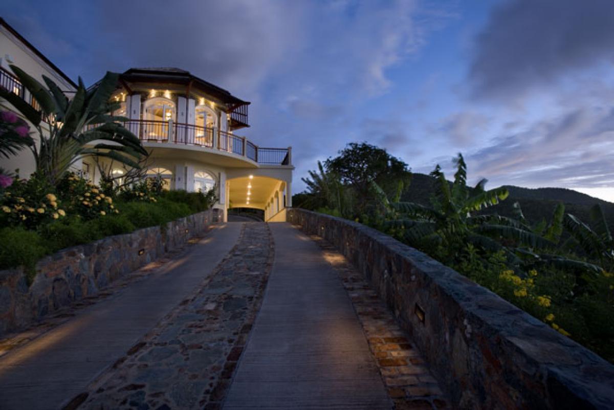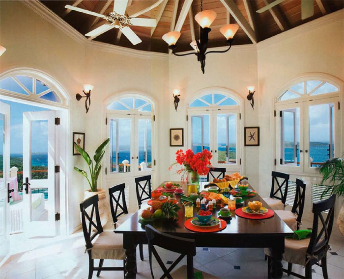 The superior architecture of Hawksview Estate captures the essence of old world sophistication and charm with its lofty exposed beam ceilings and gracefully arched windows and doors. Situated on five very private acres within the Virgin Islands National Park boundaries, Hawksview Estate is located on the north shore of St. John, on the ridge top between Hawksnest Bay and world renowned Trunk Bay, providing a panorama of breathtaking views. The Hawkview Estate house portals rich mahogany woodwork frames, and the interior floors are tiled in Bulgarian limestone and Italian marble. Hawksview Estate's tasteful West Indian architecture showcases the myriad of pristine natural beauty visible at every glance from within the villa, while the stylish mix of Caribbean and European furnishings harmonize to create a casual and comfortable ambiance.
