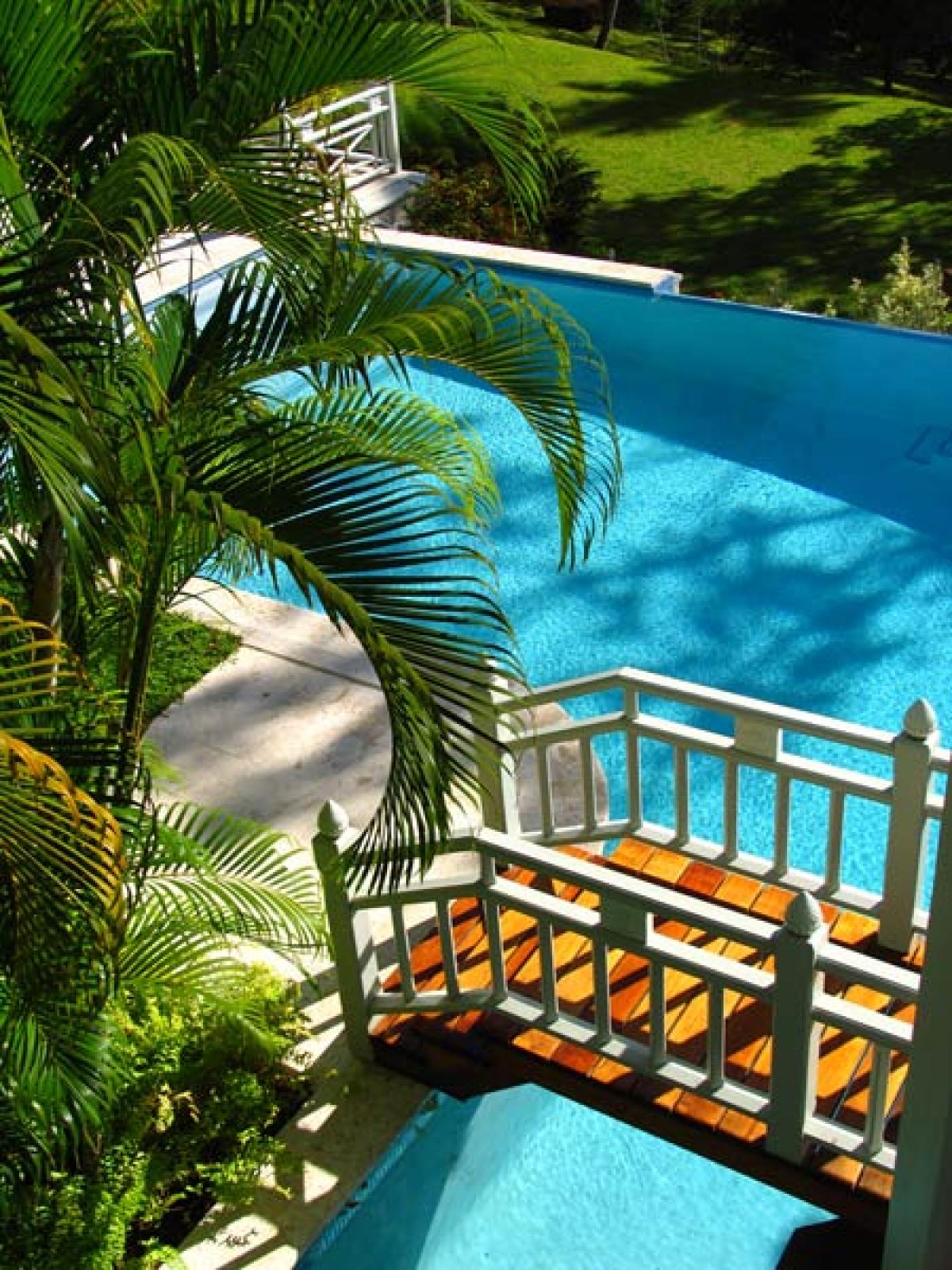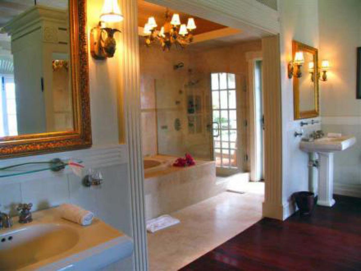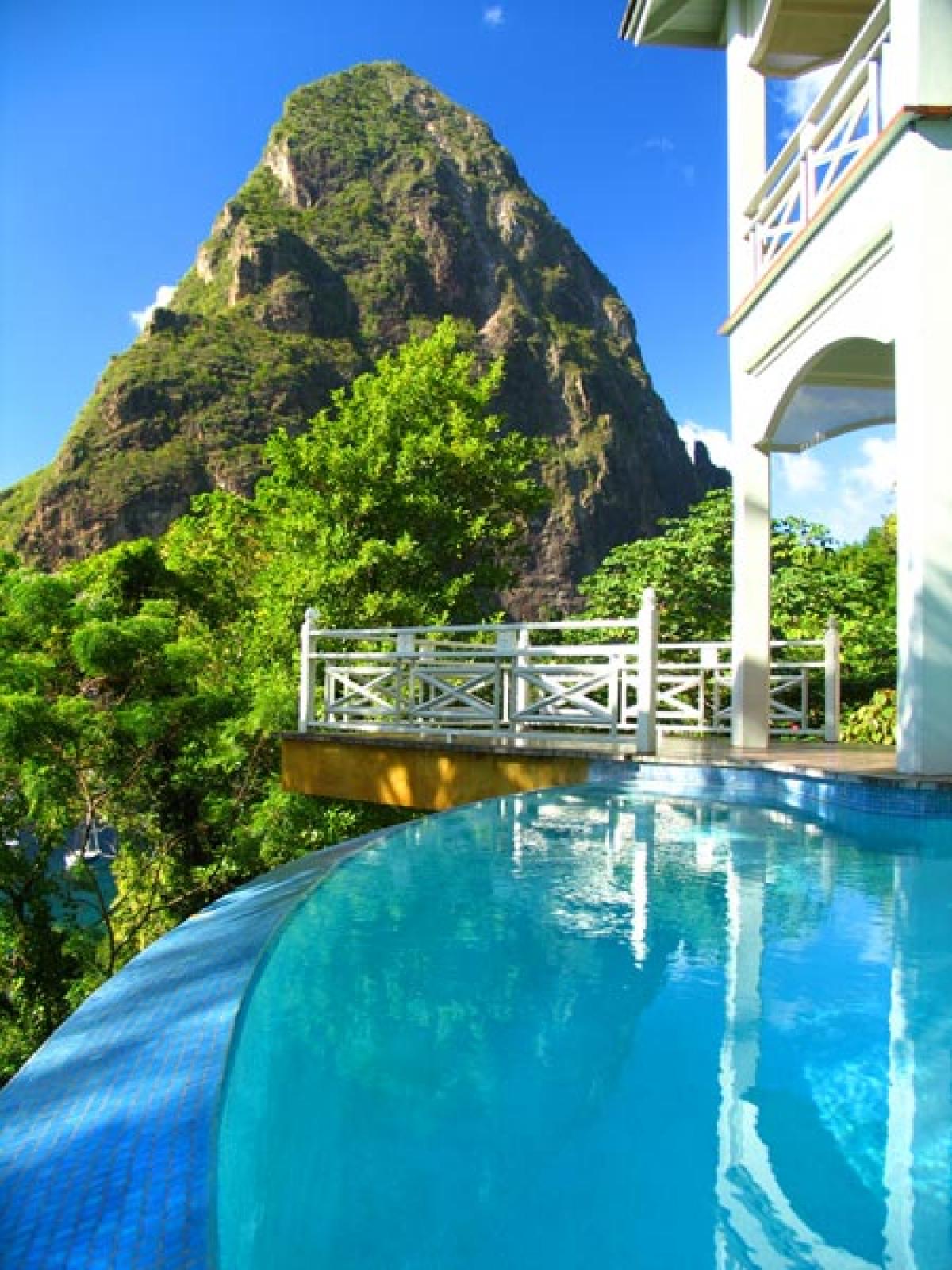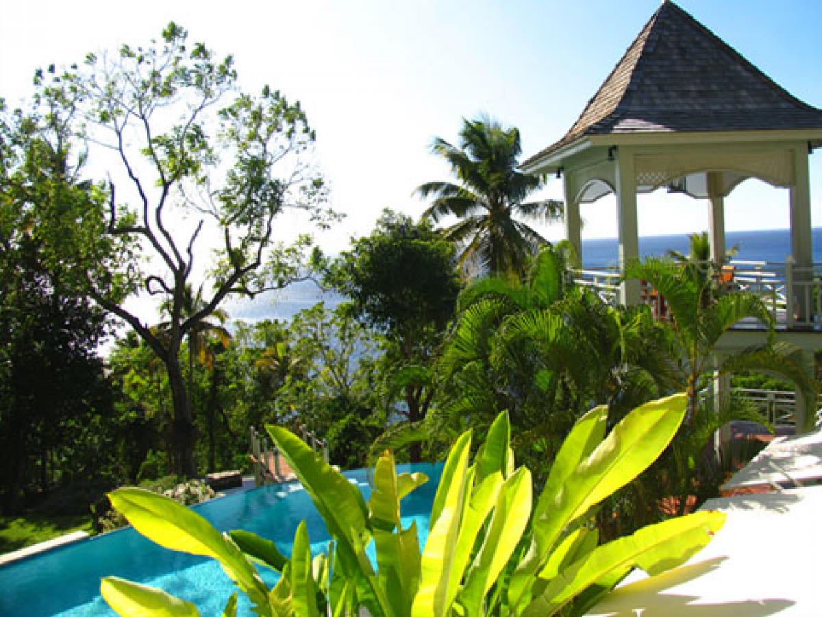 Arc En Ciel is situated above the Caribbean Sea and is a short distance from Jalousie Beach and hotel. Soufriere, which is a sleepy fishing village, also boasts the drive in volcano, hot waterfalls, diving and snorkeling at Anse Chastanet beach, and exotic tropical gardens and mineral baths at Diamond Estate. Arc En Ciel has been imaginatively designed to a very high standard by architect Lane Pettigrew, who has also created the interior design with hand made furniture from Honduras, and some select pieces from Tommy Bahama. The house incorporates many aspects of traditional Caribbean style with its verandas, jalousie shutters, and wooden railings. It has been constructed as a number of small pavilions connected by verandas. The exterior of the house has been partially finished with a facing of hand chipped stones to resemble the exterior of the forts, which were constructed on the island many hundreds of years ago. The house is situated in an extensive, landscaped garden that has a wide variety of tropical flowers and trees. Arc En Ciel has 5 double bedrooms all of which are air conditioned with ceiling fans. Each bedroom has its own TV, DVD player, and stereo. Bedroom 1 has a queen size bed and a patio with a unique view of Petit Piton. There is an en suite bathroom, where the wall facing Petit Piton is glass, so guests can enjoy views of this mountain from the jacuzzi bath and the shower. There is a private swimming pool and sun deck that is situated off the bathroom, in an enclosed garden area. Bedrooms 2 and 3 each have a queen size bed, a private patio, and an ensuite bathroom with shower and jacuzzi. Bedrooms 4 and 5, which are situated downstairs and open onto the swimming pool deck, each have two single beds, a private patio, and an en suite bathroom with shower and jacuzzi. The living/dining room is situated in the center of the house and is tastefully furnished and equipped with a TV, DVD player, and stereo. The formal dining table can seat 10. This room opens out onto a patio which leads to a spectacular dining gazebo, where guests can dine with the backdrop of the Caribbean Sea and the Pitons. The balance of the entertainment areas are situated downstairs. Here you can enjoy the outdoor living of the Caribbean in the large, covered patio, with a casual dining area and bar with its own fridge. This leads onto an extensive pool deck and a series of smaller pool patios. There is a comfortable, air conditioned family room with two large sofas, one of which can convert into a double bed. The infinity edge pool weaves its way around this area and includes a stone cave with a waterfall.