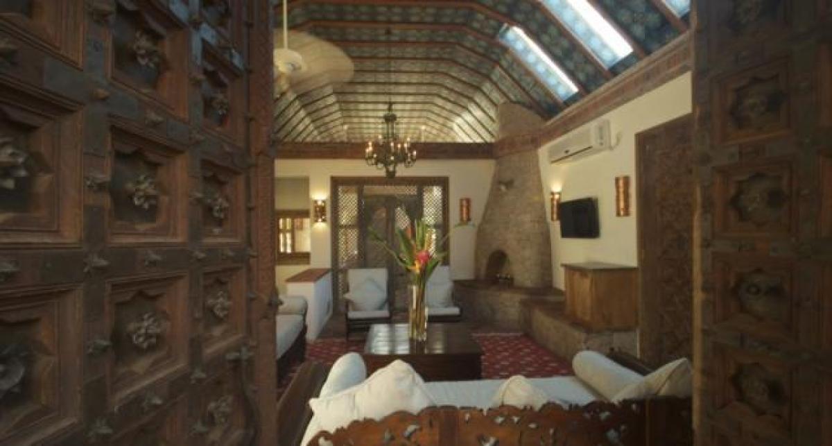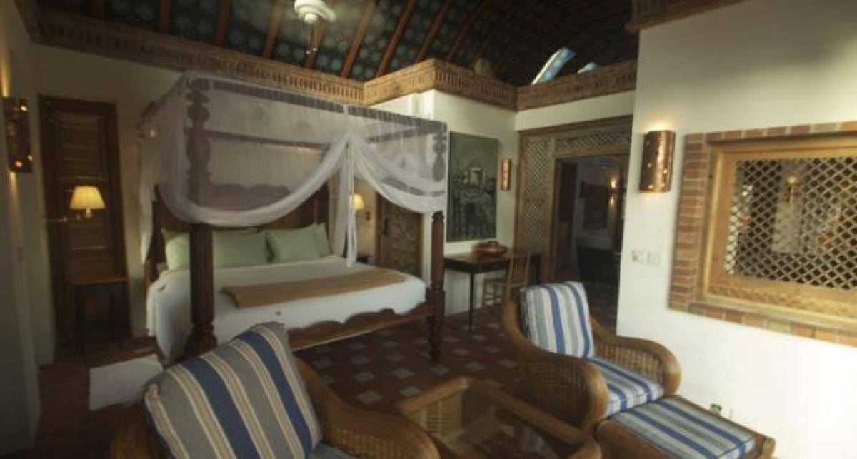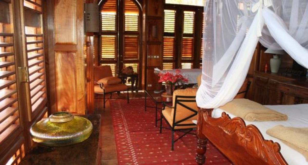 - Temple Suite: This suite has hand carved, antique palace doors from India. This suite has two levels...first level has a gym and a bedroom with three four-poster full size beds and a bathroom. The second level is connected by a stairway that leads to a living room, king size bedroom with ensuite bathroom. The view is of the majestic Pitons.