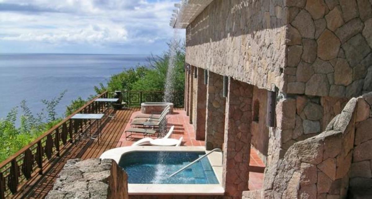 - Grotto Suite: This is the owner's private suite. It is located below the pool level and into the cliffside on a private stone patio. There is a four-poster king size bed, ensuite bathroom, living room with couch and chairs and a small kitchen. Out on the deck there is a Japanese soak tub.