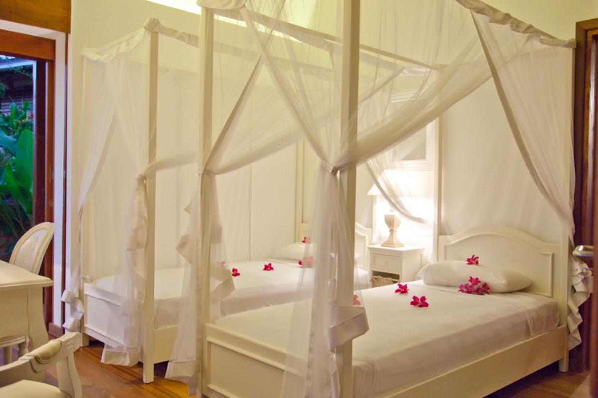 Bedroom 4: 2 Twin beds, En-suite bathroom with shower, Air conditioning, TV, iPod dock, Safe, Private garden with hammock