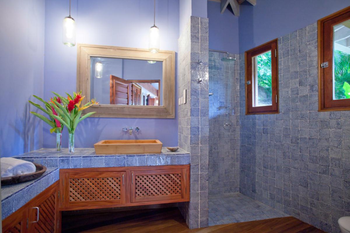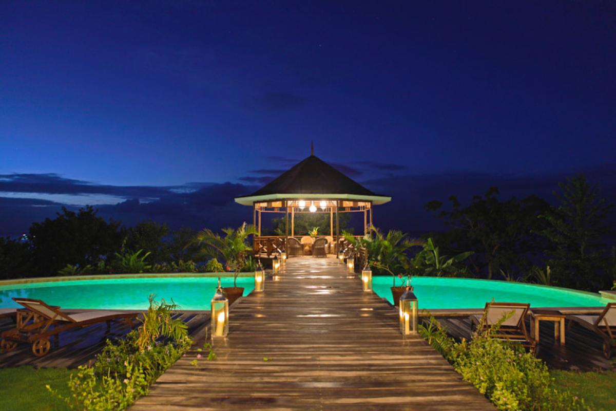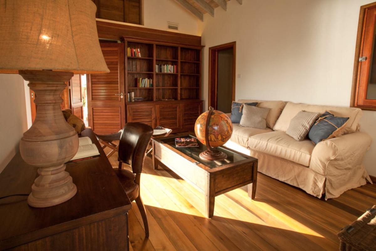 Enter Villa Susanna through a breezy hallway with a beautiful Murano glass chandelier and this leads into a spacious sitting room with ample seating and TV, DVD and stereo and a dining room with a dining table which can seat 20 persons. This room is cooled by ceiling fans. From here you can walk outside through the patio with chairs and a hammock for relaxing, through the garden and over the pool, via a wooden bridge, to the sunset gazebo situated right above the ocean. This has a large round glass table and chairs and can seat 14 persons. The swimming pool is 20 meters long and is 2 meters deep + a shallow end.