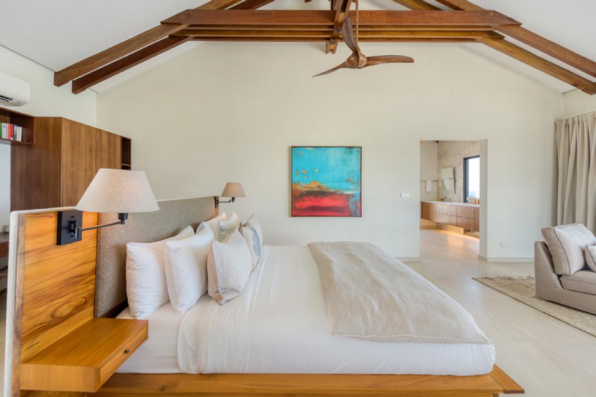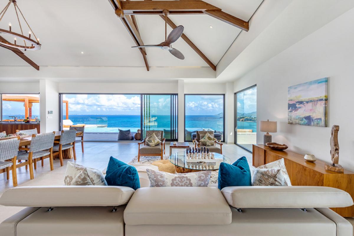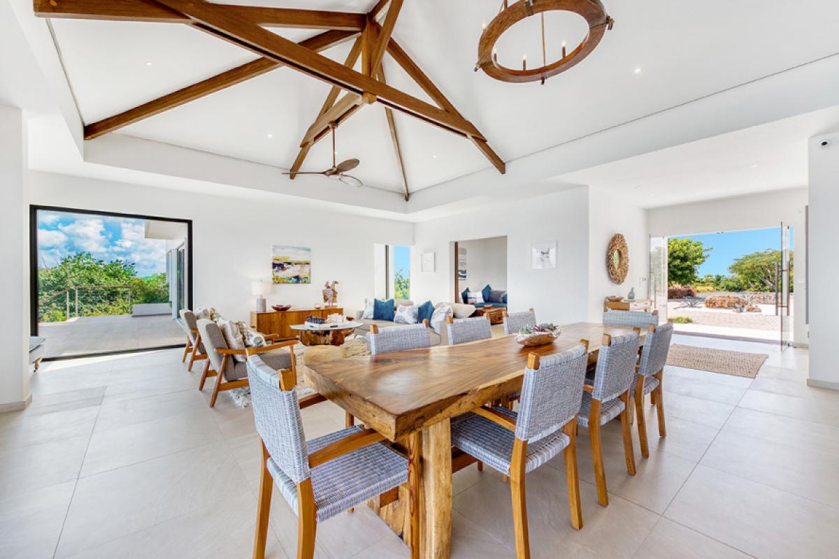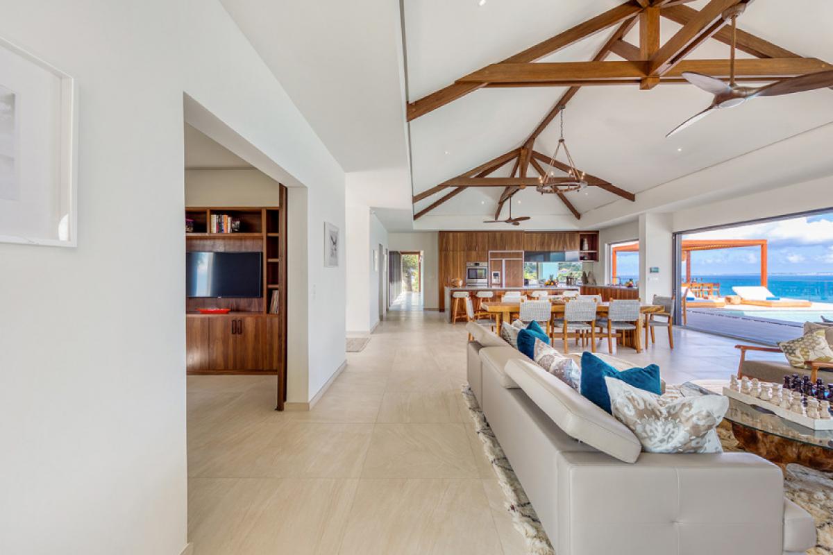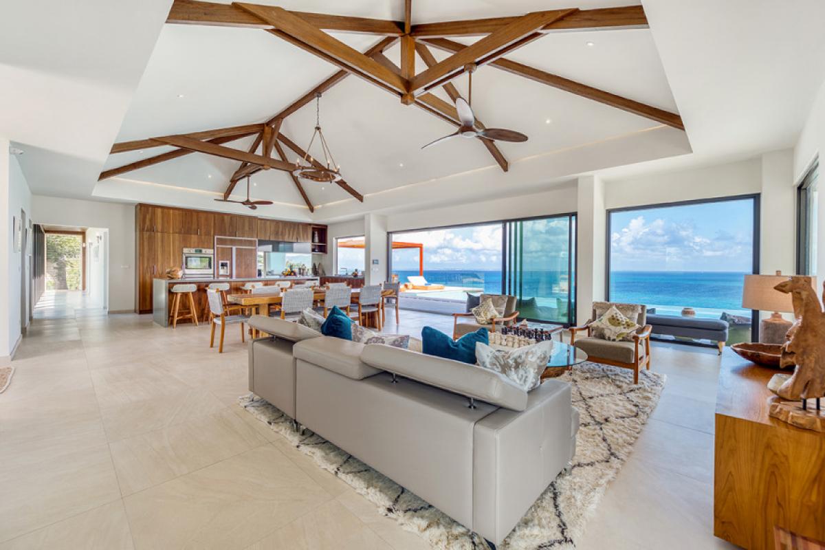 The interiors take full advantage of the view and outdoors. The great room is open and airy with a unique beamed ceiling, more like art than architecture. It is a stylish space with sleek contemporary lines blended with exotic touches; teak and rattan furniture are adorn with neutral fabrics and interesting art and décor. The interior layout makes this villa perfect for multi-generational families. The expansive great room seamless blends the lounging and dining areas with a beautiful modern kitchen in elegant woods, upscale appliances and a view.