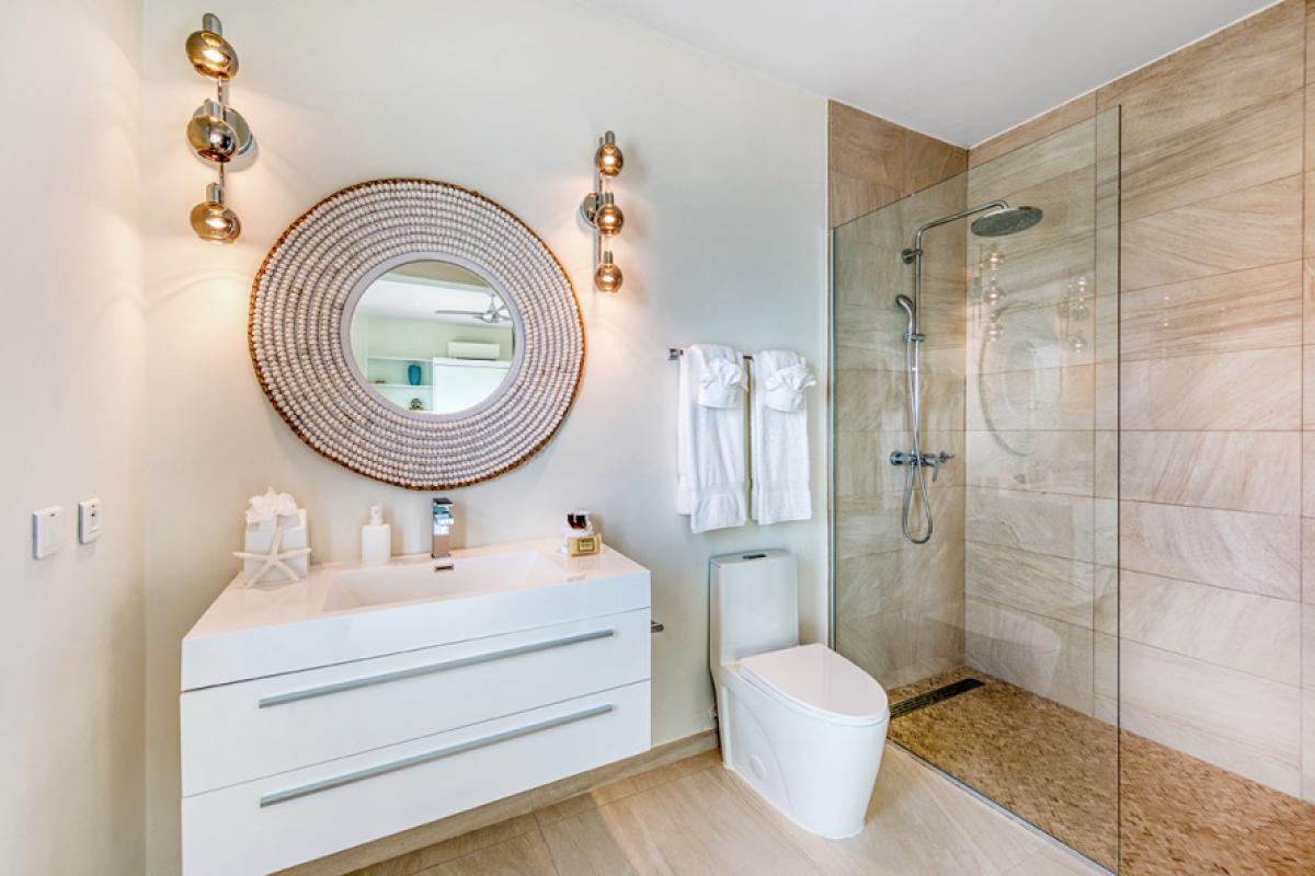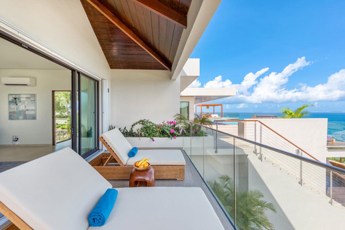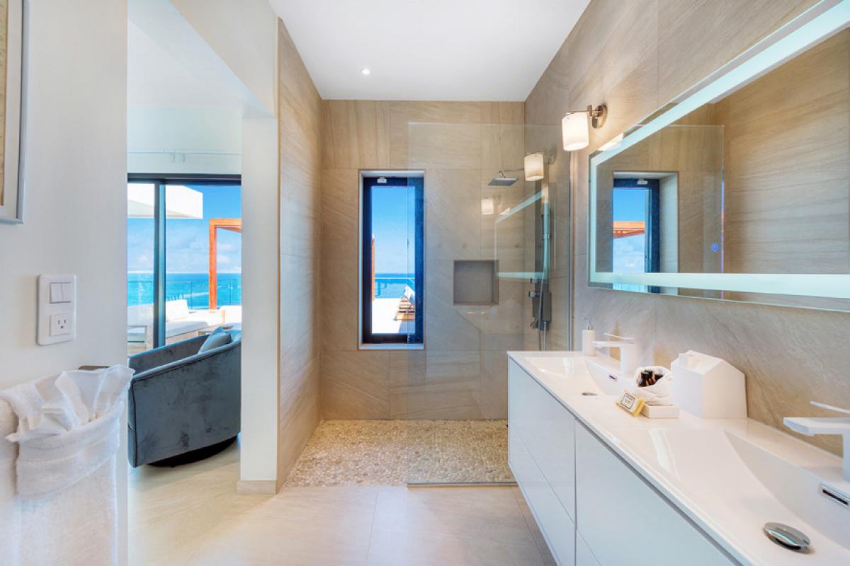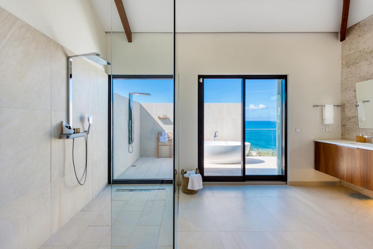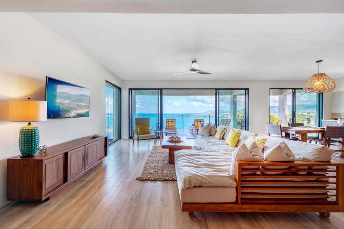 Four bedrooms, two masters and two smaller rooms, are all under one roof, each with a brilliant view and serene décor in white with gentle pops of color. The en-suite bathrooms exude a beautiful spa style attitude. The two masters have fabulous outdoor showers and tubes open to the sky. The fifth bedroom is a huge apartment on the lower level with an interior and exterior entrance plus kitchenette and large private terrace.