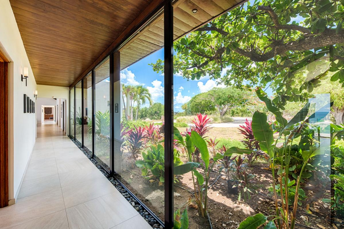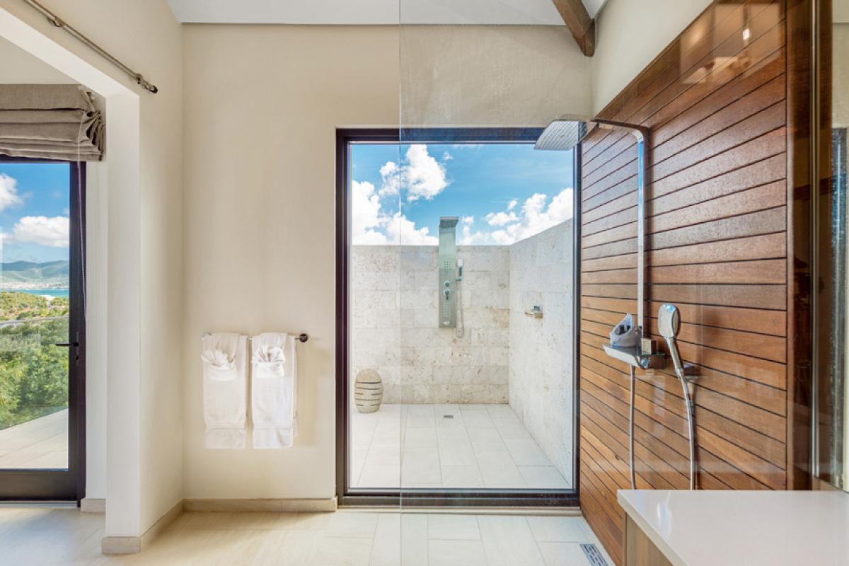 Amandara’s elegant gate opens to a long drive meandering past tropical plantings and decorative grasses. Arriving in the spacious courtyard, the minimalist façade and dramatic entrance dazzles with its stylish mix of exotic materials that continue into the interiors; soft cream travertine, dark woods and glass are used to perfection. Through solid glass doors, the stunning view greets you. Inside, panoramic vistas spans the great room like a master painting. The turquoise mosaic lined infinity pool creates a seamless visual transition from the interiors out to the sapphire sea, green mountains, Baie Rouge Beach and onto Marigot, Pic Paradis and the edge of Grand Case. It is a perfect place to watch the ever changing tropical sky.