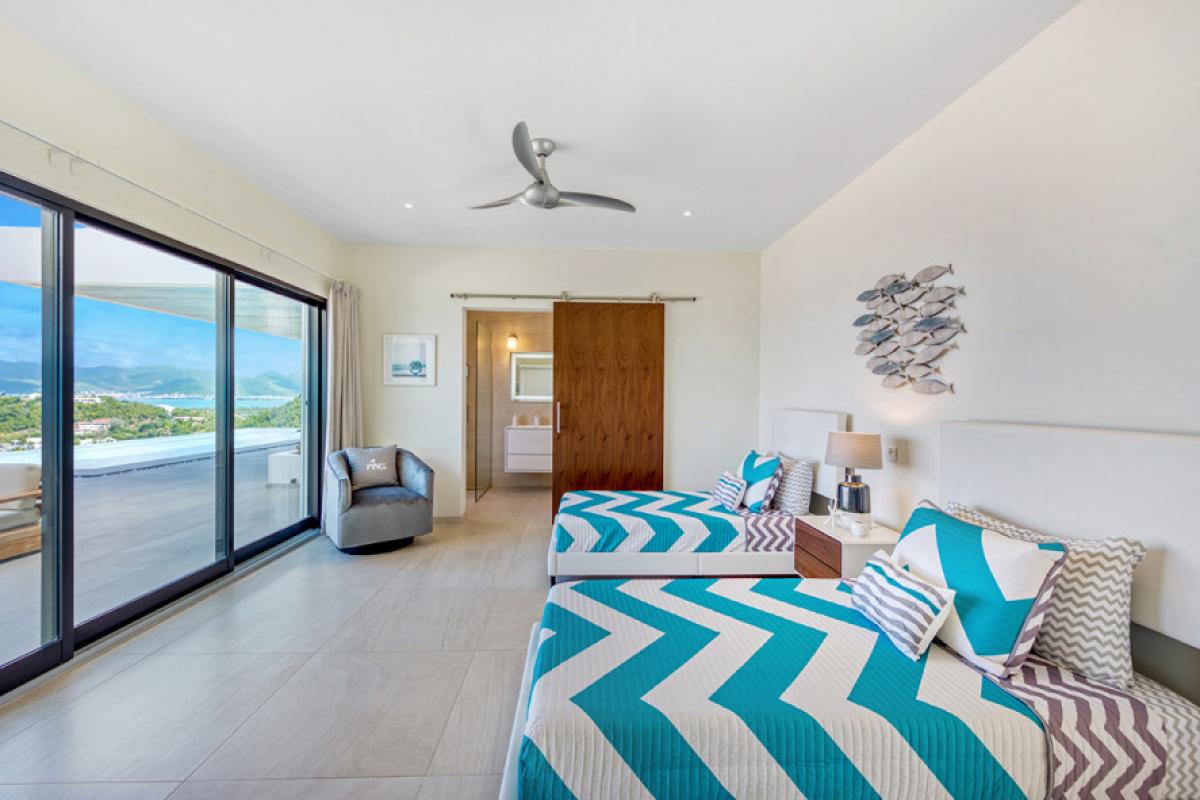 Bedroom 5: This room is equipped with two single-sized beds, an ocean view, a fan, air conditioning, a safe, and an ensuite bathroom.