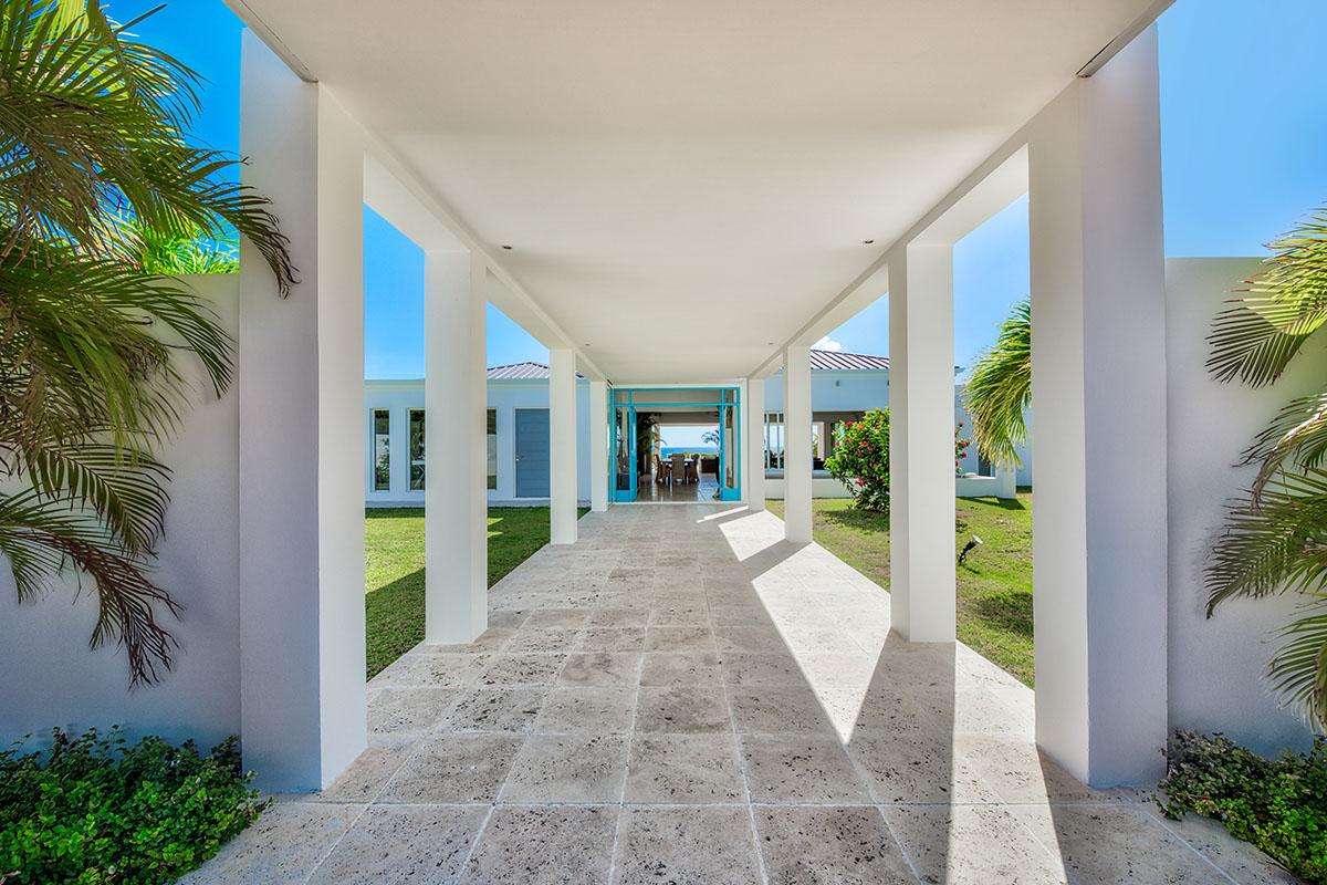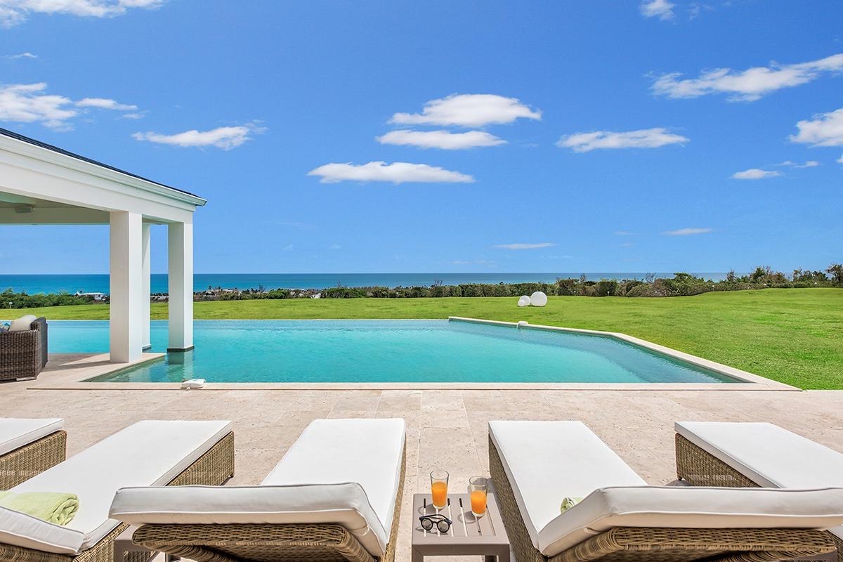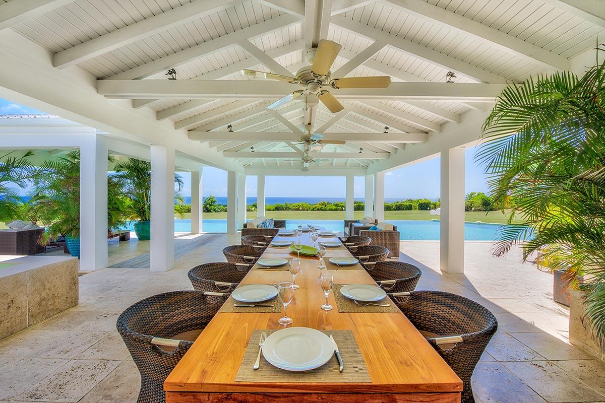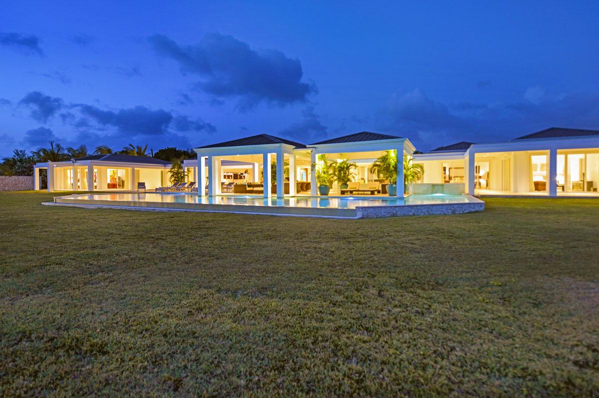 This extraordinary estate style villa enchants the moment you enter the gate. The long, palm-lined drive brings you to a large private courtyard and garden. Beyond the front door is a stunning house and one of the most dazzling oceans views on island. Panoramic vistas flow from every room and terrace. The colors are magical. An expansive stretch of sapphire sea is framed by the villa’s gardens and the rich blue sky. The large contoured pool edges overlap the lawn adding crystal blue tones to the scene.