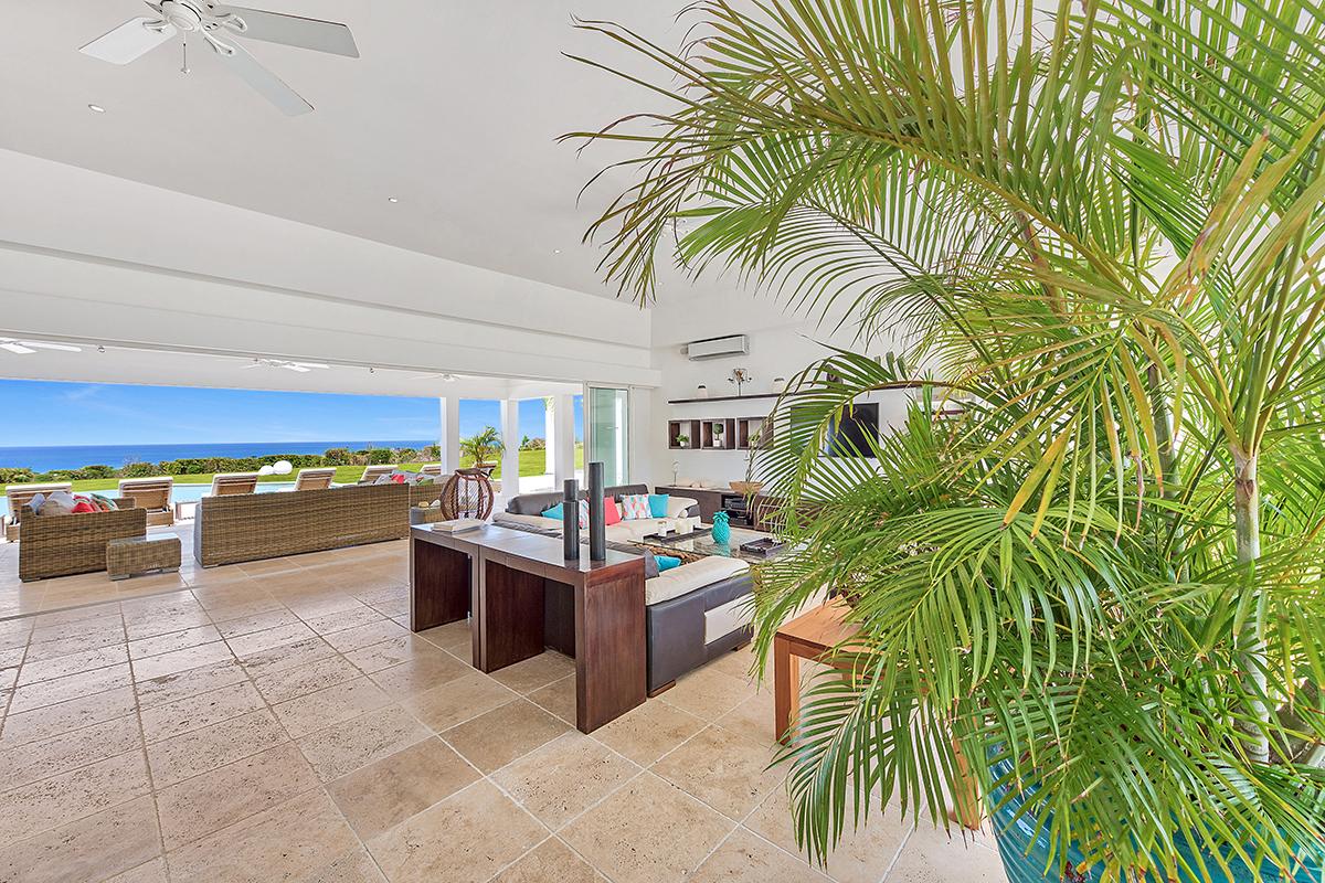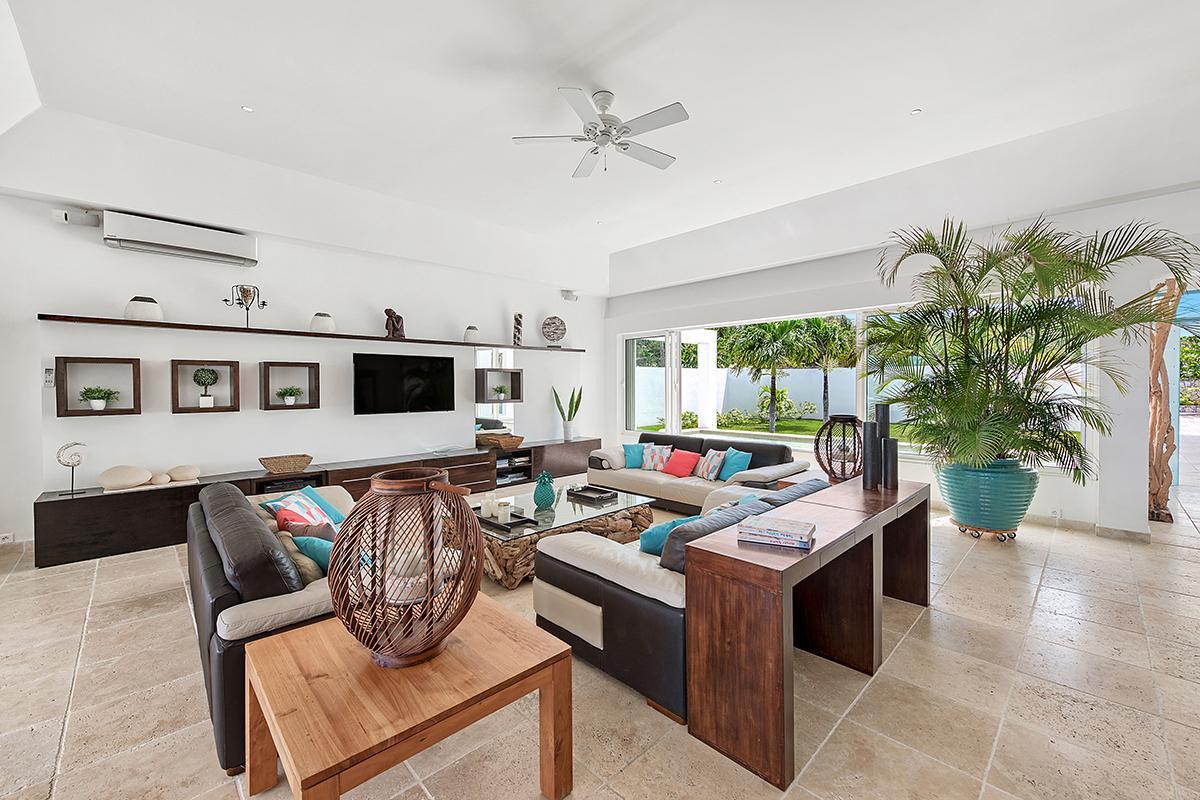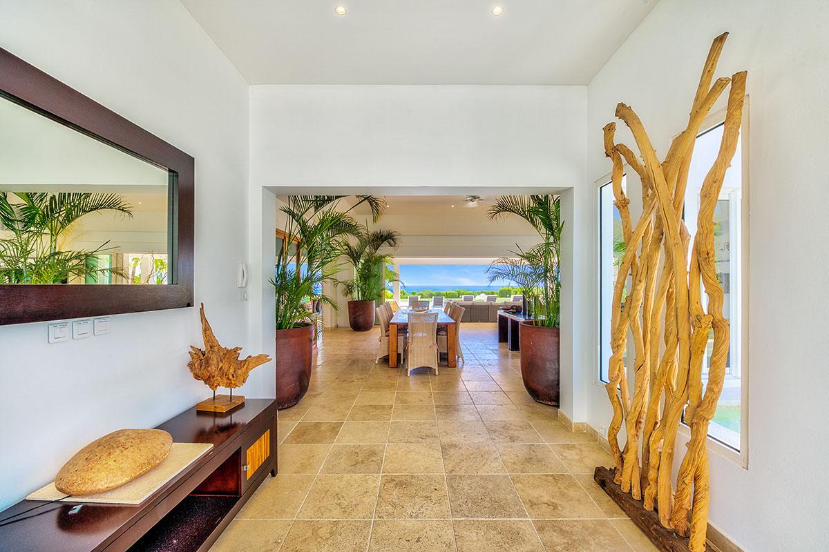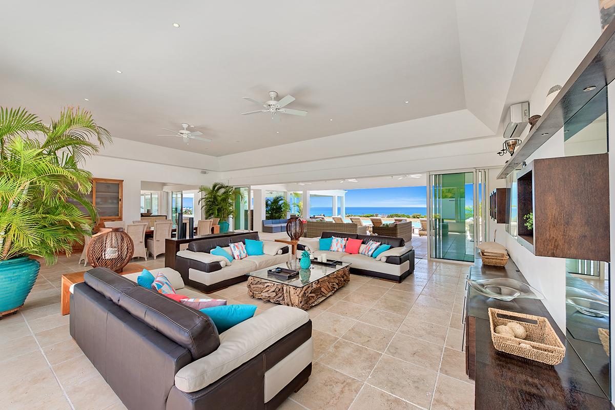 Ambiance is open, airy and spacious; a perfect villa for an extended family, weddings or company retreat. It has everything you need to enjoy the day from dawn until dusk. The overall décor is sleek, elegant and contemporary but never boring. The large interior living room, perfect for conversation or entertainment, tastefully mixes natural elements and rich tones; dark wood and teak, wicker, cream and pops of color. Pocket doors disappear into the walls enhancing the view. Although sea views and breezes abound, the great room is fully air conditioned.