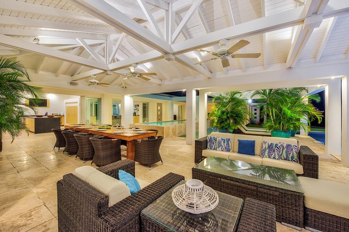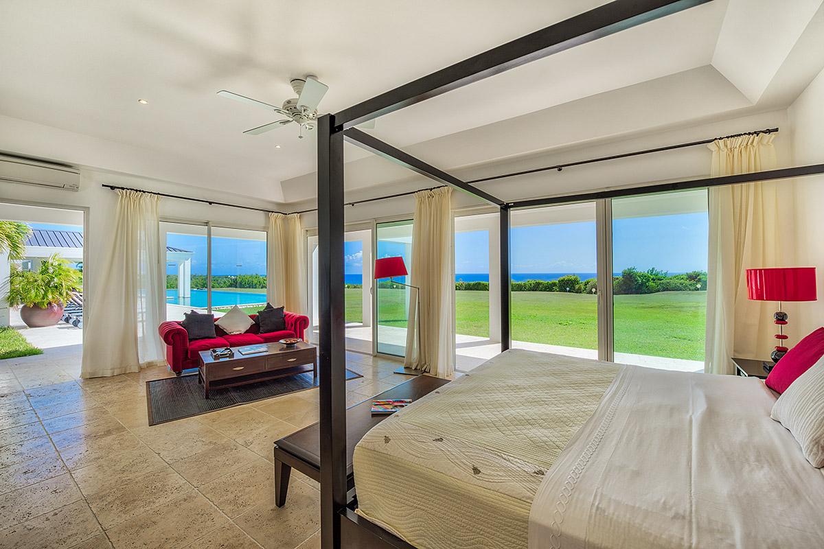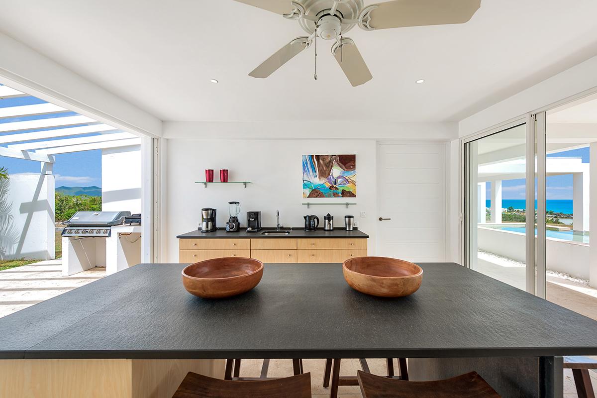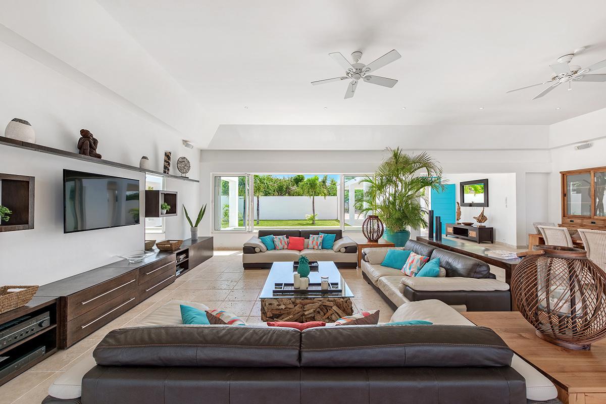 Ambiance is open, airy and spacious; a perfect villa for an extended family, weddings or company retreat. It has everything you need to enjoy the day from dawn until dusk. The overall décor is sleek, elegant and contemporary but never boring. The large interior living room, perfect for conversation or entertainment, tastefully mixes natural elements and rich tones; dark wood and teak, wicker, cream and pops of color. Pocket doors disappear into the walls enhancing the view. Although sea views and breezes abound, the great room is fully air conditioned.