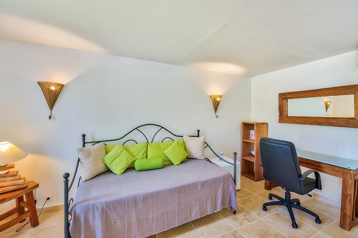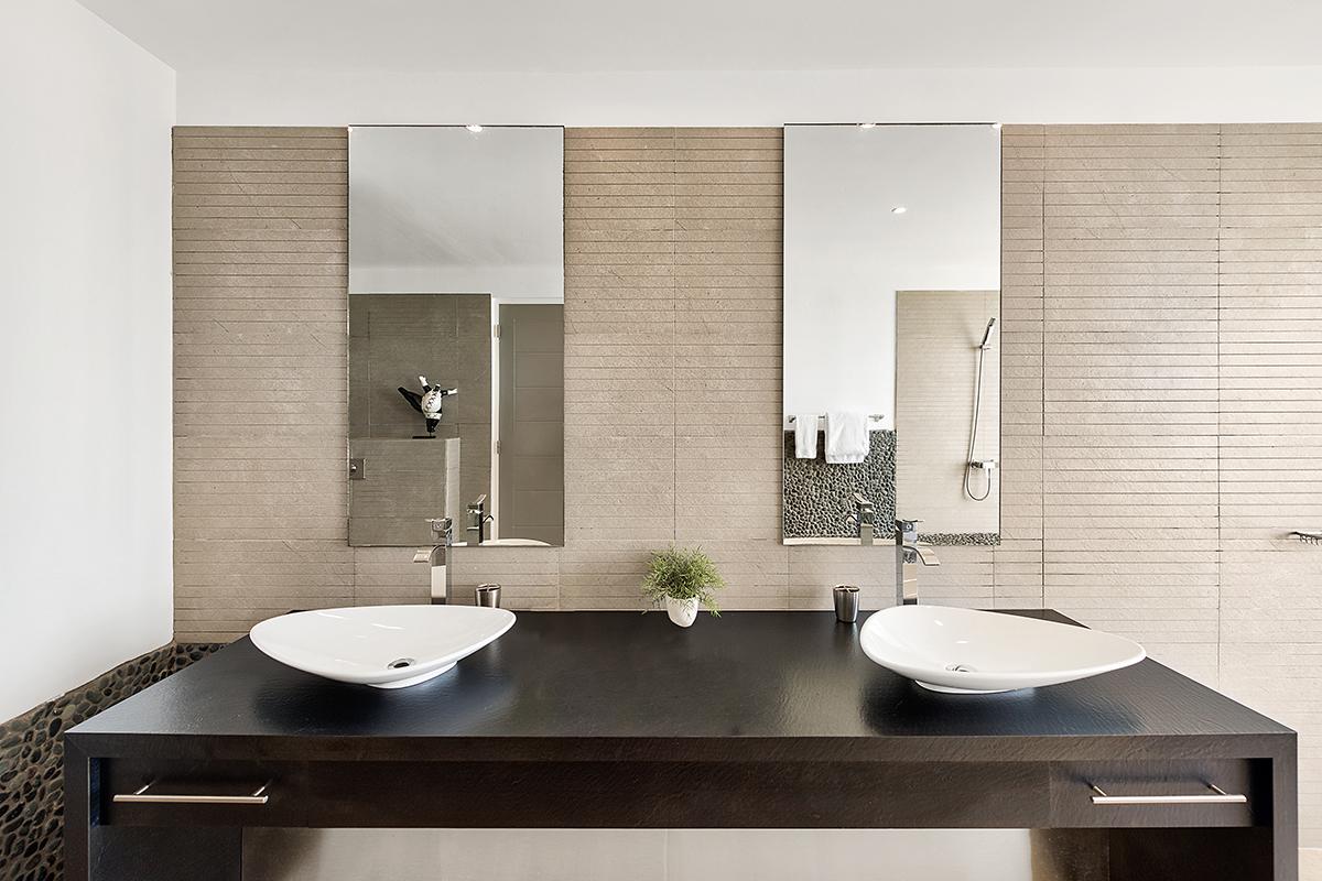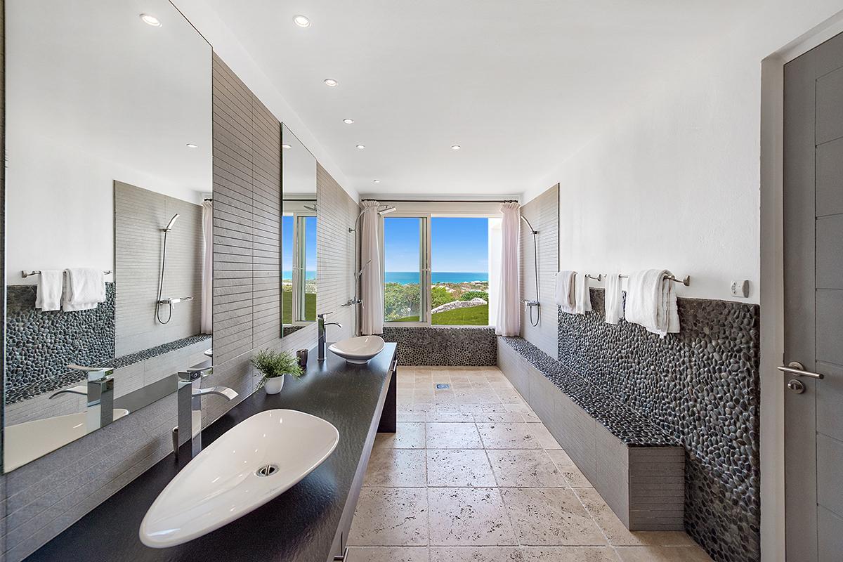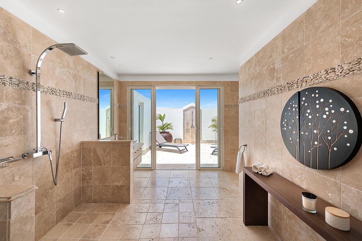 The four equal size bedrooms are spacious and comfortable. Two sit on each end of the villa. The décor creates a serene atmosphere blending designer touches and art; neutral tones of beige, brown, black or grey and white with individual pops of rich color. Each room has private seating, sea views and beautiful spa style bathrooms in travertine, stone and wood. Three bathrooms have private outdoor showers; one has a sea view.