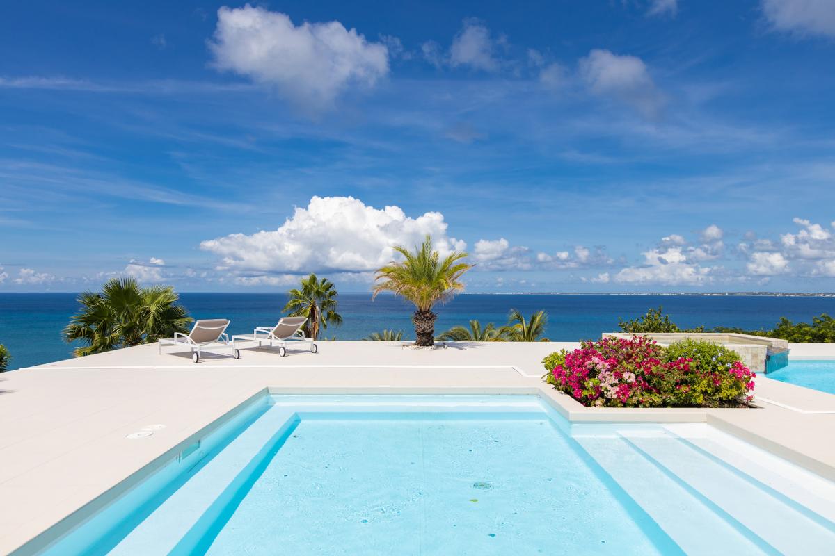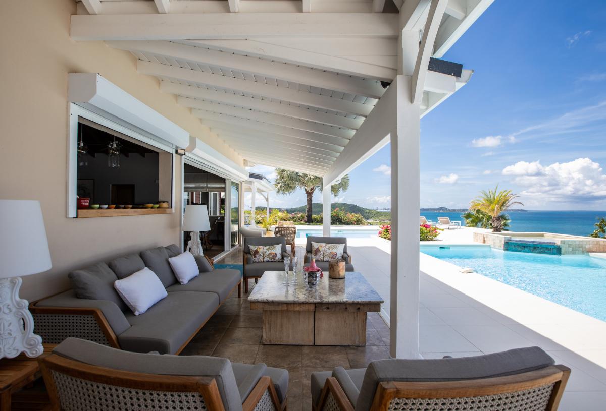 This contemporary yet exotic villa provides the best of stylish indoor and outdoor living. Expansive terraces, in sand color stone inset with tropical plants, create a perfect flow from indoor out to the sea. Center stage is the large main pool accented with an encased Jacuzzi. A smaller plunge pool creates a private little oasis. Covered terraces filled with elegant teak furniture provide comfortable spaces to gather for lounging and dining.