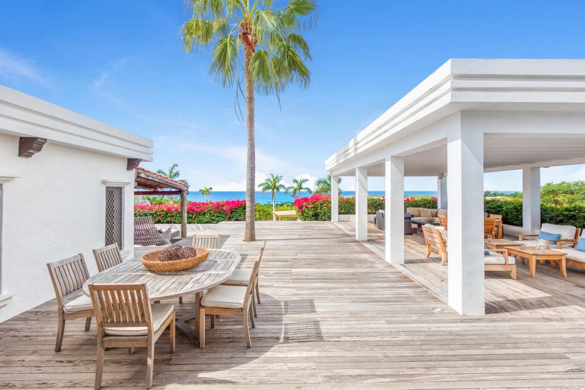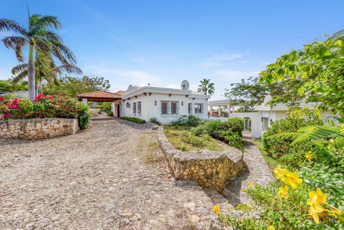 Hacienda is an elegant Spanish-Caribbean style villa designed to capture spectacular views and maximize outdoor living. The covered courtyard entrance with its Old World wooden doors, tiled floors and exotic plantings creates the perfect introduction to a stunning tropical view. Framed by royal palms and pink bougainvillea, the view is a panoramic vista filled with shades of blue from the sapphire sea to the deep blue sky; gorgeous in daytime; spectacular at sunset.