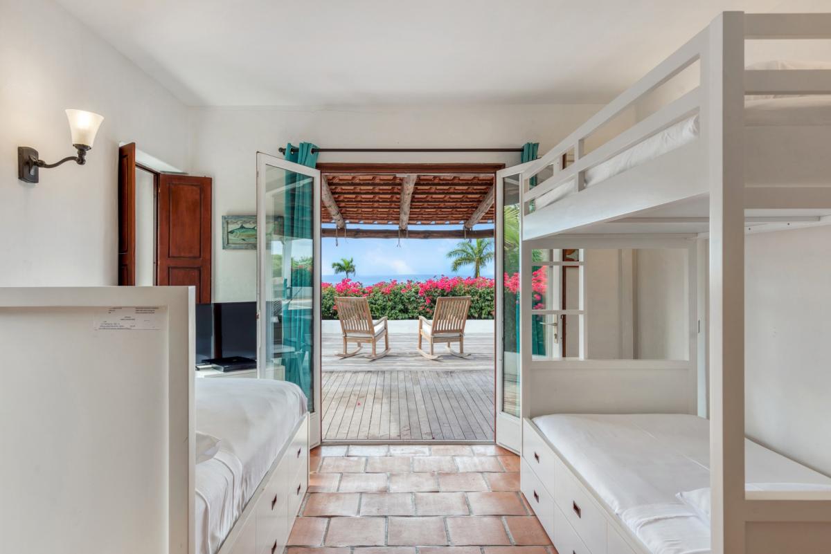 There are four bedrooms. Two are in private casitas off the upper deck. Spacious and comfortable, each room’s décor is a blend of serene whites and tans mixed with dark wood. Charming Spanish style shutters create privacy. Both casita bedrooms have sea and garden views as well as private patios. The gorgeous spa style bathrooms, with walk in showers, are designed in travertine accented with dark woods. Two additional bedrooms connect to the interior living space. It’s a wonderful set up for children. One room has bunk beds. The adjacent room has a king bed. The two share a spa style bathroom.