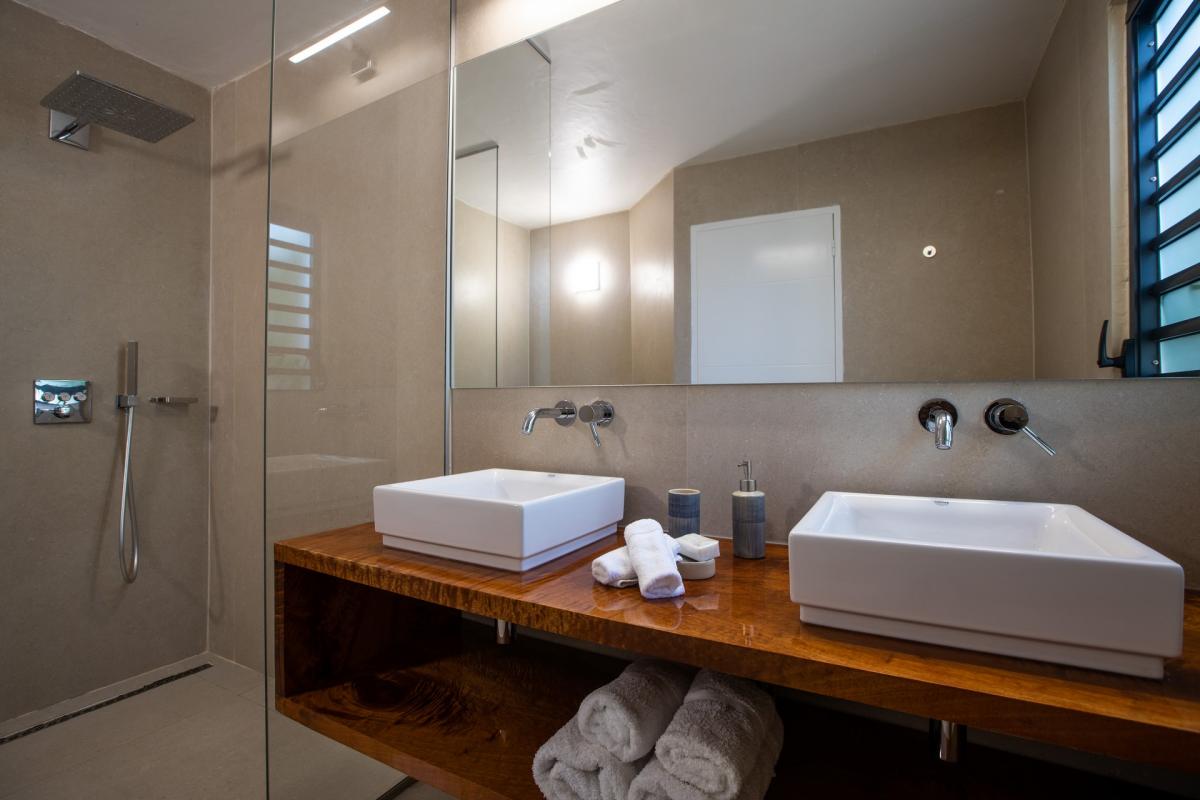 The central feature of this villa is a large pool with beach-style access surrounded by an extensive terrace with intimate seating areas and a glass-walled dining area. A spacious open-plan living area attractively furnished in bright Caribbean colours gives the whole interior an established air of tropical good taste. Opening onto the pool terrace are 3 pleasantly furnished bedrooms with adjoining Mexican tiled colourful bathrooms. Two more bedrooms are to be found on the lower level enjoying views out onto the lush tropical gardens.