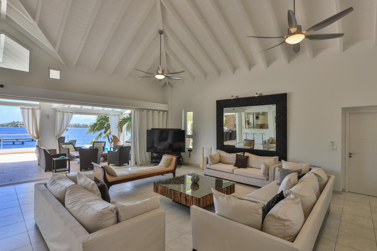 Villa Abracadabra is a luxurious property located in the exclusive Aquamarina area of Saint Martin, offering breathtaking views of the lagoon from its private dock. This St. Martin villa features five spacious bedrooms, four of which have lagoon views, dressing rooms, and ensuite bathrooms, while the fifth also offers an ensuite bathroom. Each bedroom is equipped with a Smart TV, ensuring comfort and entertainment for all guests. The living room opens to a covered terrace overlooking the lagoon and is equipped with fans, providing a cool and relaxing atmosphere. The large, fully fitted kitchen also offers stunning views, making it a perfect spot for cooking and socializing.