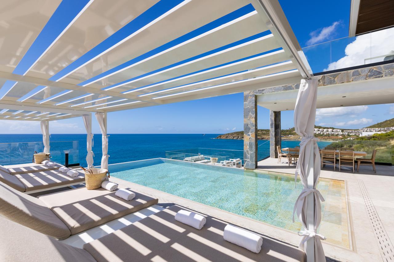 Villa Aqua Vista is a 6-bedroom, multi-level St. Martin villa rental near Indigo Bay. This villa offers sleek lines and sophicated architecture with minimalist design and modernity. With expansive windows and an open-concept, panoramic views of the Caribbean Sea highlight the beauty of this location. The six bedrooms are designed to deliver comfort and tranquility using neutral hues and top-tier furnishings, complementing the villa's contemporary aesthetic.