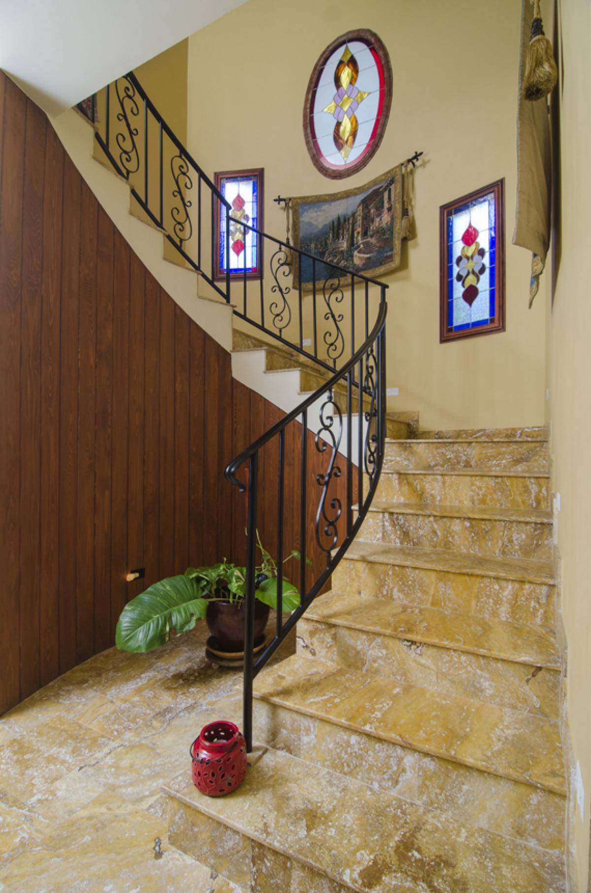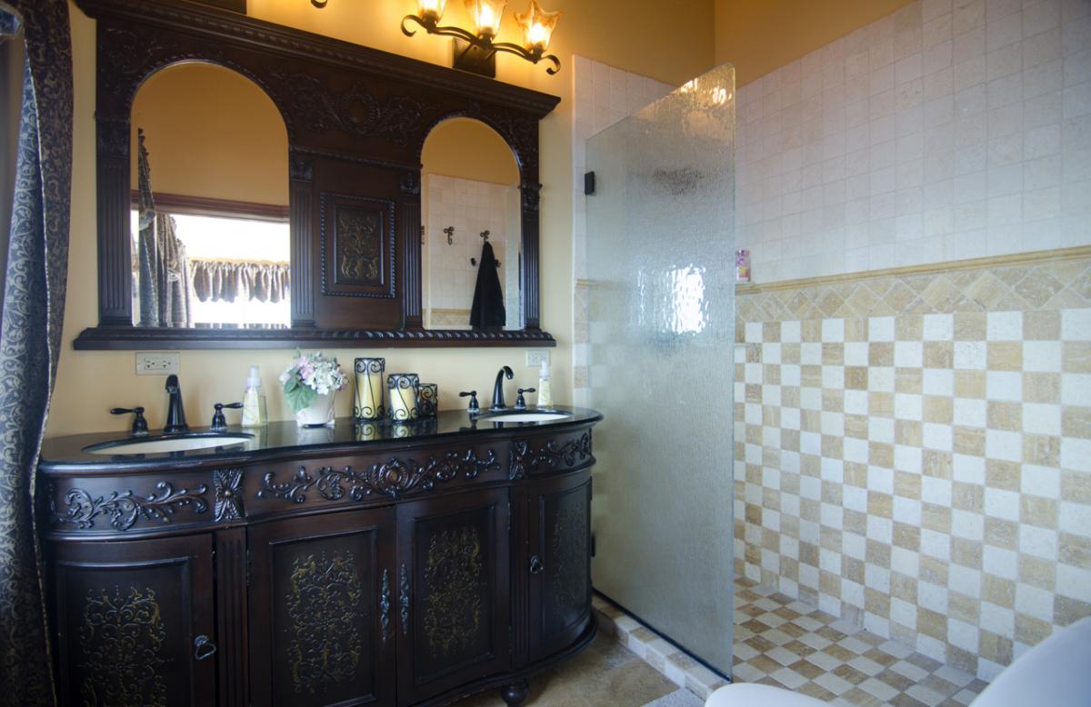 The fabulous down-island view includes 850-acre unspoiled Guana Island, Great Camanoe, The Dogs and Virgin Gorda. On a clear night you can even see the lights of Anegada. The sugar white sands of Josiah’s Bay are off to the right, and Rogues Point to the left. The main floor of the house has a full kitchen with granite countertops, formal dining room, living room with entertainment center, and laundry; go up the stair tower to the office and master bedroom. European craftsmen were flown in to install the Romanian tile that flows through the villa inside and out.