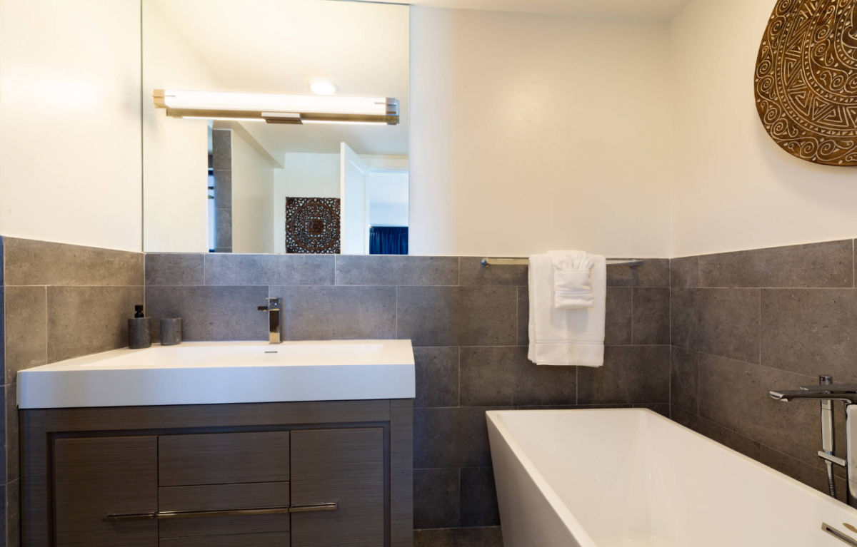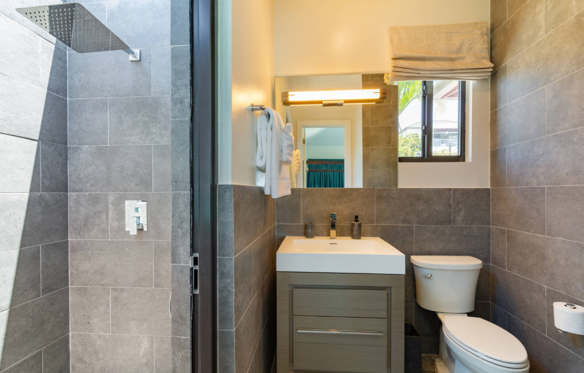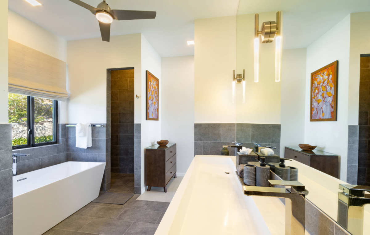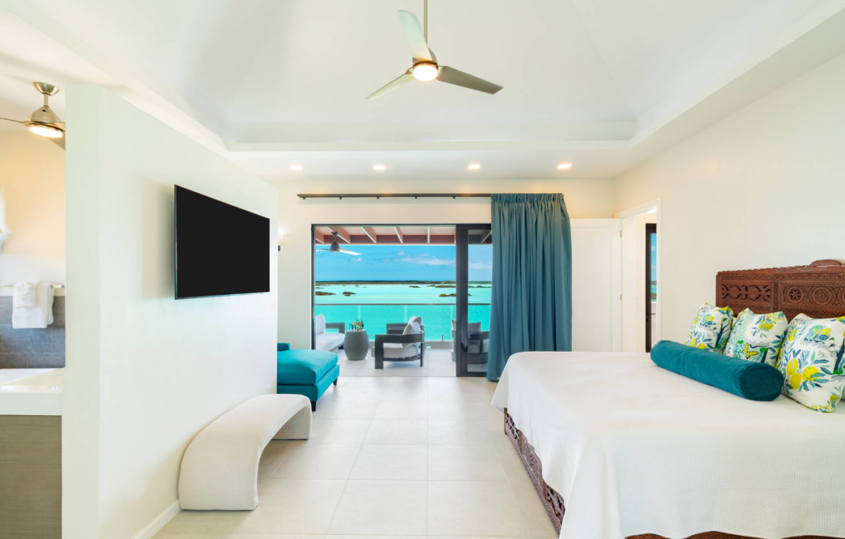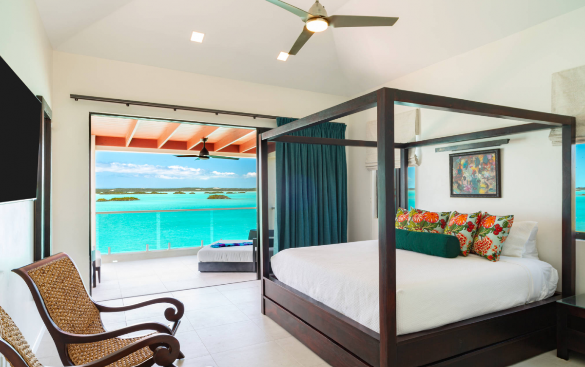 Above Rocks is a stunning Turks and Caicos villa set on the serene shores of Chalk Sound Lagoon in Providenciales. This modern four-bedroom retreat blends contemporary elegance with the island’s natural beauty, offering a perfect setting for a Turks and Caicos vacation. The main house includes two spacious bedrooms, while a separate guest house provides two additional bedrooms, ensuring both togetherness and privacy for families or groups. Each bedroom comes with its own en-suite bathroom, creating a comfortable and luxurious stay.