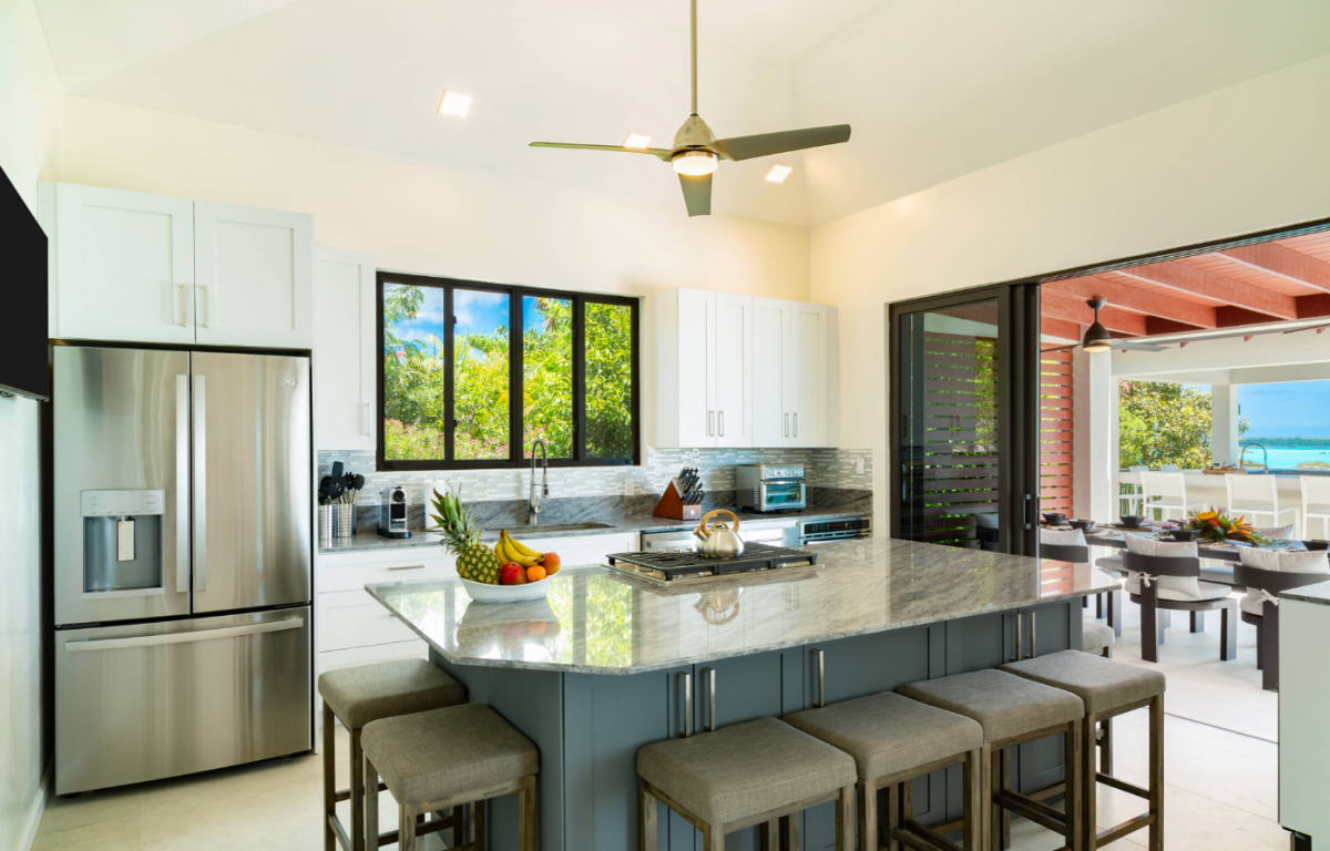 Outdoors, the villa’s design makes the most of its breathtaking location. Guests can unwind in a lagoon-front cabana, soak up the sun on the lounging deck, sway in hammocks, or gather around the firepit for stargazing at night. For those seeking adventure, this Turks and Caicos villa rental also provides complimentary kayaks and paddleboards to explore the turquoise waters, nearby islands, and secluded coves. Above Rocks offers the ideal balance of relaxation, comfort, and island exploration.